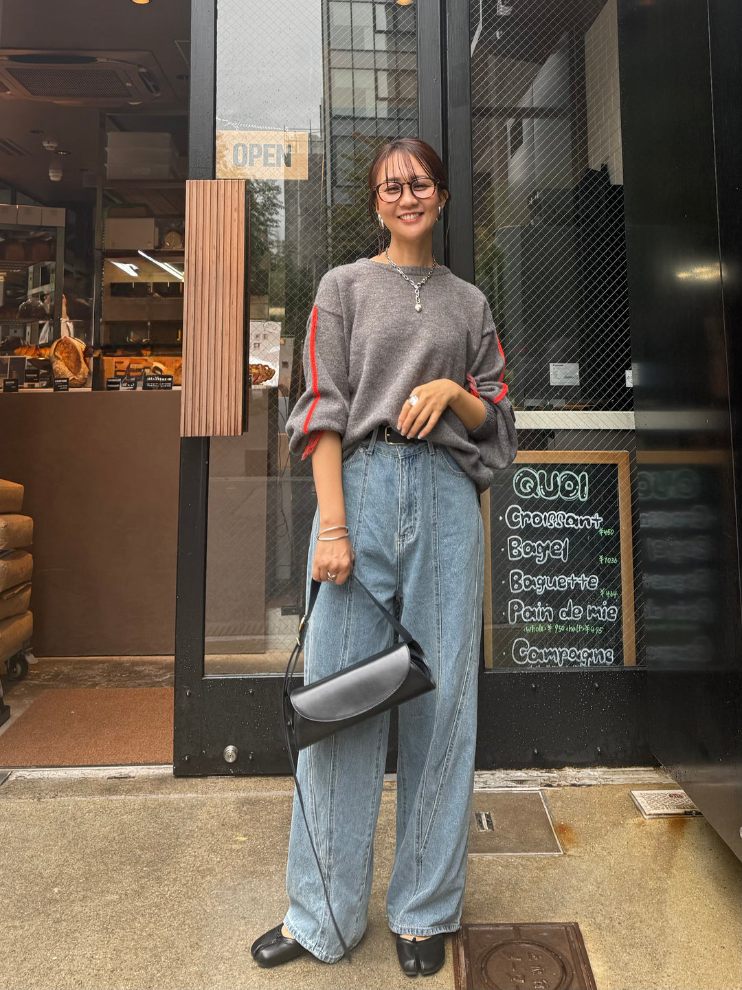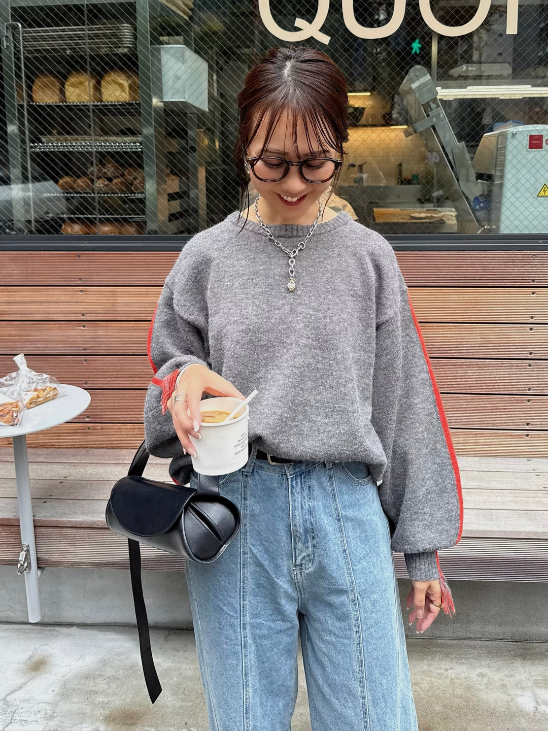 【予約】[SET] アルパカタッチ配色ラインプルオーバー / チャコール + 切替えストレートデニムパンツ / ブルー(12月中旬発送予定)