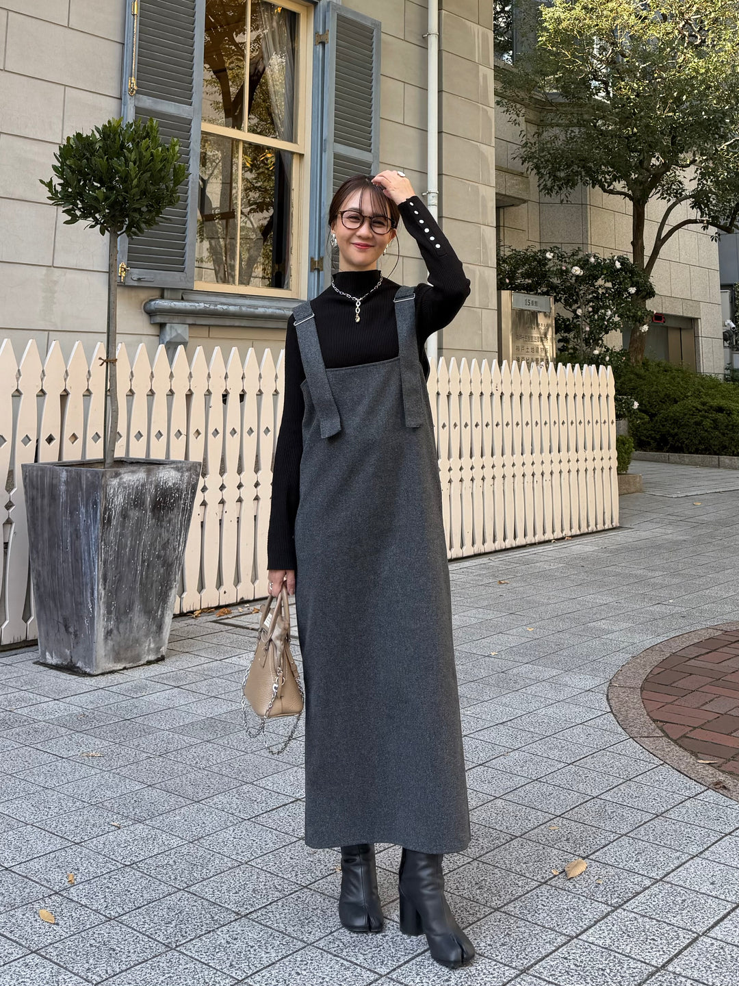 【予約】[SET] ウールライクVネックジャンパースカート / チャコール + 袖ボタンハイネックニット / ブラック(1月上旬発送予定)