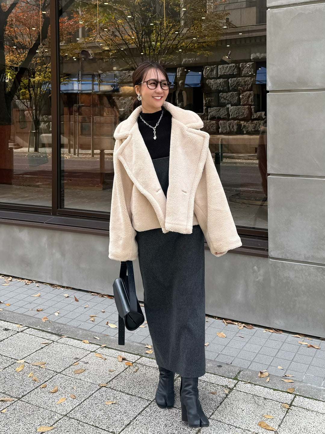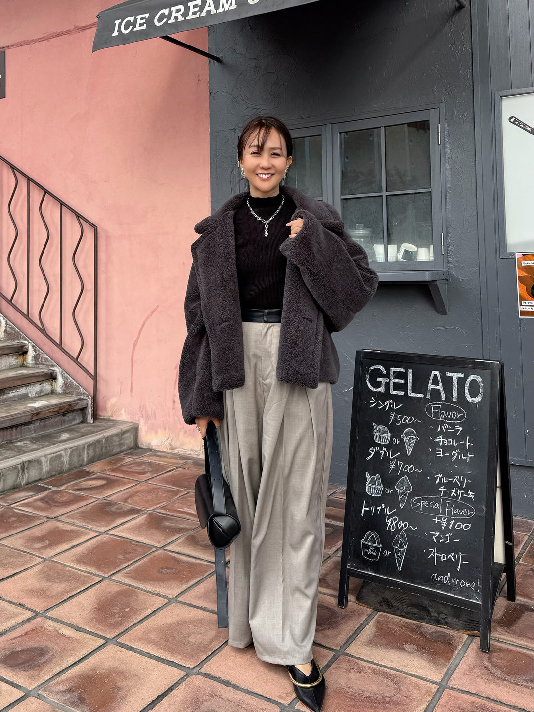 【予約】[3点SET] ボアショートコート / チャコールグレー + 袖ボタンハイネックニット / ブラック + ツイルタックパンツ / グレージュ(12月中旬発送予定)