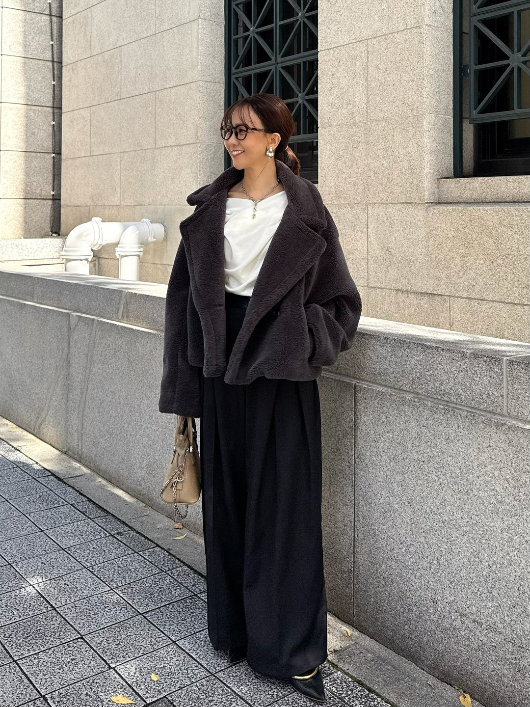 【予約】[3点SET] ボアショートコート / チャコールグレー + 起毛ドレープロングTシャツ / ホワイト + ツイルタックパンツ / ブラック(12月中旬発送予定)