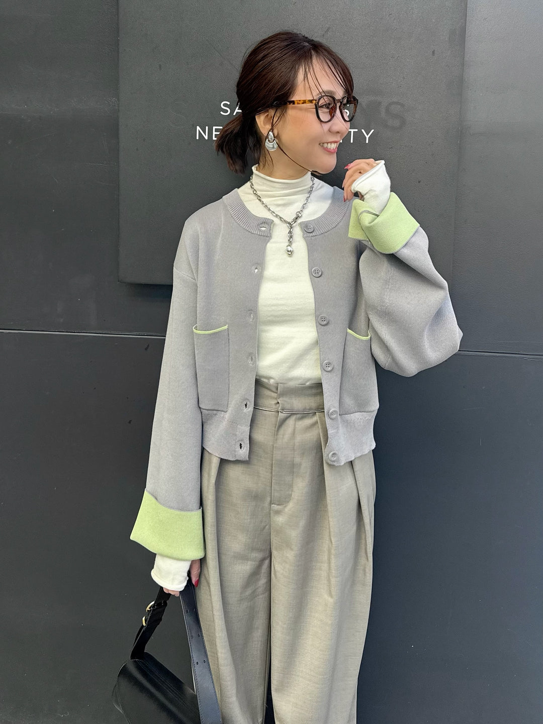 【予約】配色ダブルフェイスカーディガン / グレー×ライム(3月上旬発送発送予定)