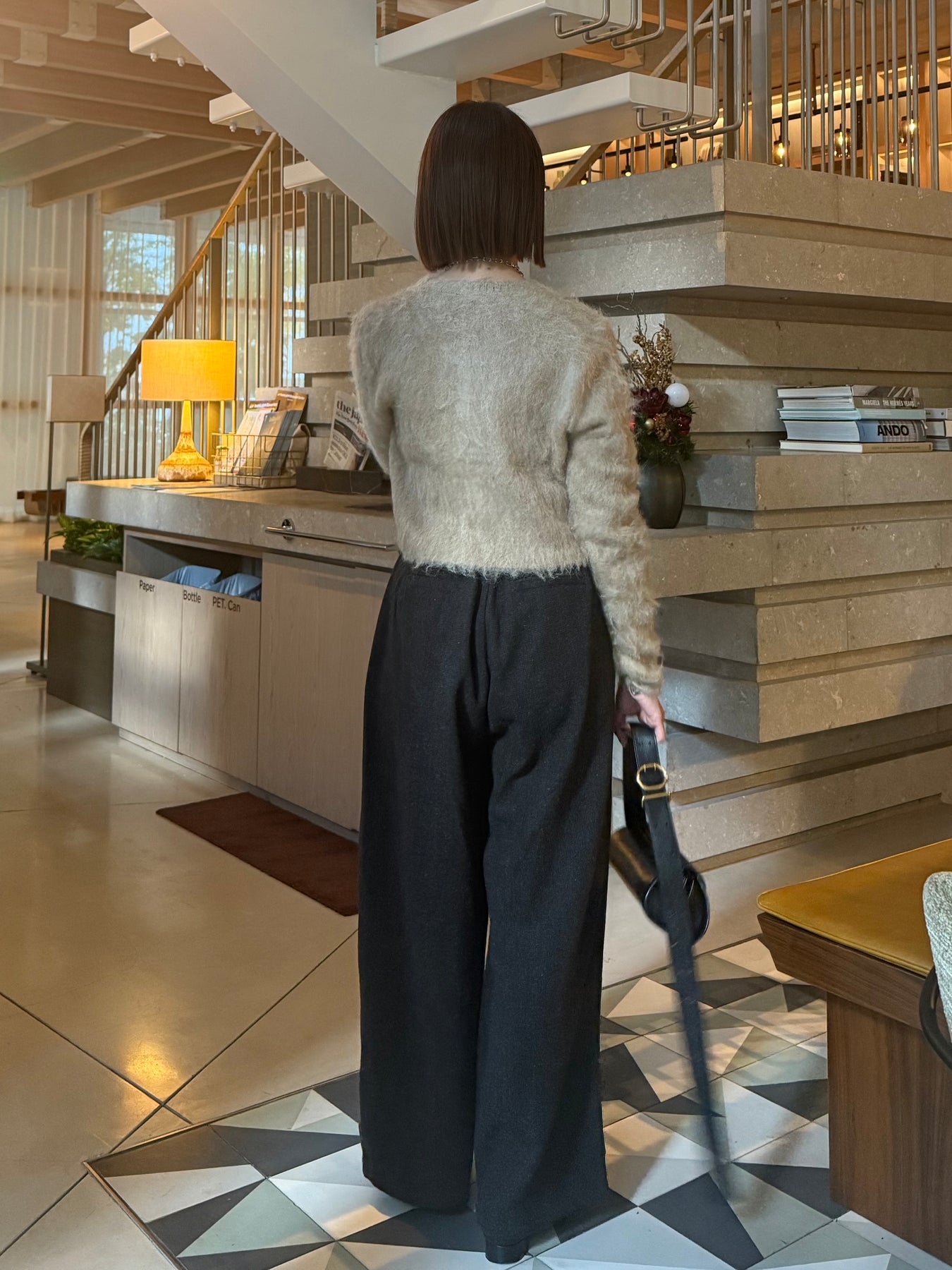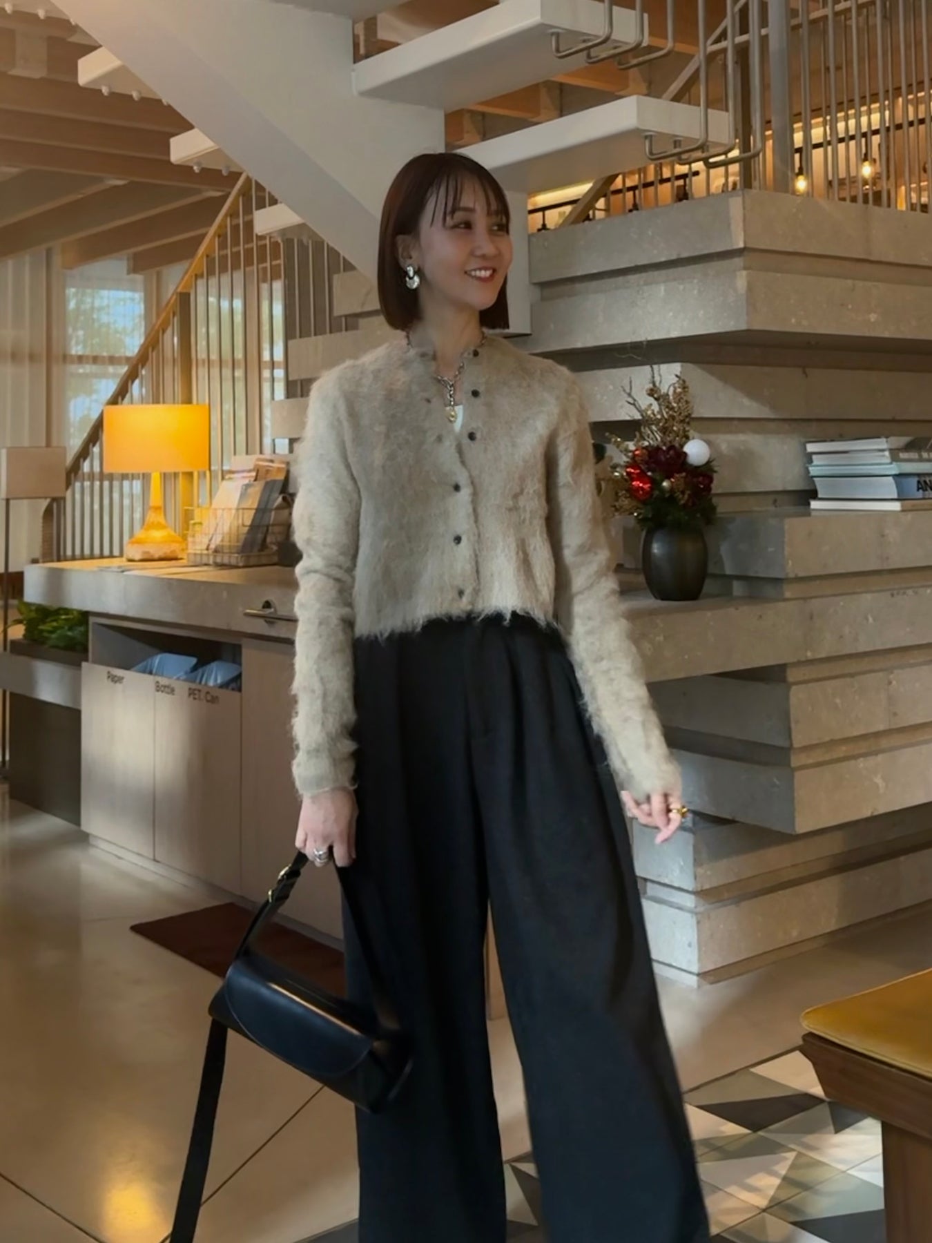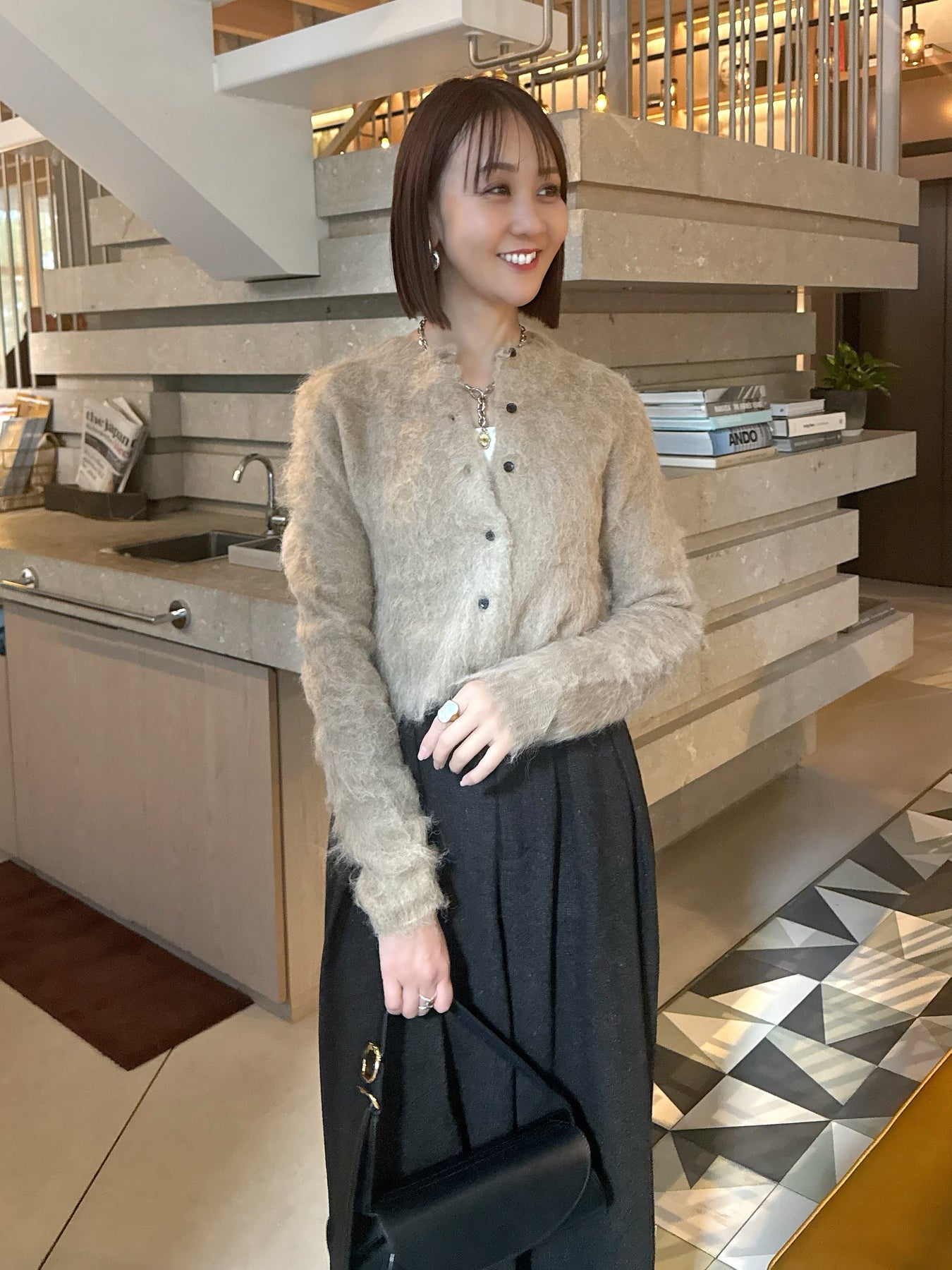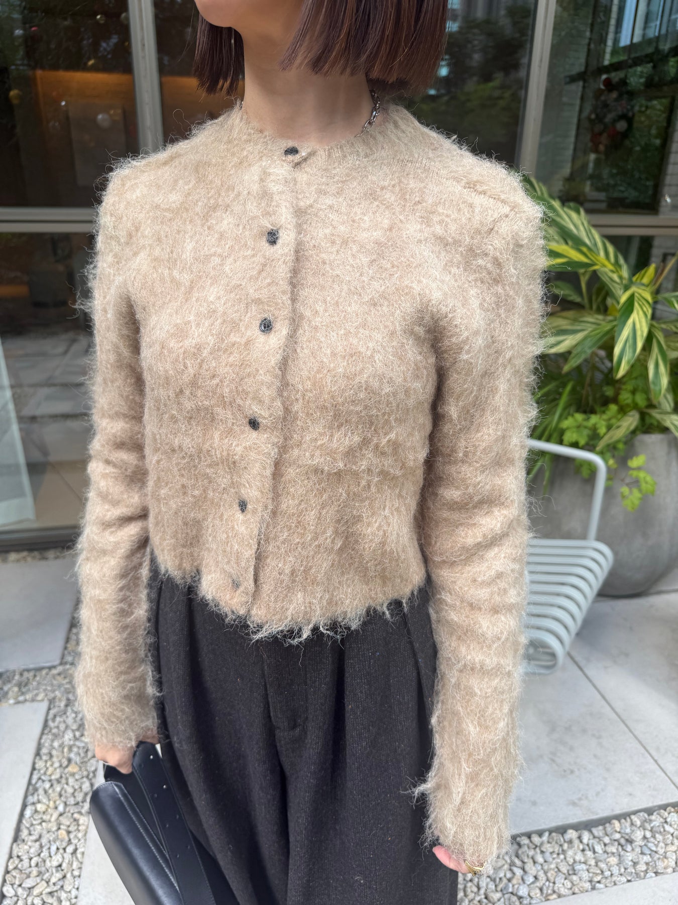 フワフワとした毛足のある素材感が可愛いモヘアタッチのカーディガン。ベージュにブラックのボタンが大人っぽく、ショートの丈感が色々なボトムとも相性の良いアイテムです。身頃もすっきりとしたデザインなので、上品見えする1枚。コートのインナーにもすっきりと着用いただけます。
