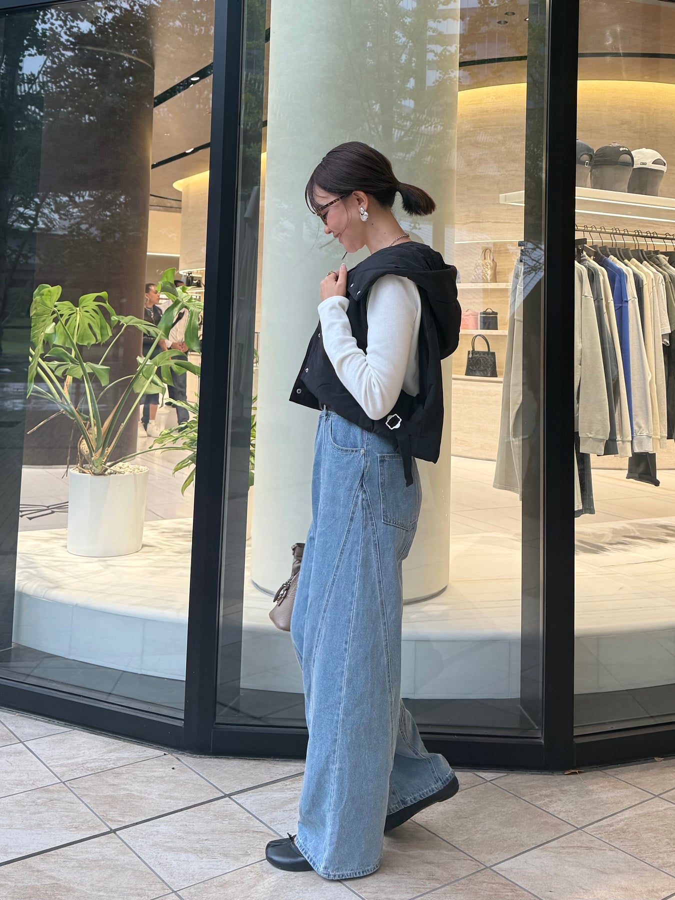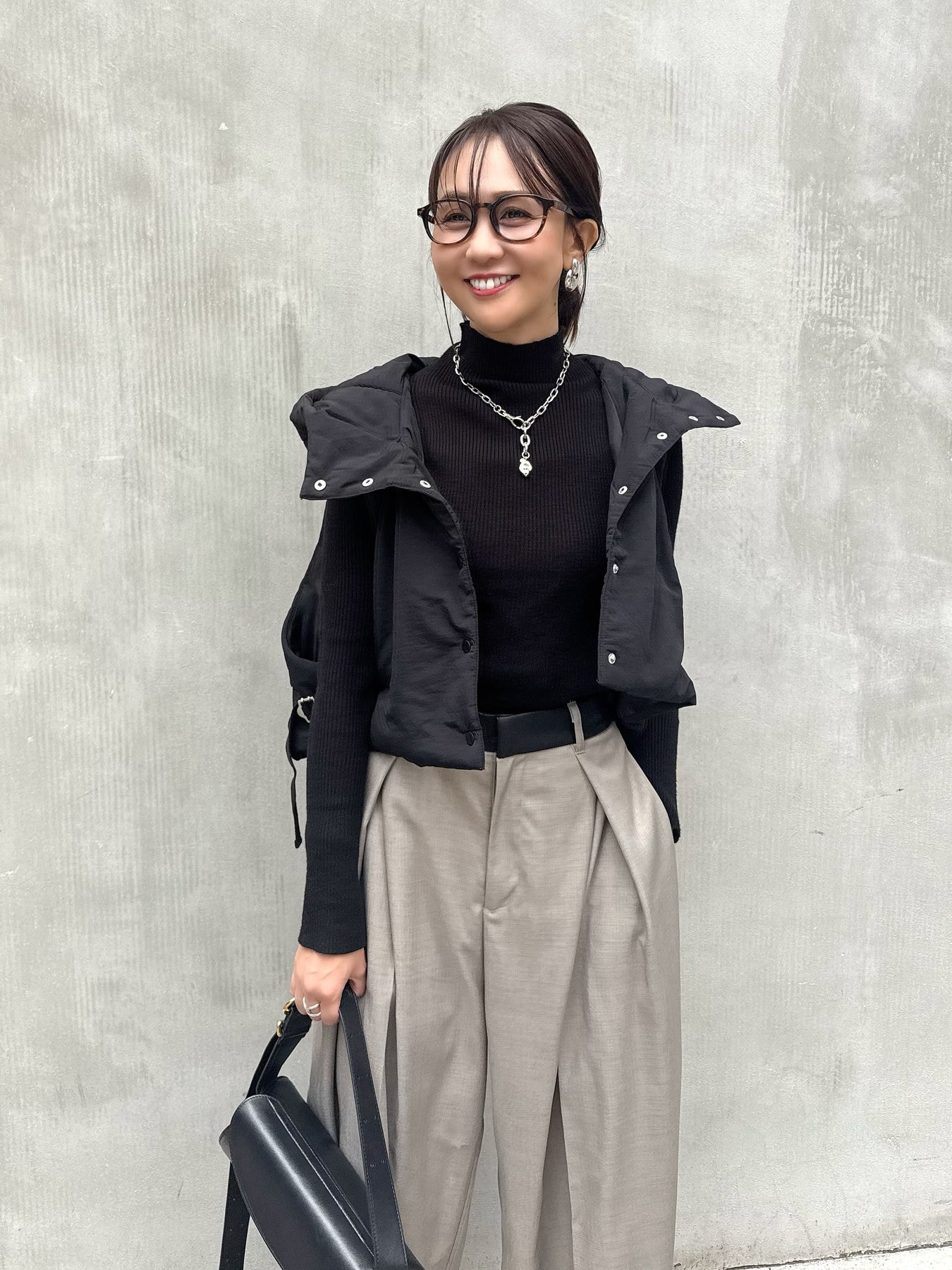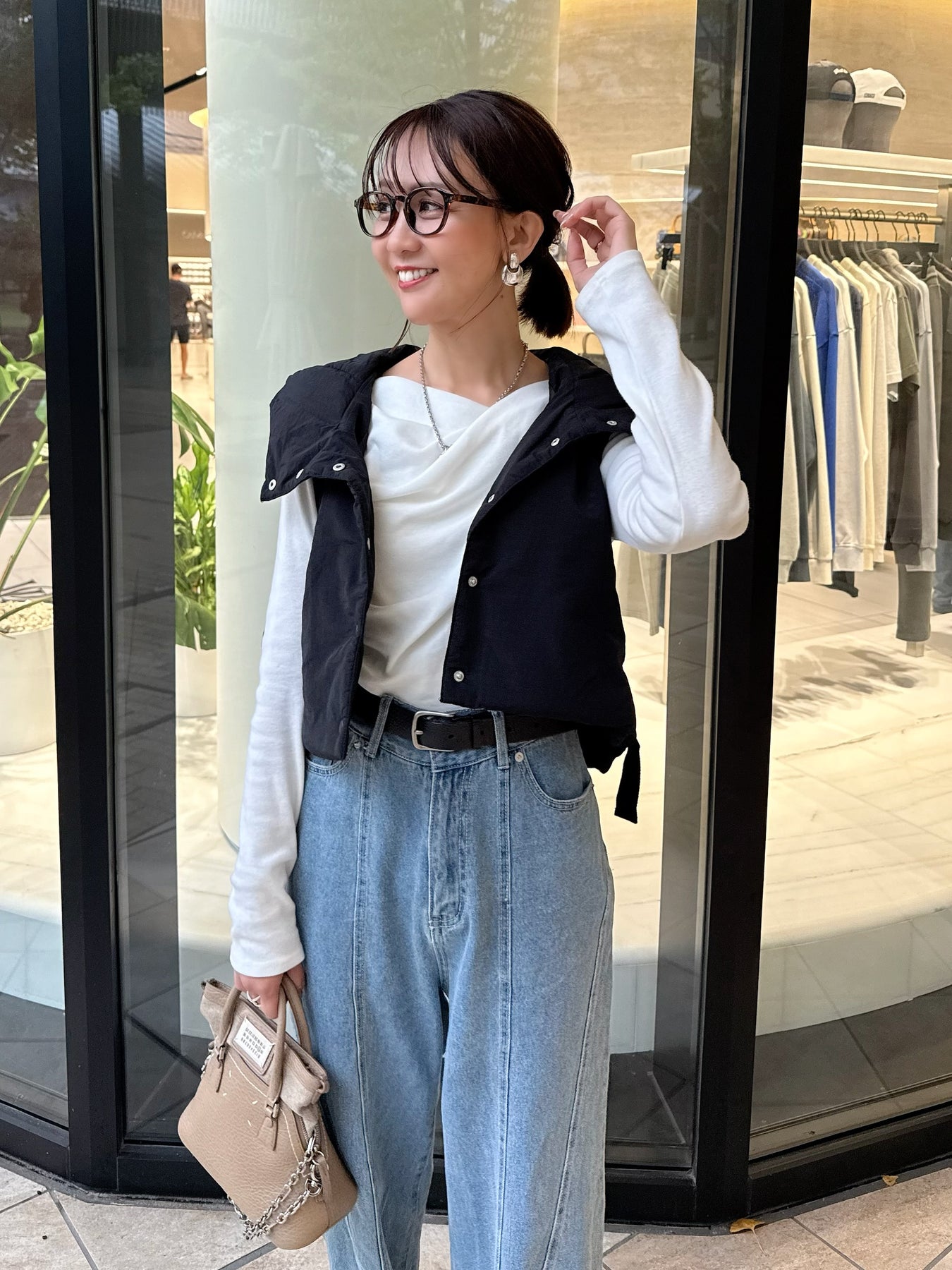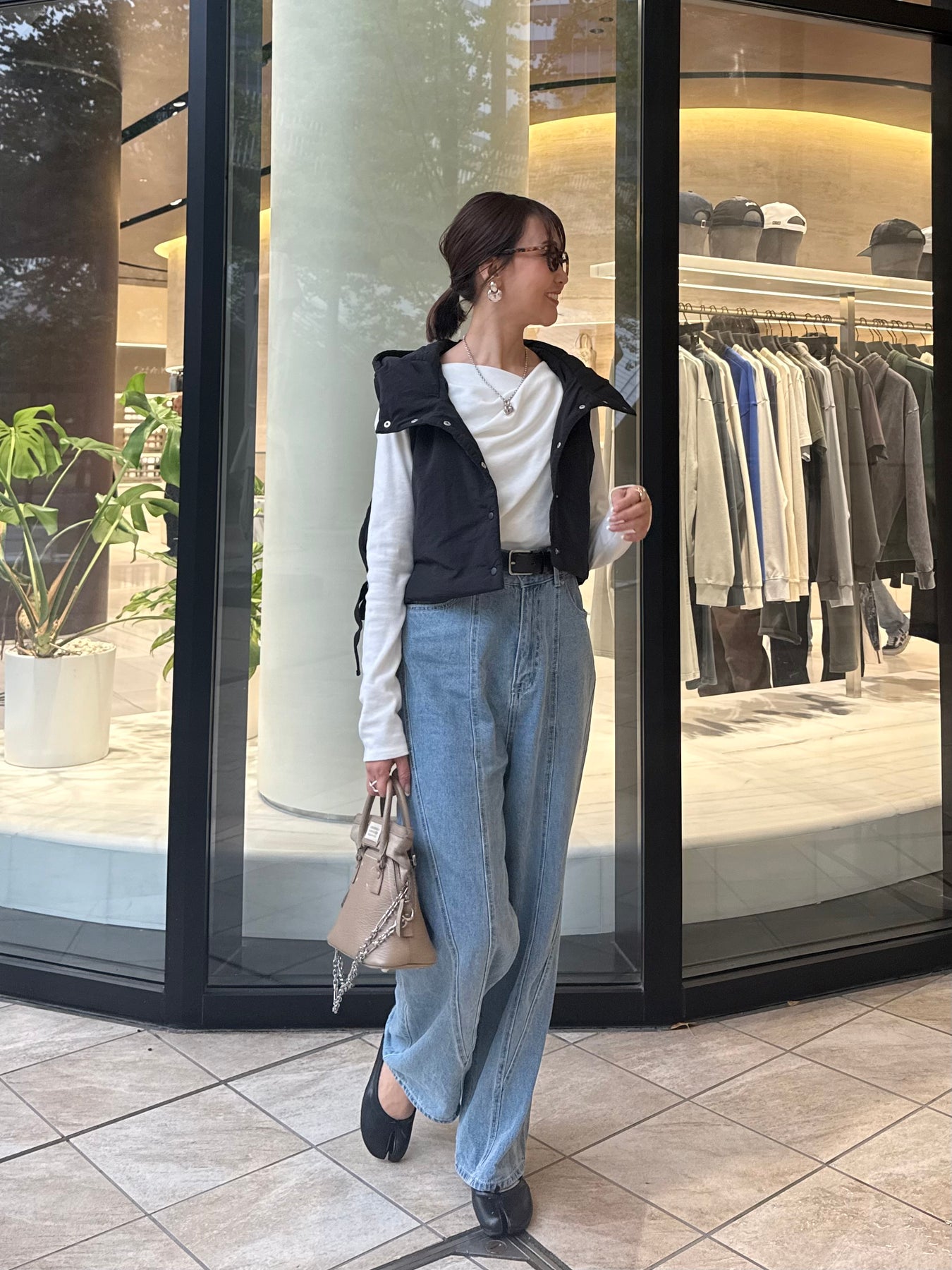 短めの丈感は、ワイドパンツなどとの相性もバツグンです。両脇下にベルトがついているので、調整も可能です。