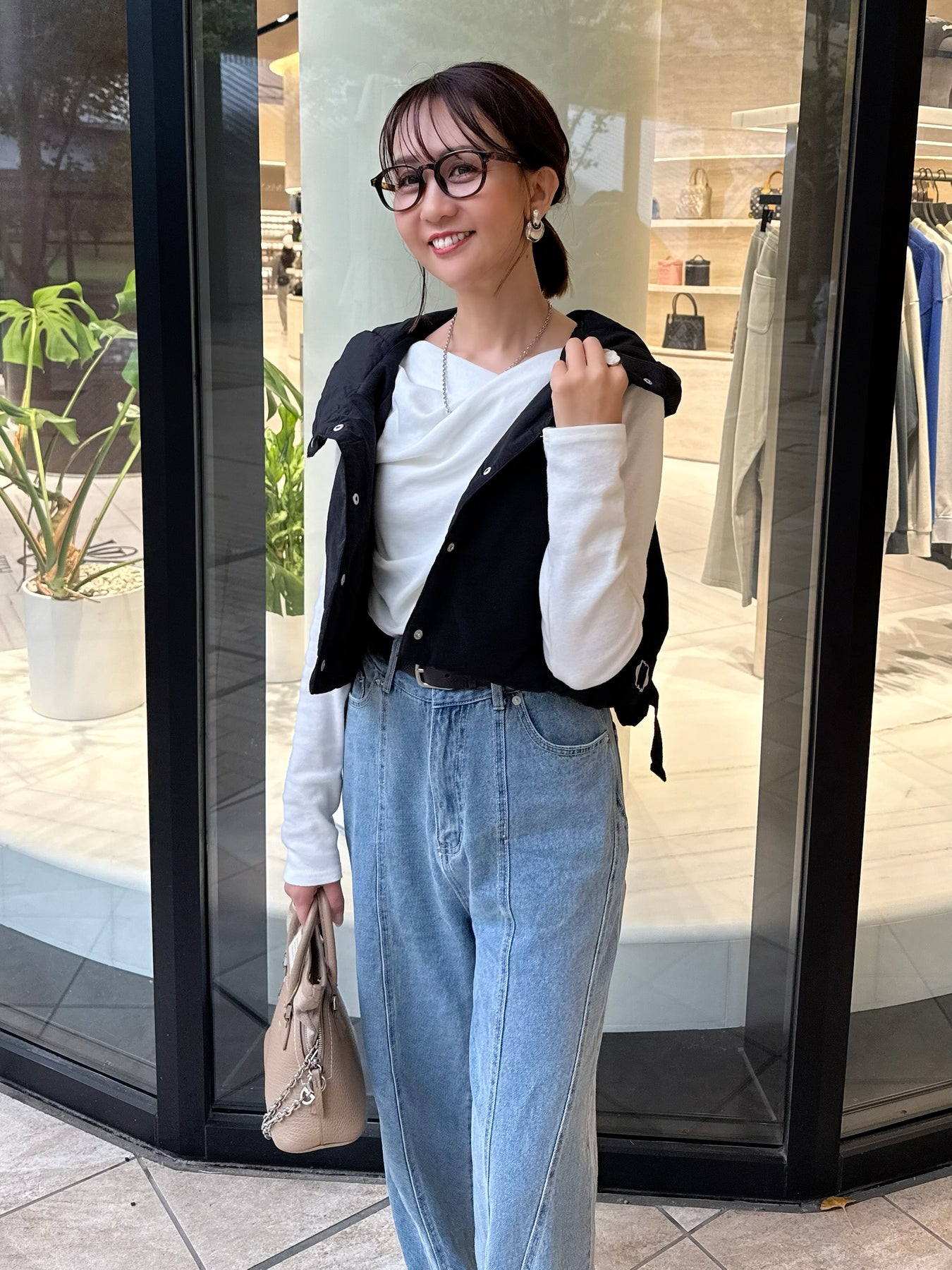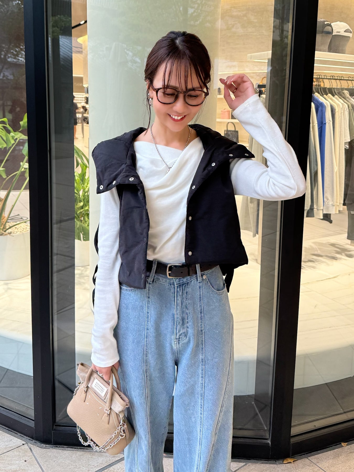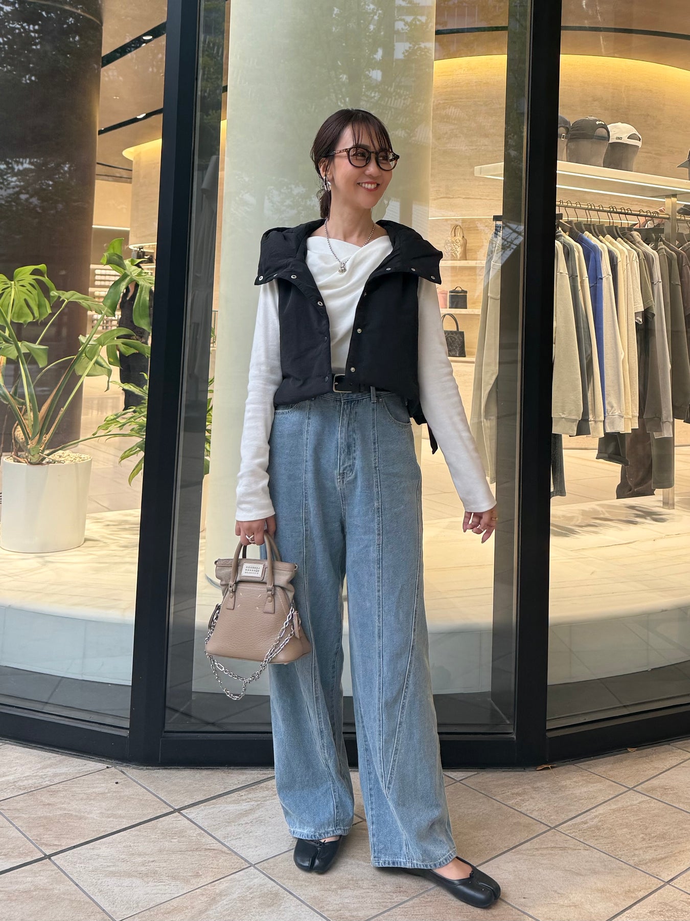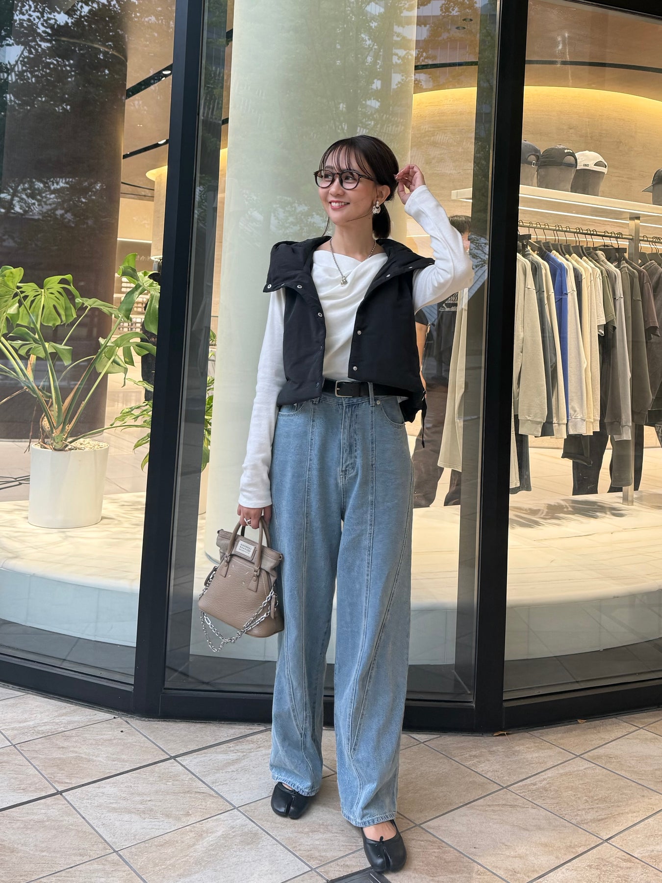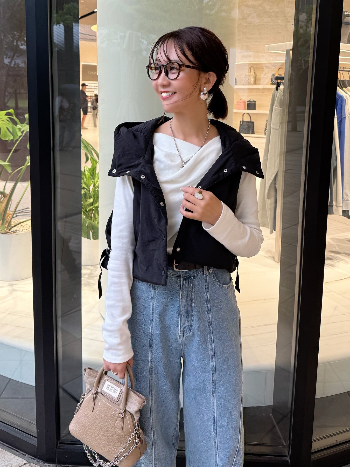 短めの丈感は、ワイドパンツなどとの相性もバツグンです。両脇下にベルトがついているので、調整も可能です。