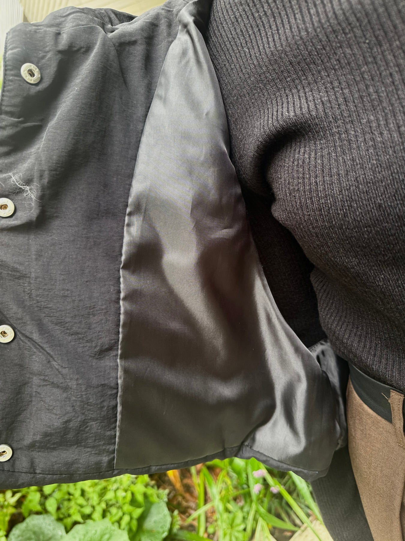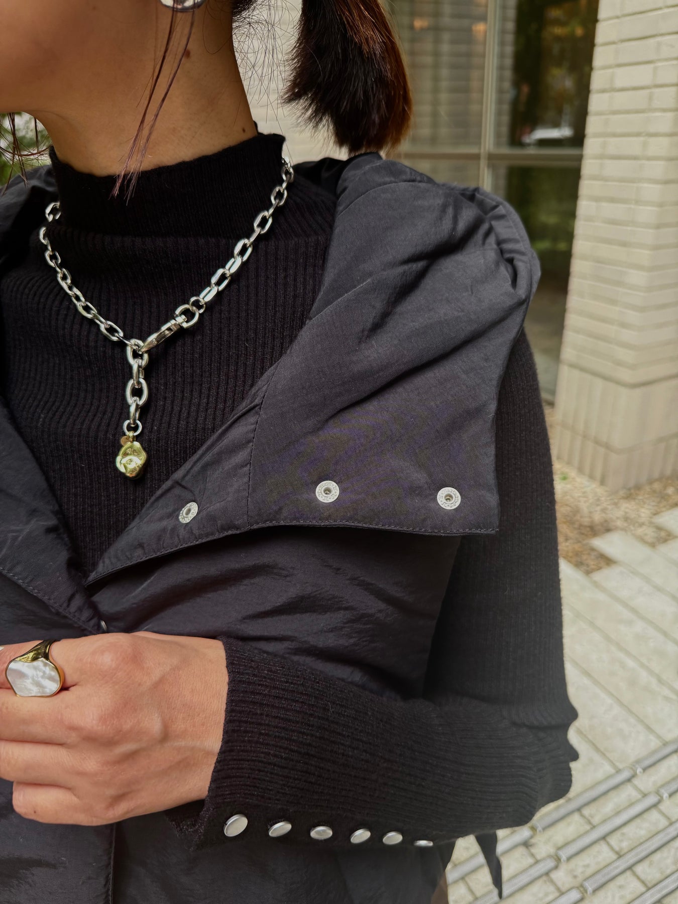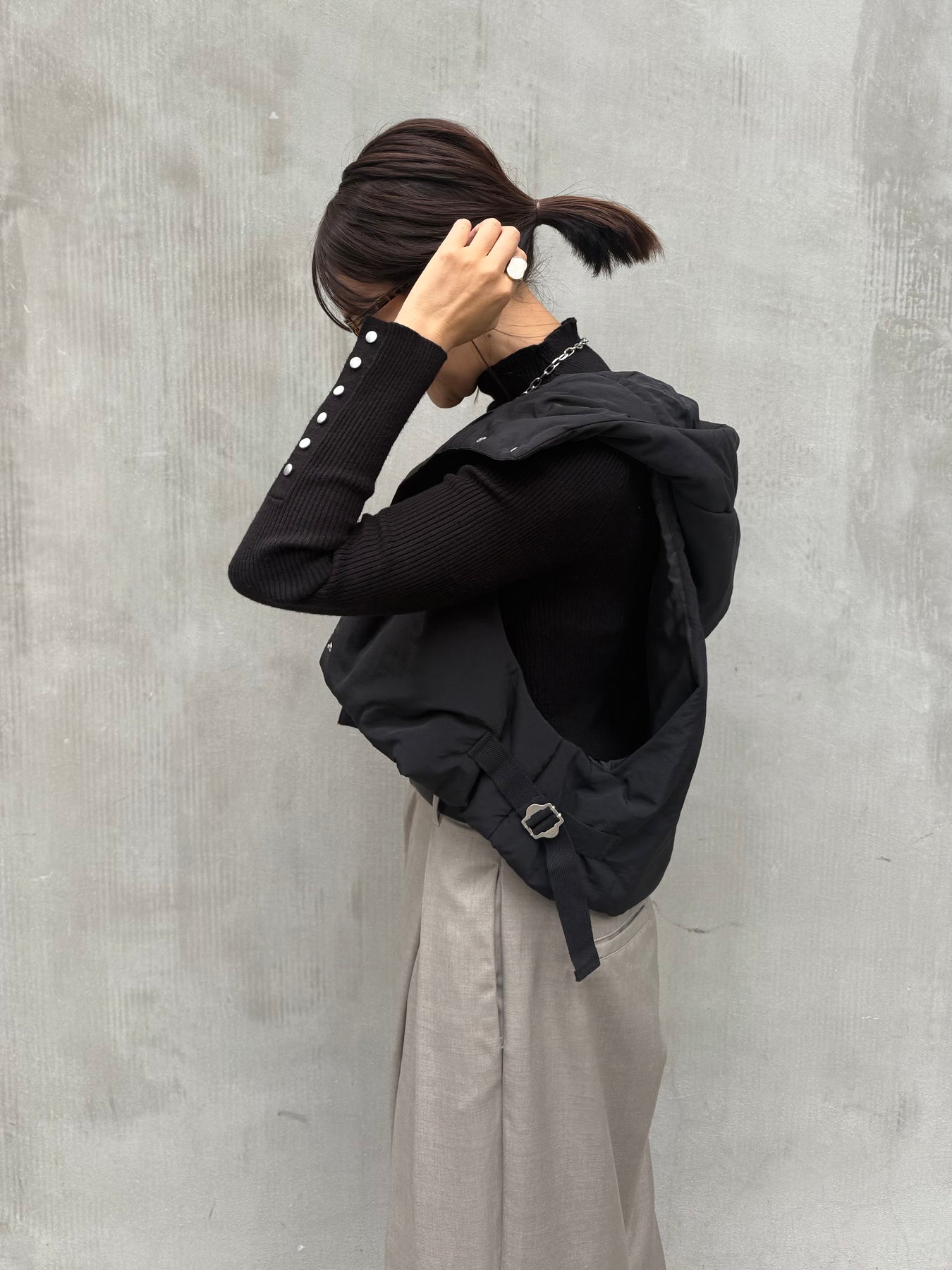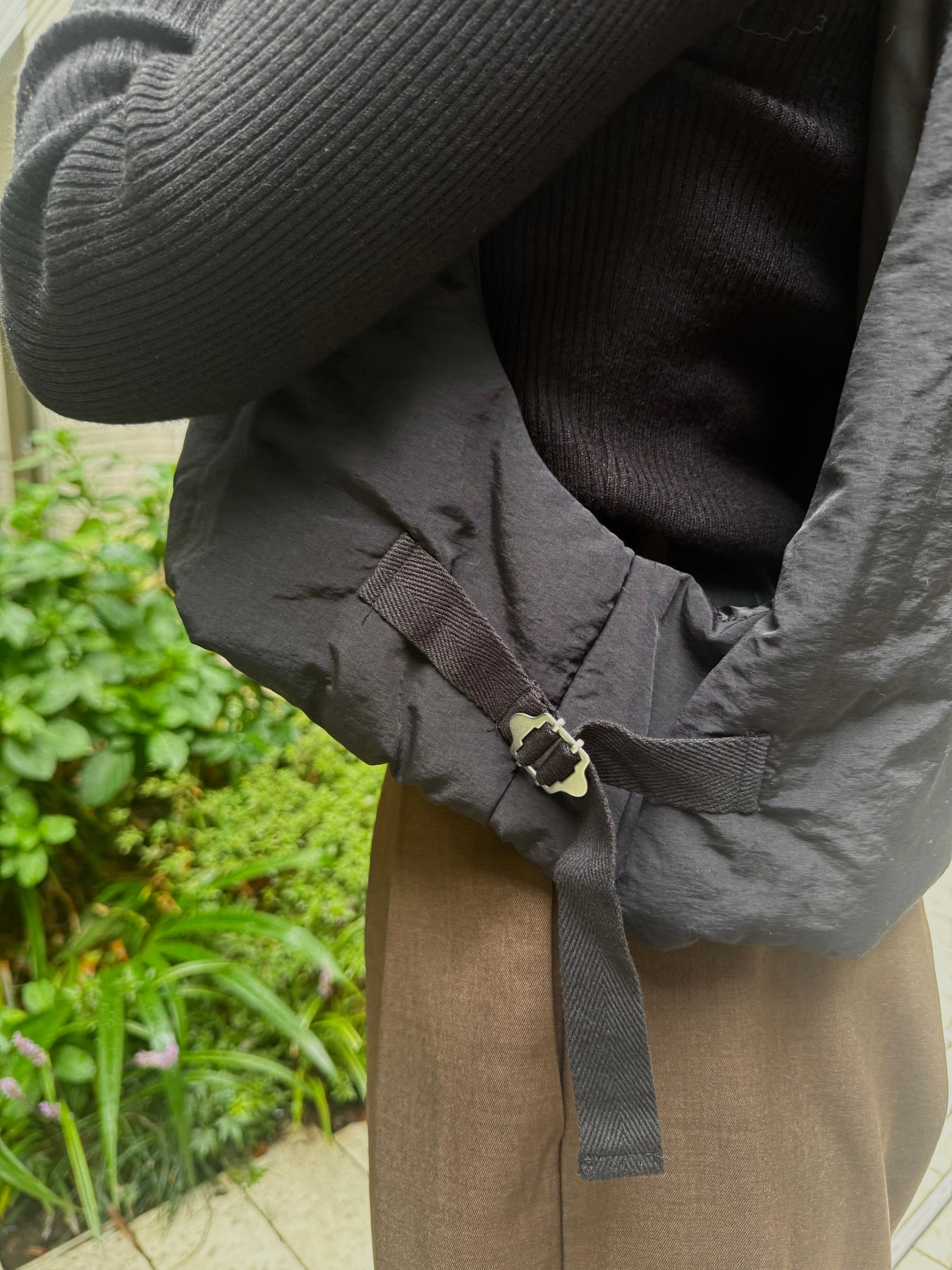 短めの丈感は、ワイドパンツなどとの相性もバツグンです。両脇下にベルトがついているので、調整も可能です。