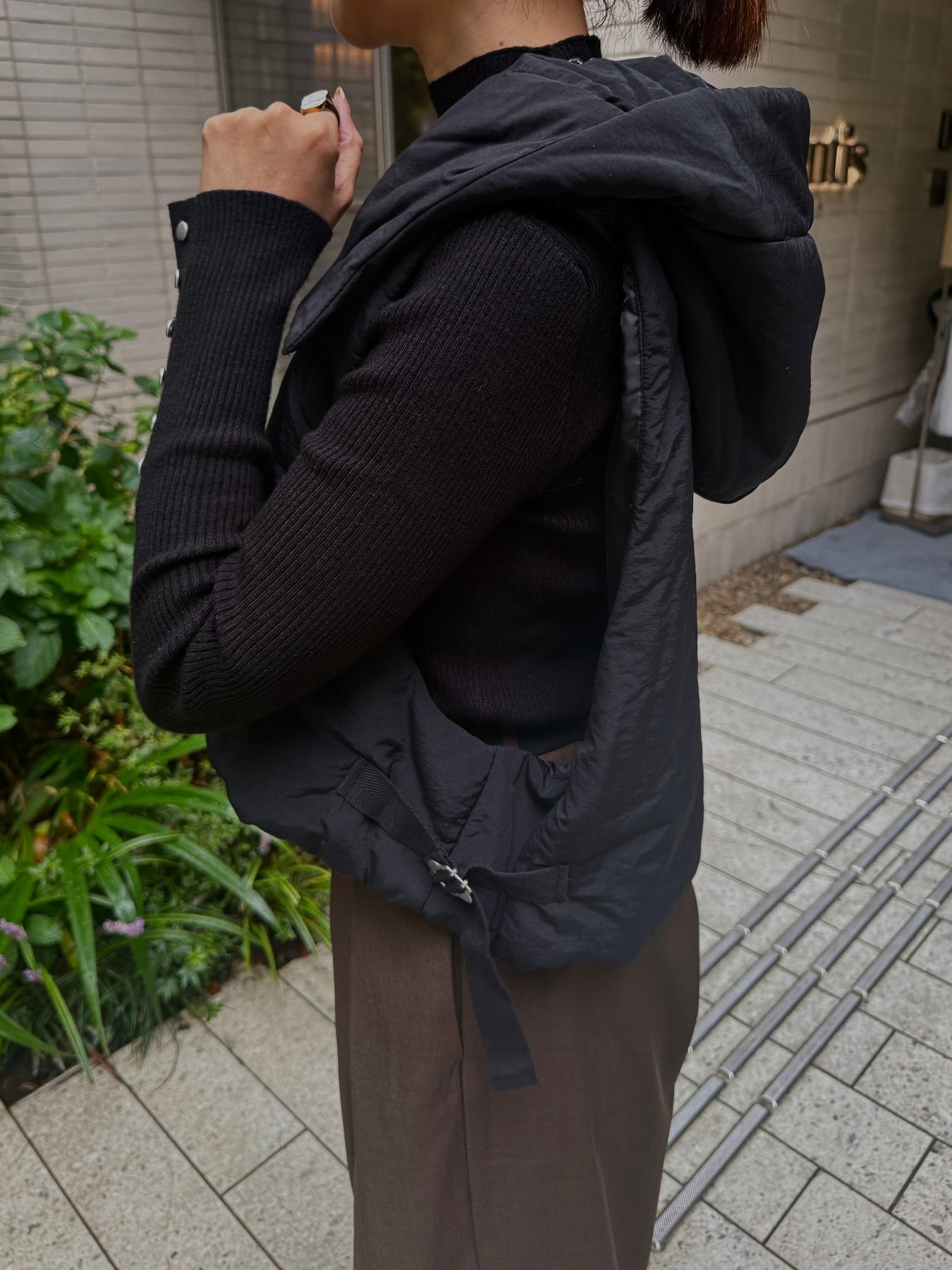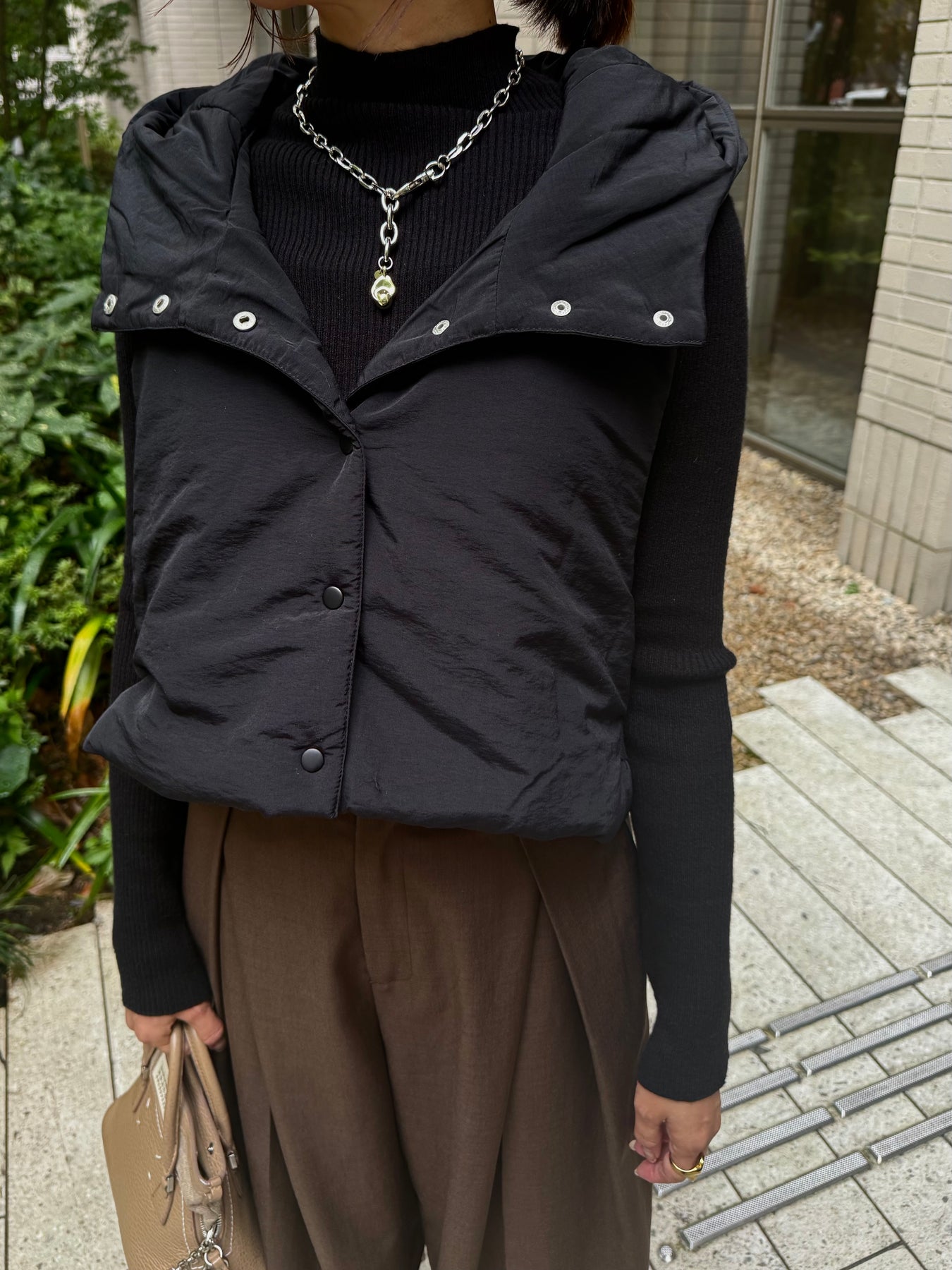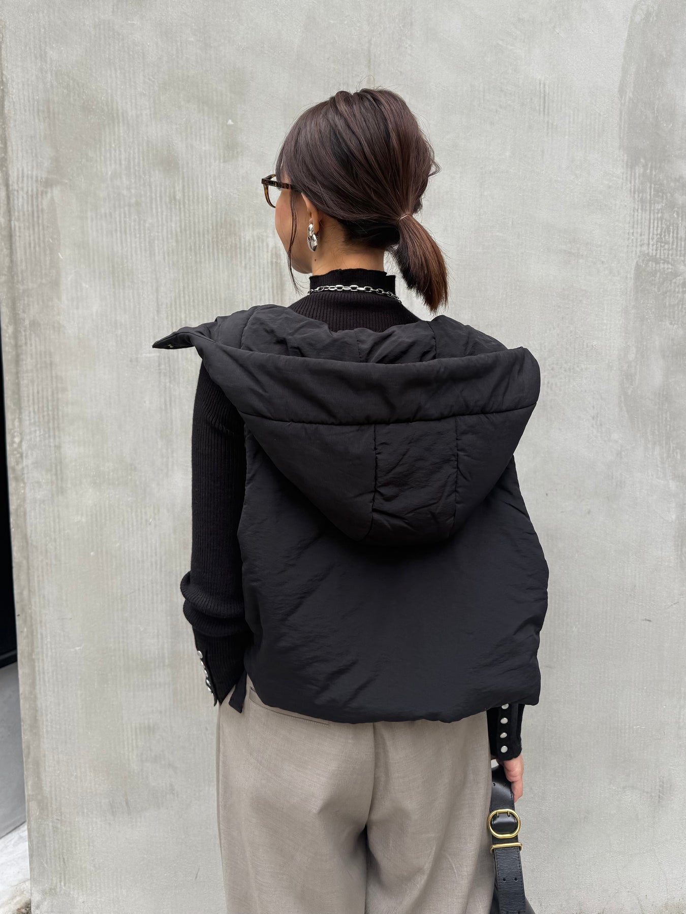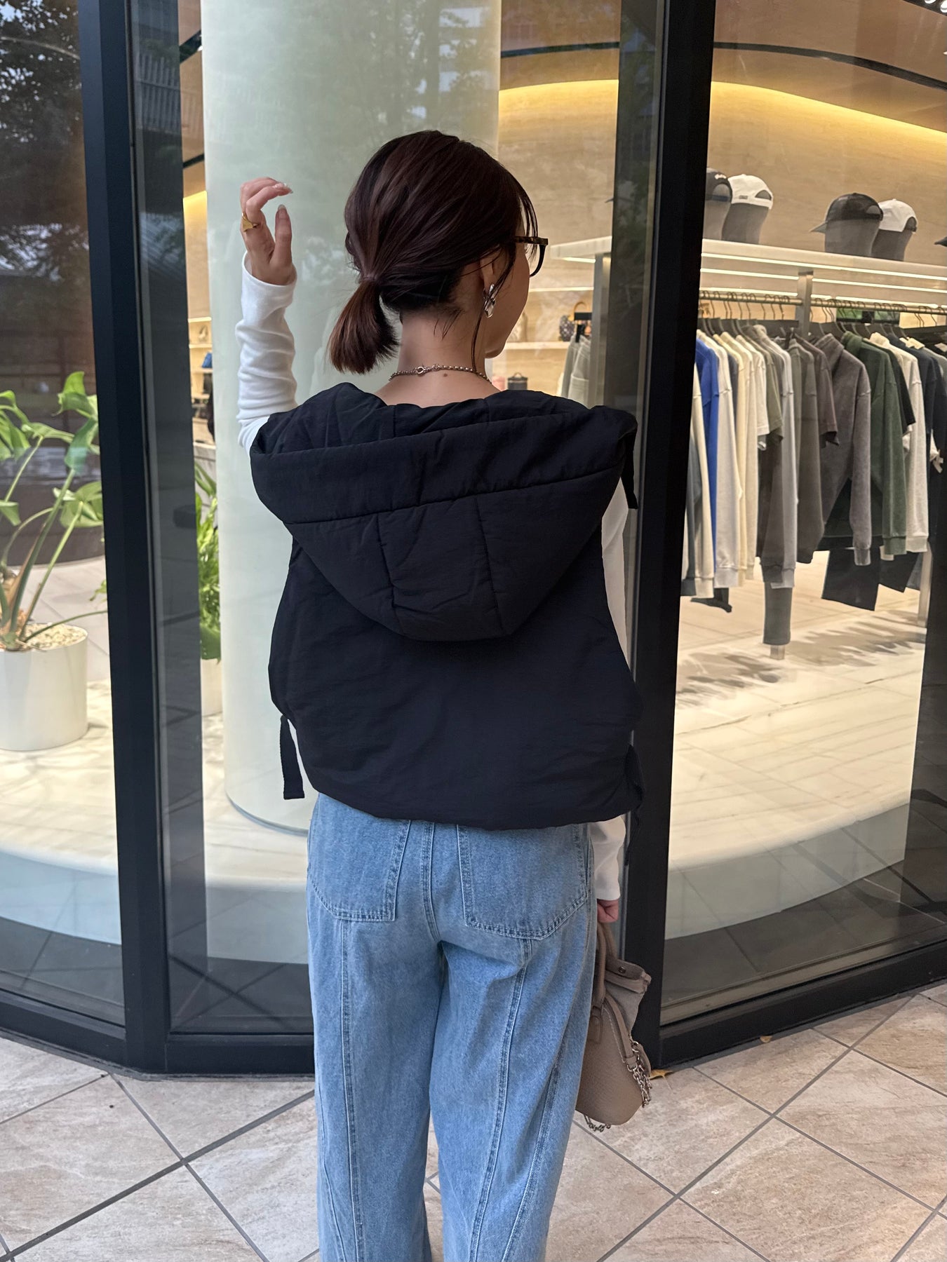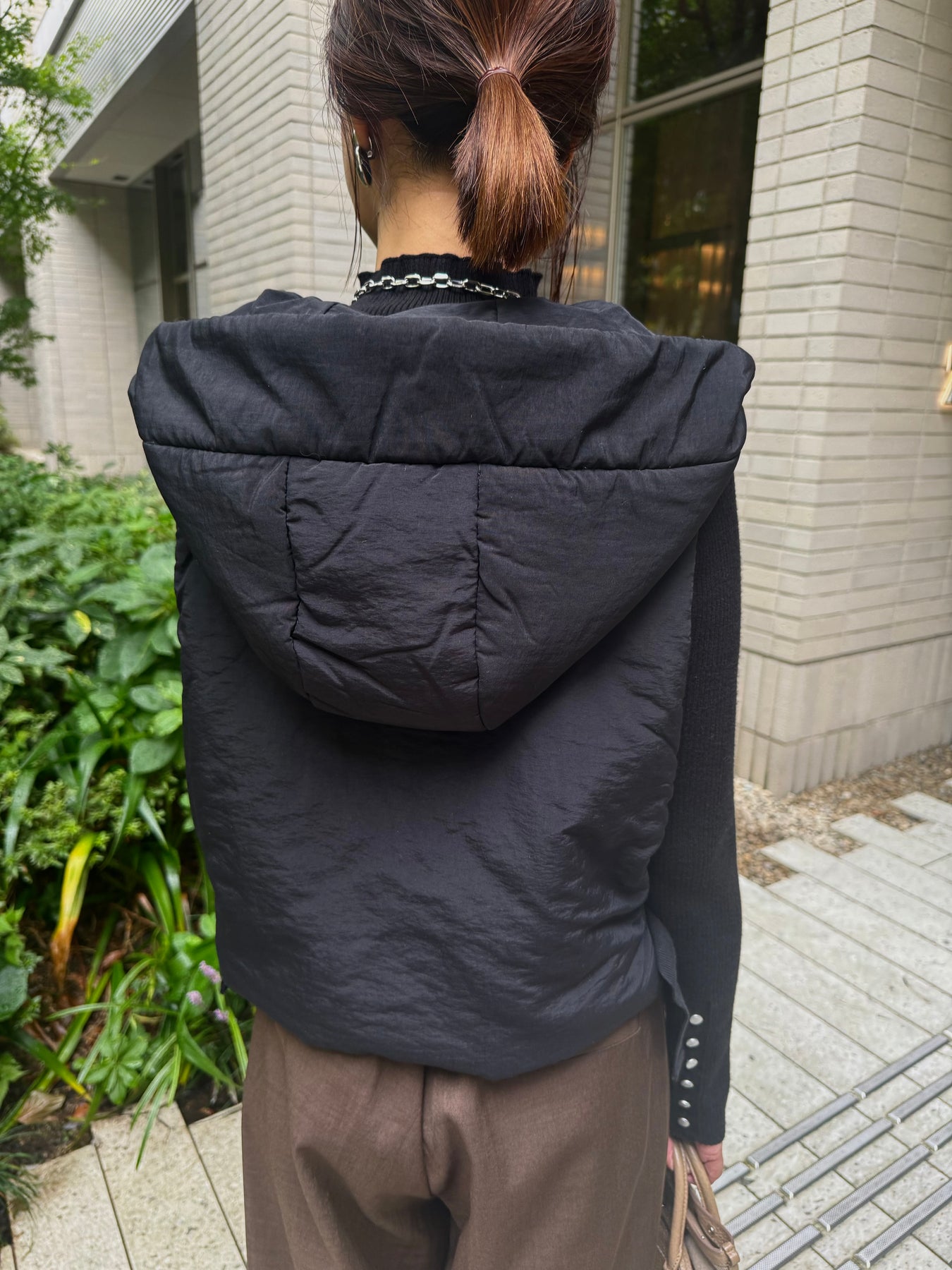 薄手の中綿を使用することですっきり見えする中綿ベスト。短め丈と、ボリュームのあるフードが可愛いアイテム。