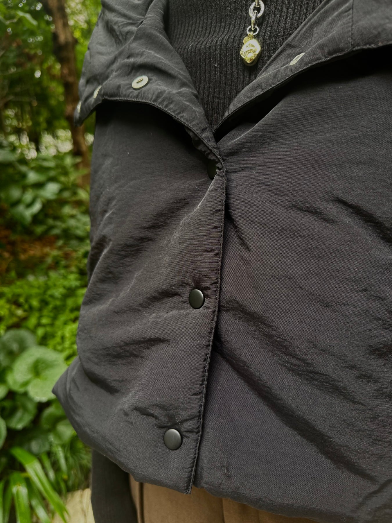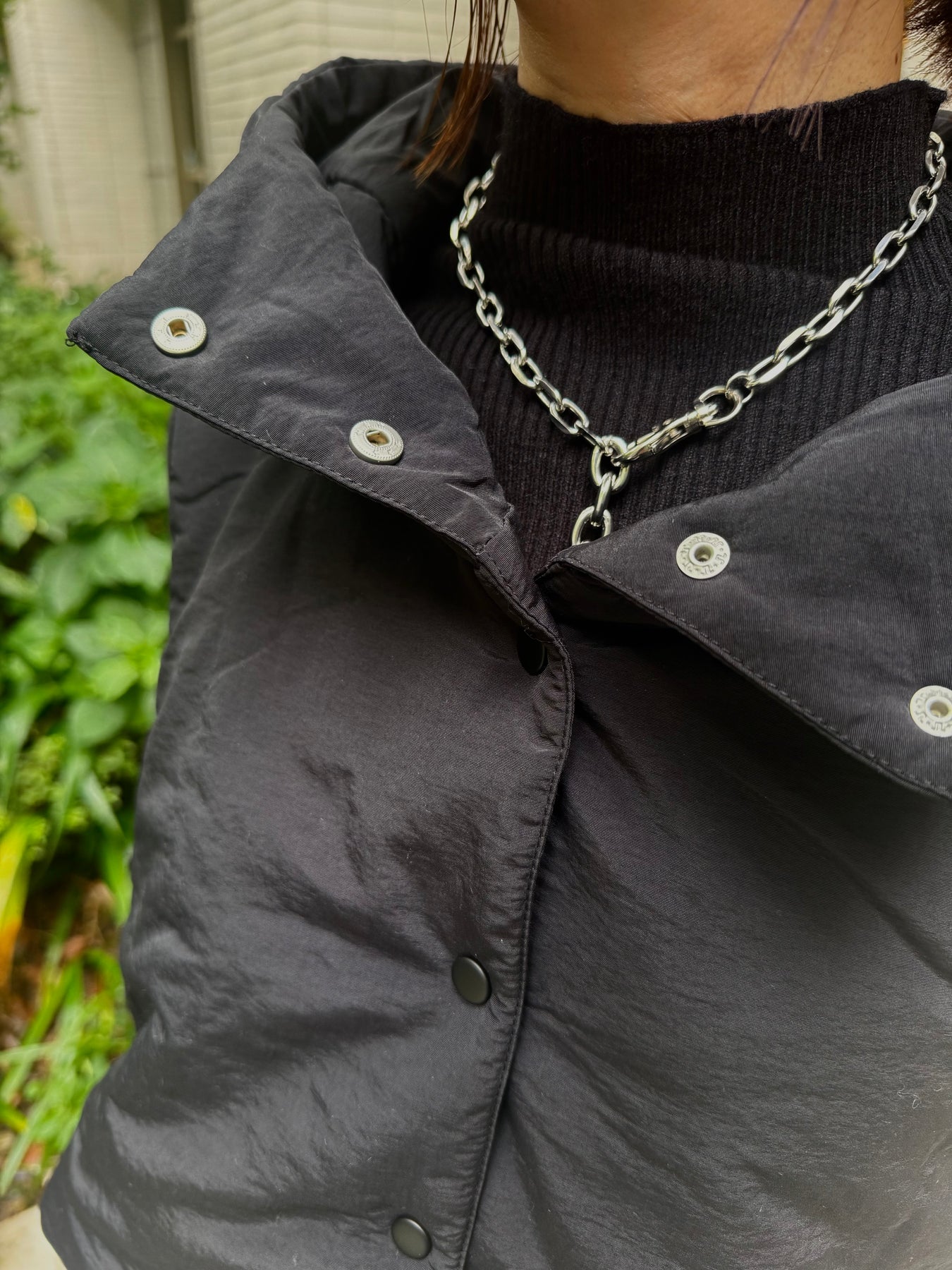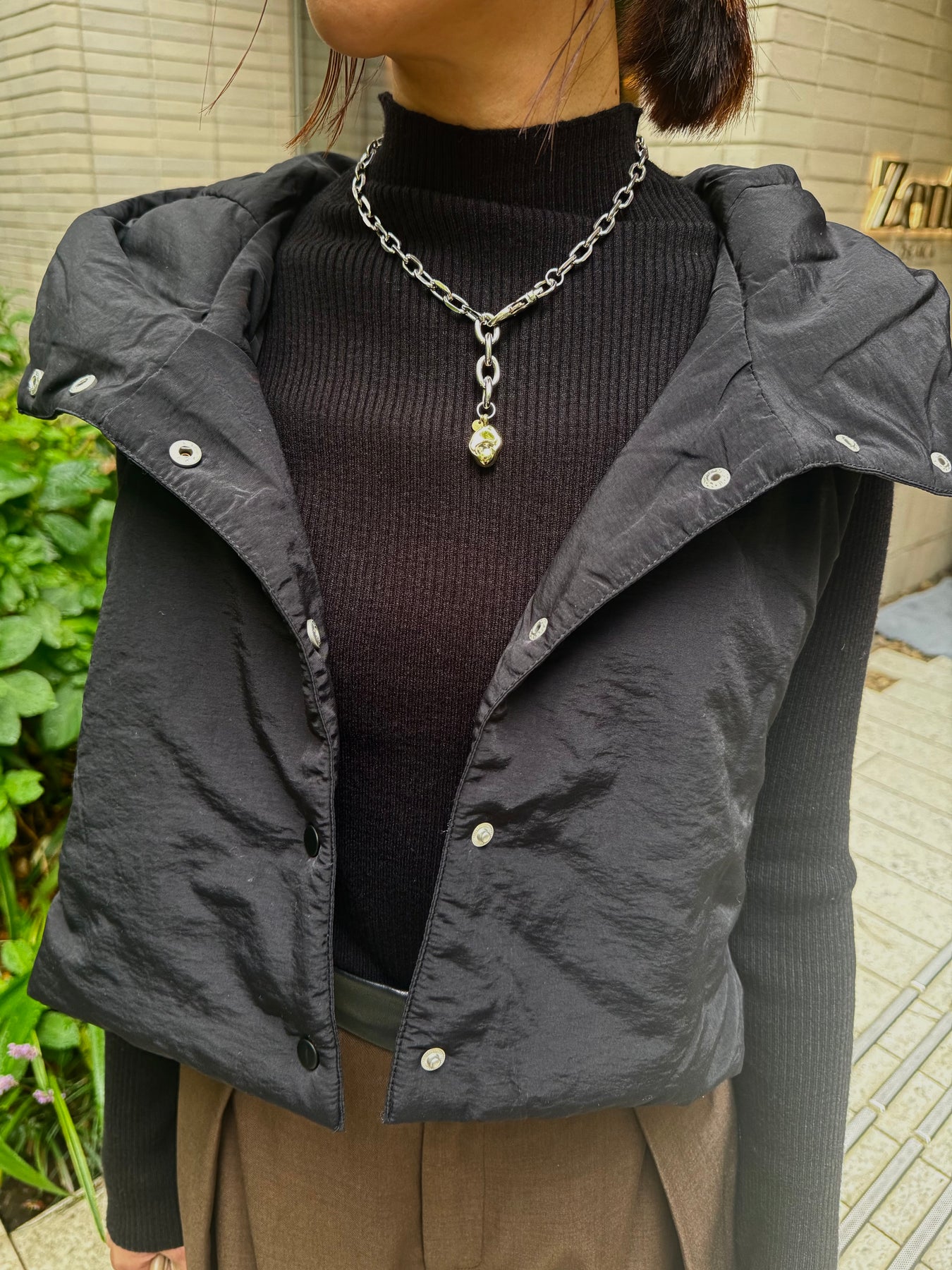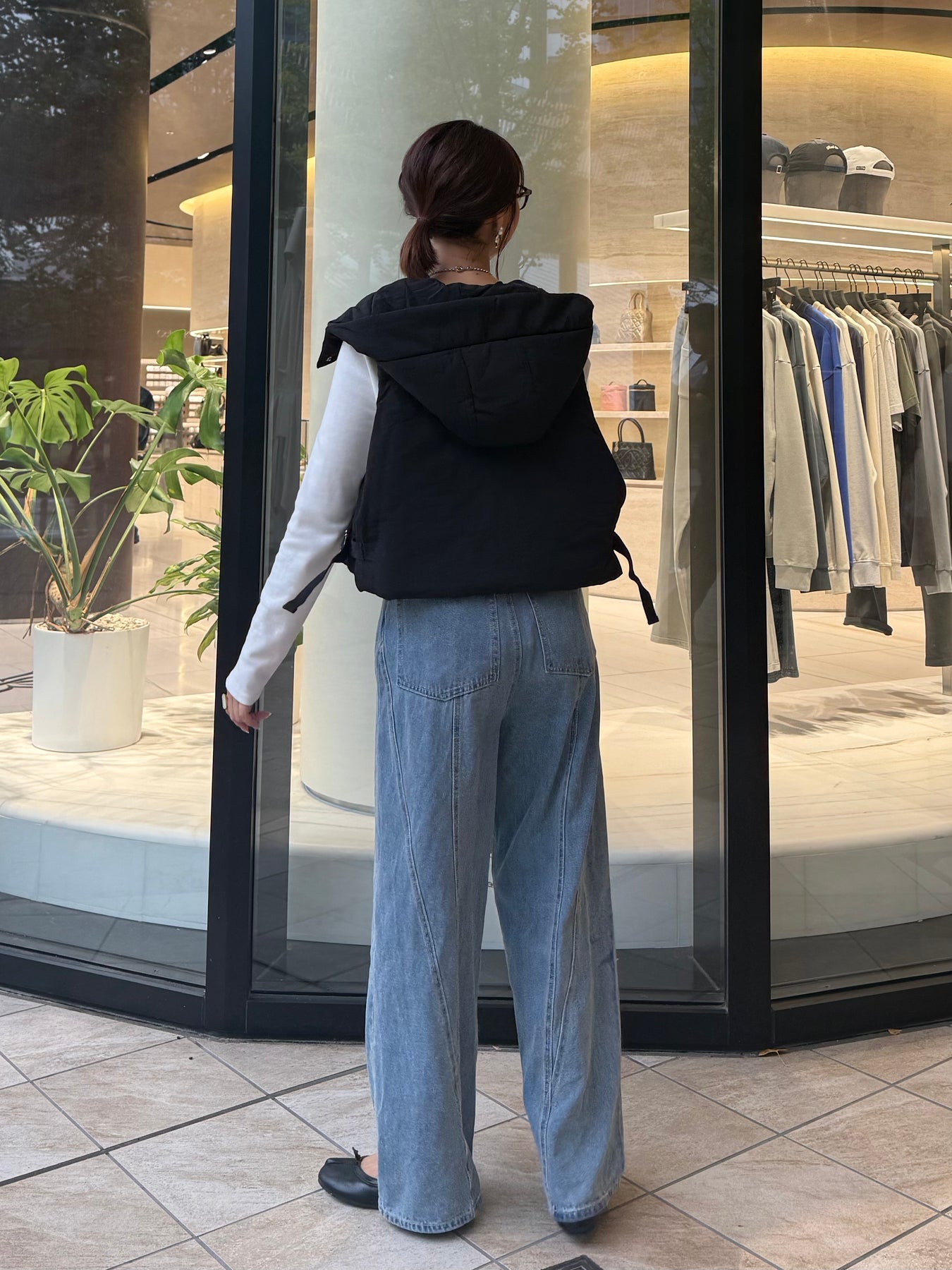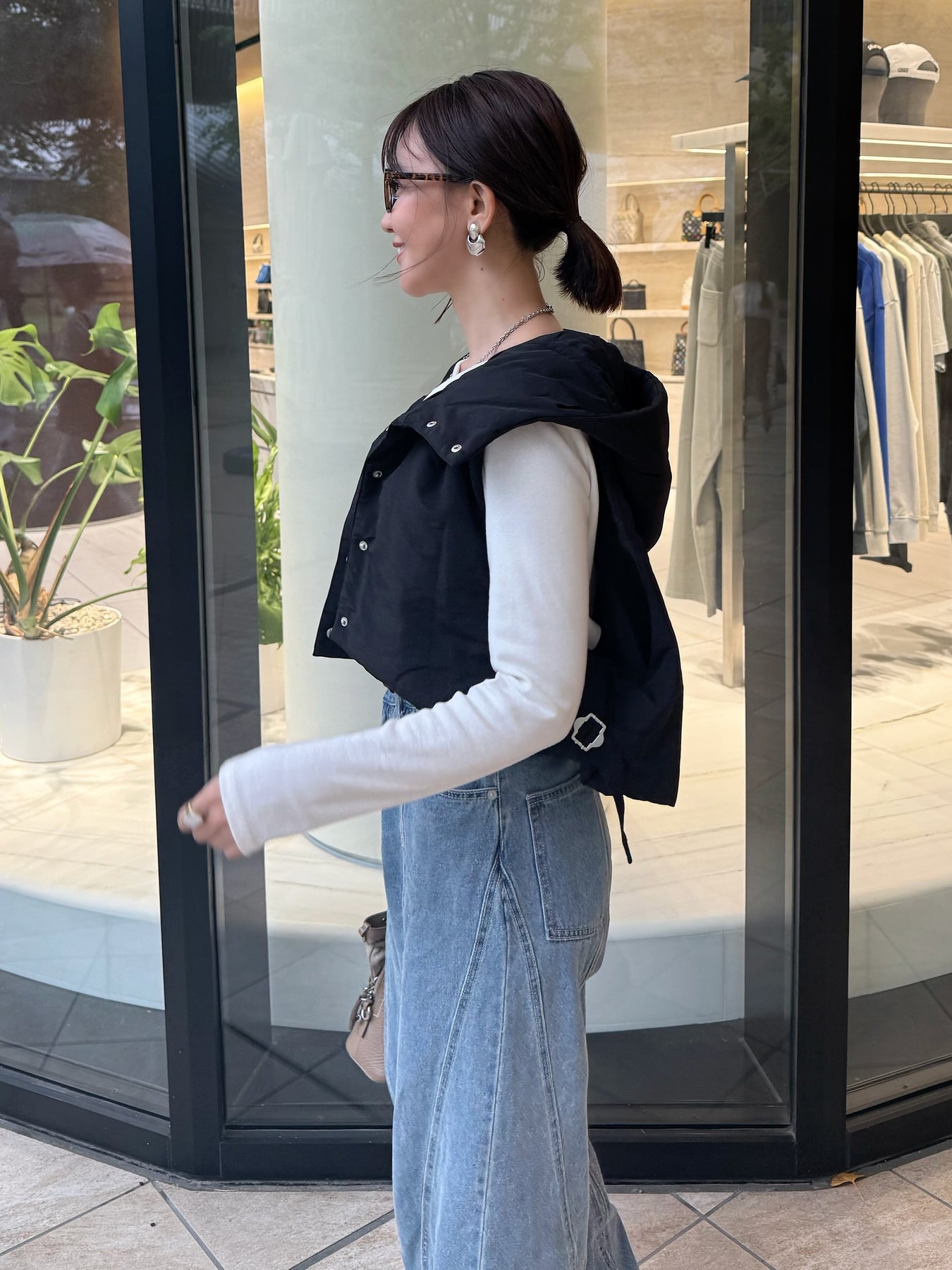 薄手の中綿を使用することですっきり見えする中綿ベスト。短め丈と、ボリュームのあるフードが可愛いアイテム。