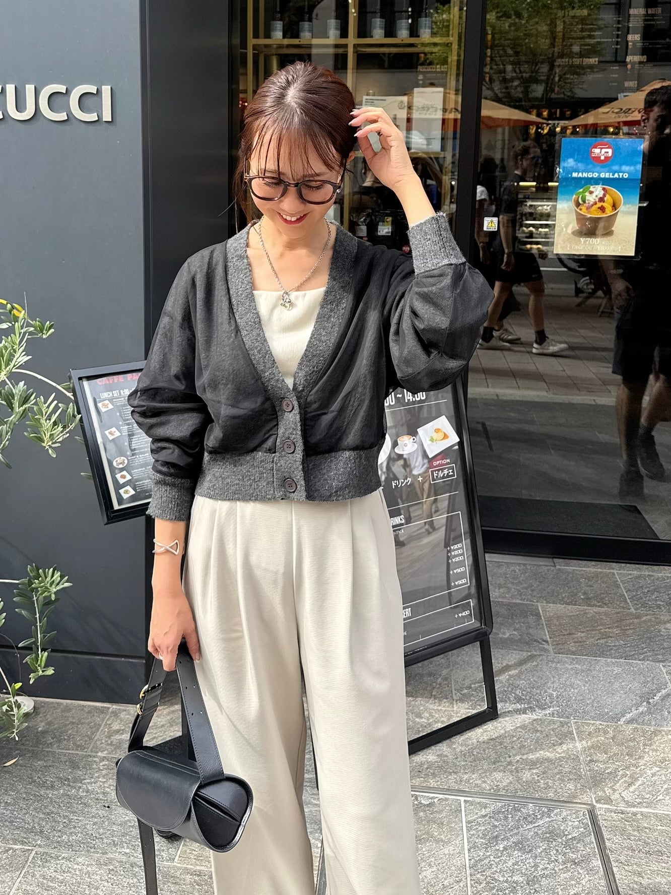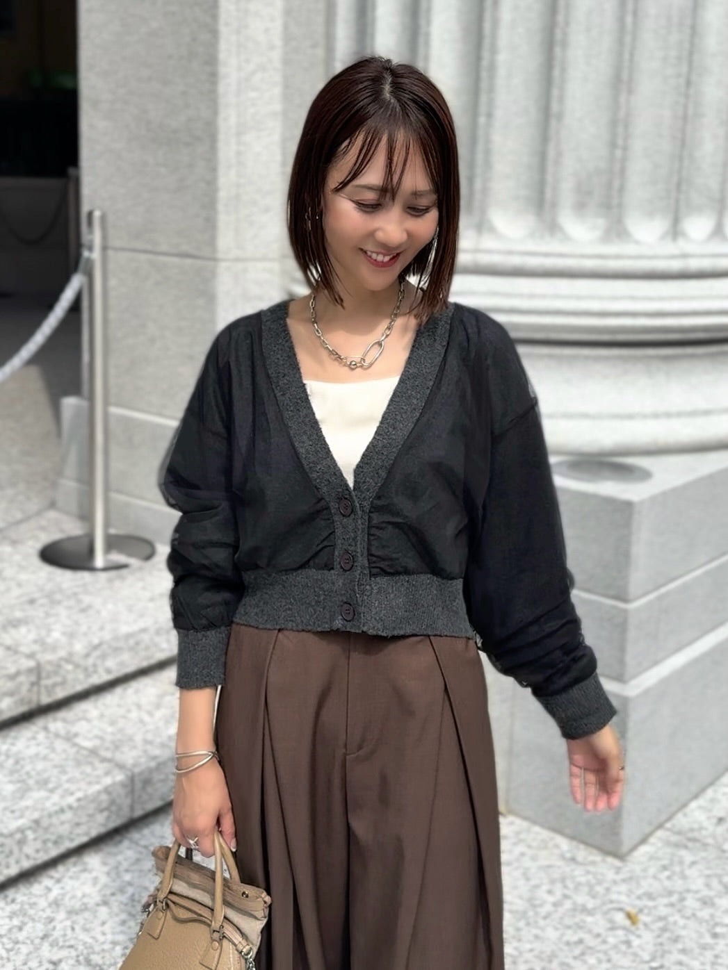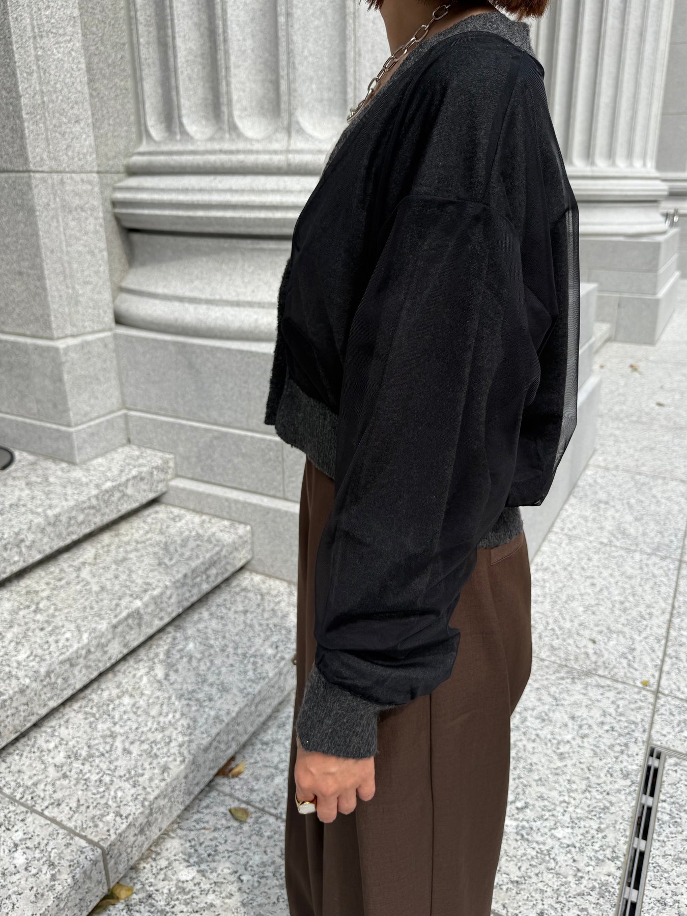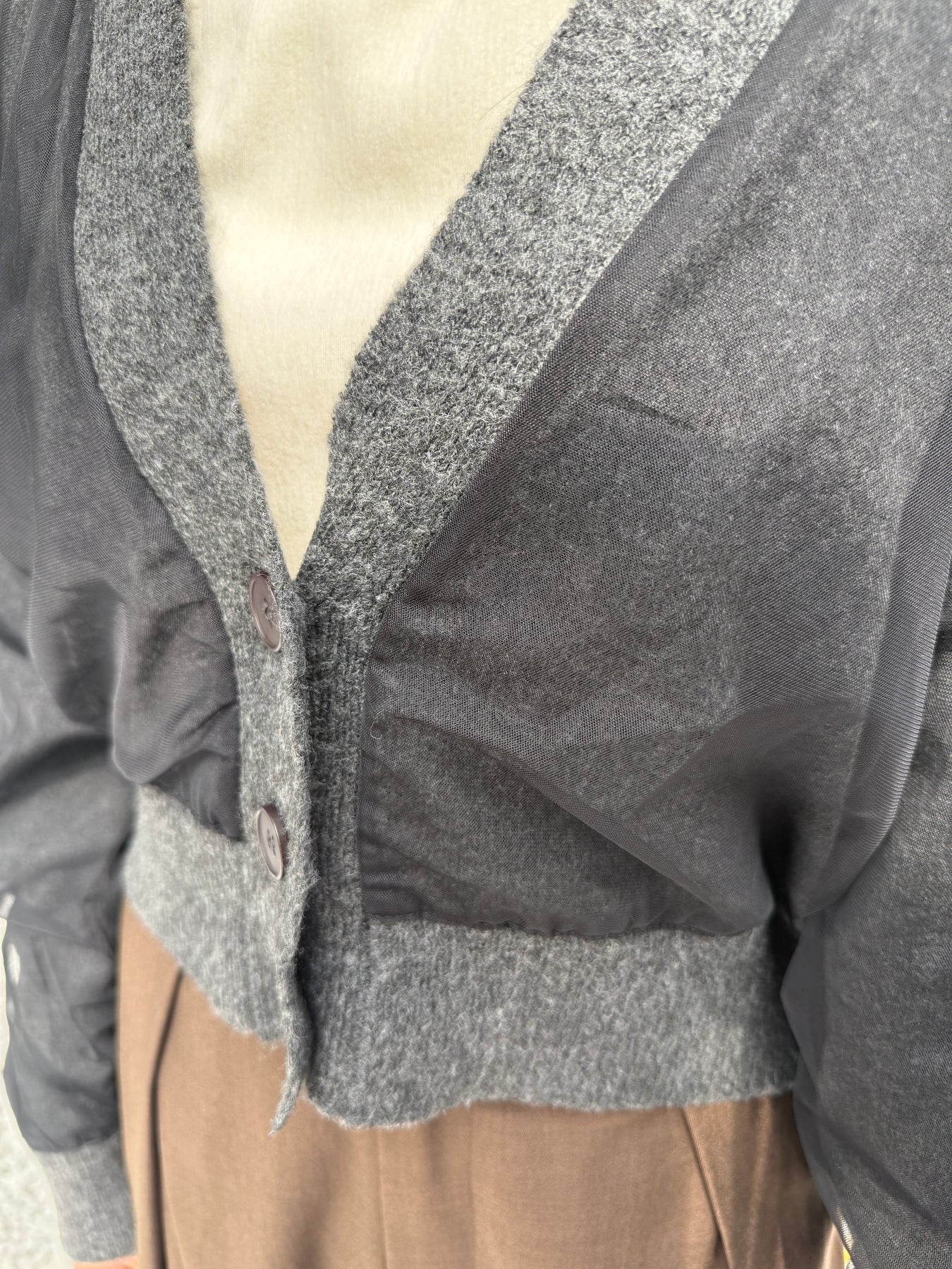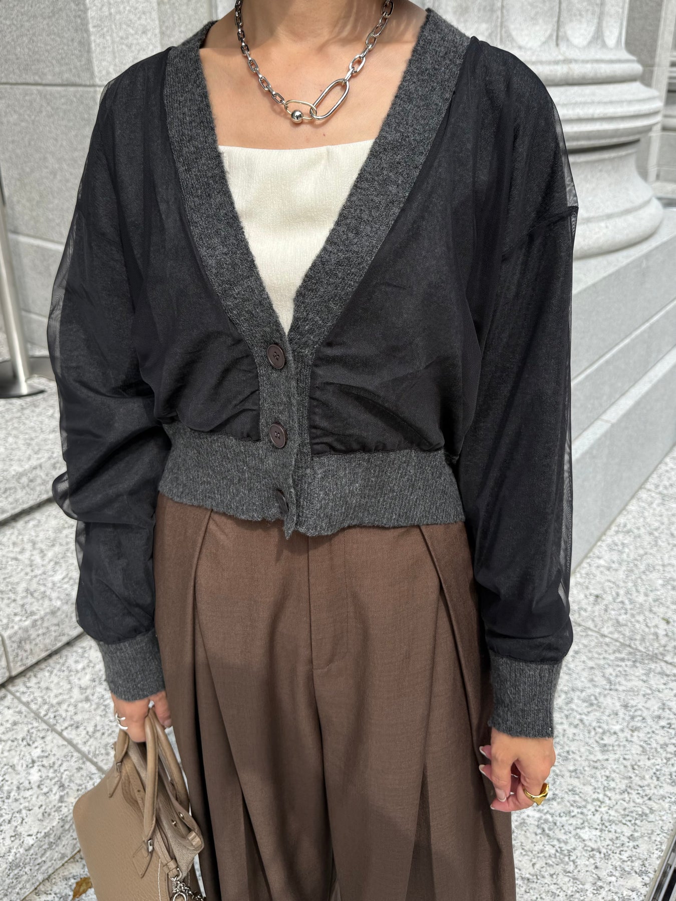 身頃全体にチュールと暖かみのあるニットをレイヤードしたデザインが、女性らしいカーディガン。クロップド丈なので、脚長効果もあり、ボトムとのバランスも取りやすい1枚。深めのVネックが顔周りをすっきりとみせてくれます。