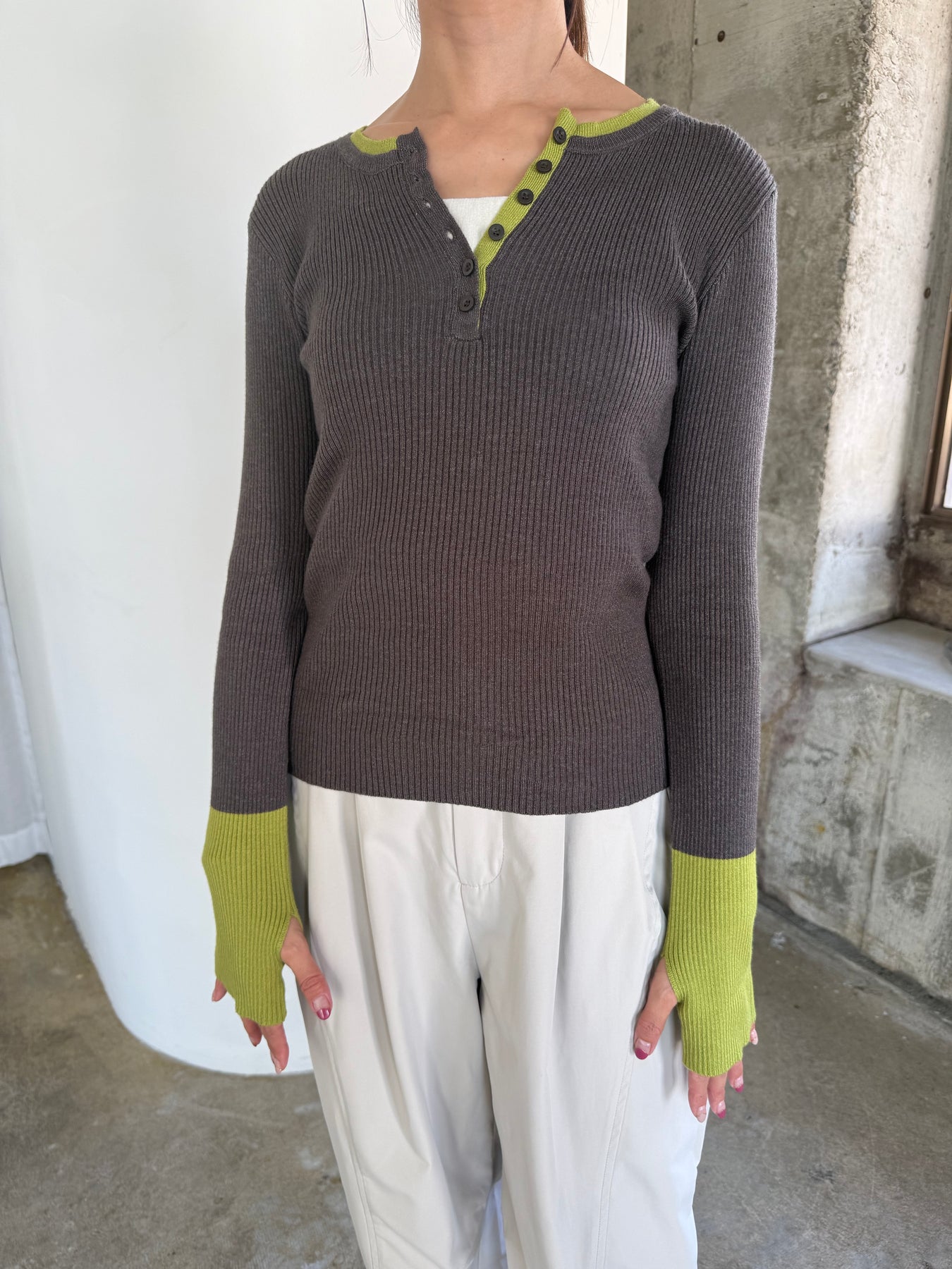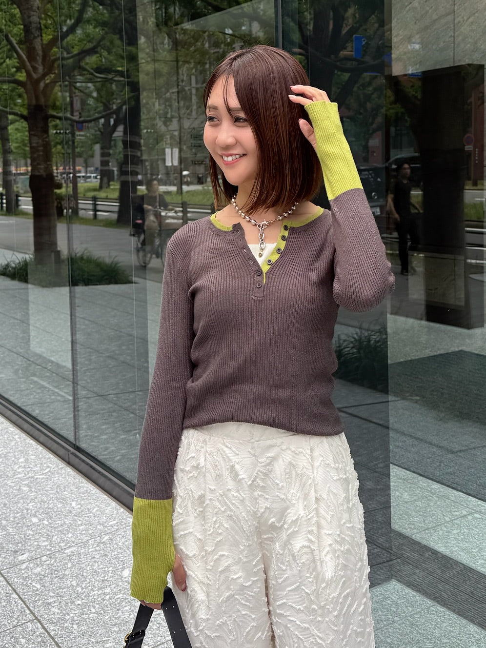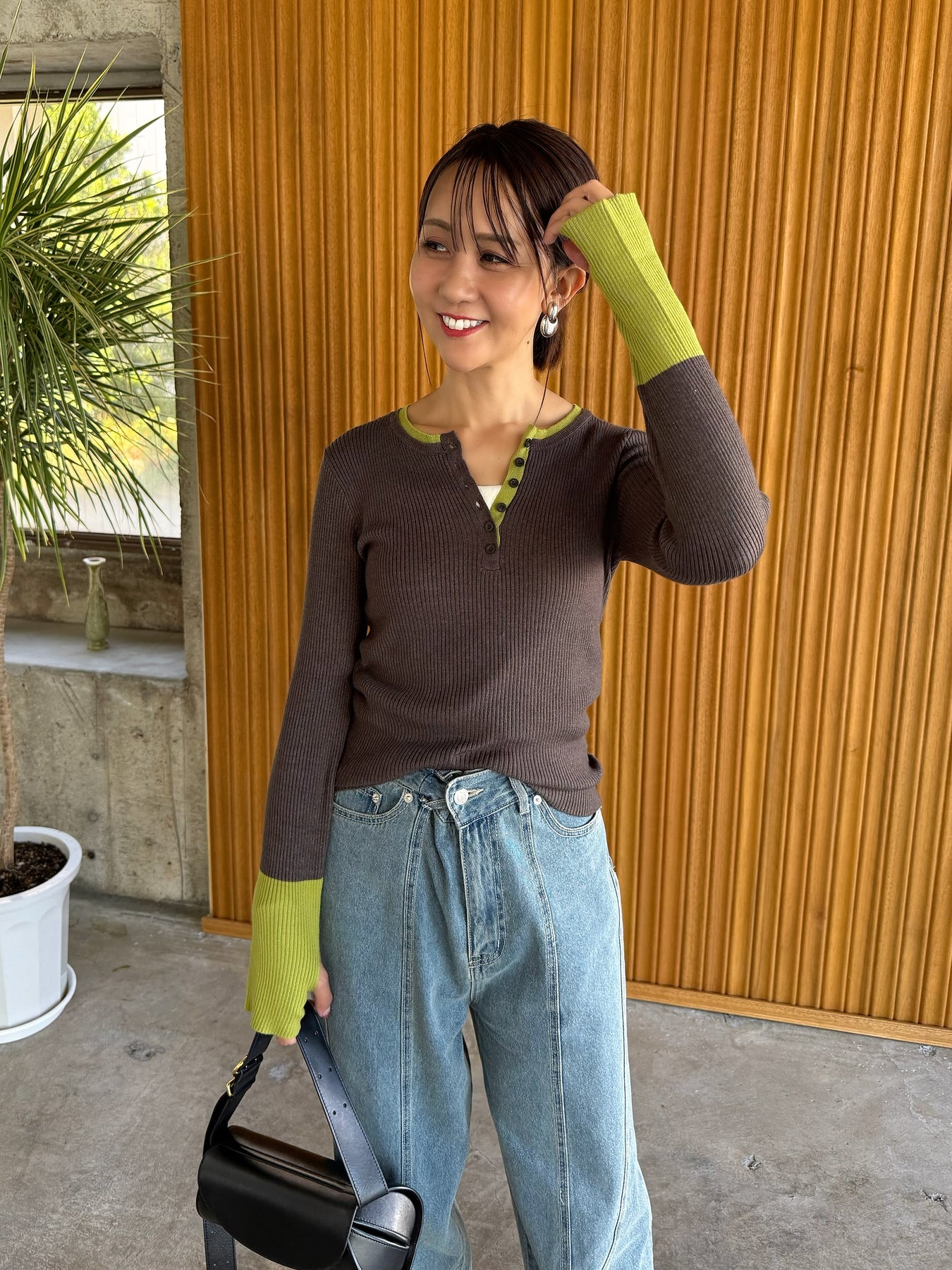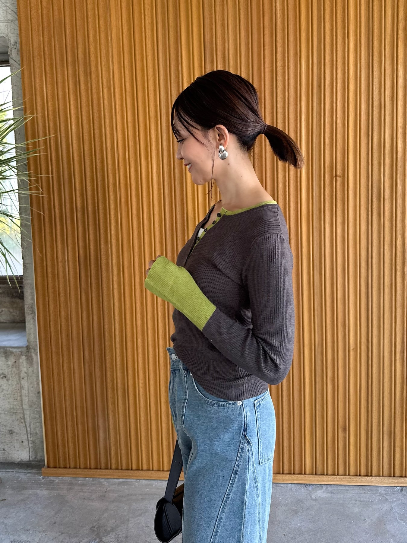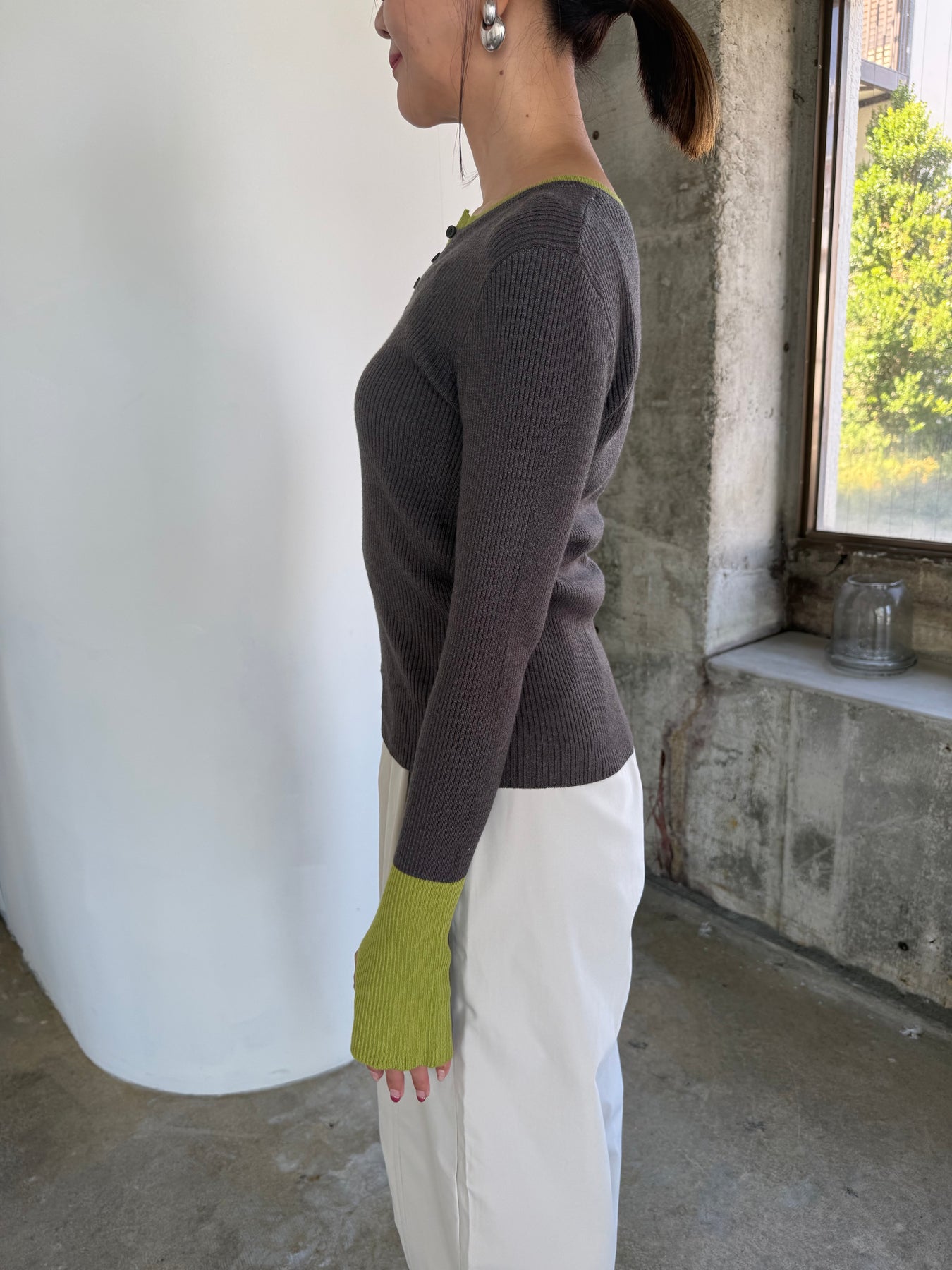 首周りと袖の配色デザインがトレンド感のあるリブニット。程よく体にフィットするサイズ感は華奢見えを叶えてくれます。ヘンリーネックのデザインは顔周りをすっきりとみせてくれます。1枚着はもちろん、インナーとしても大活躍してくれる1枚。素材は、伸縮性があるのでストレスフリーに着用可能。袖口のフィンガーホールの仕様となります。