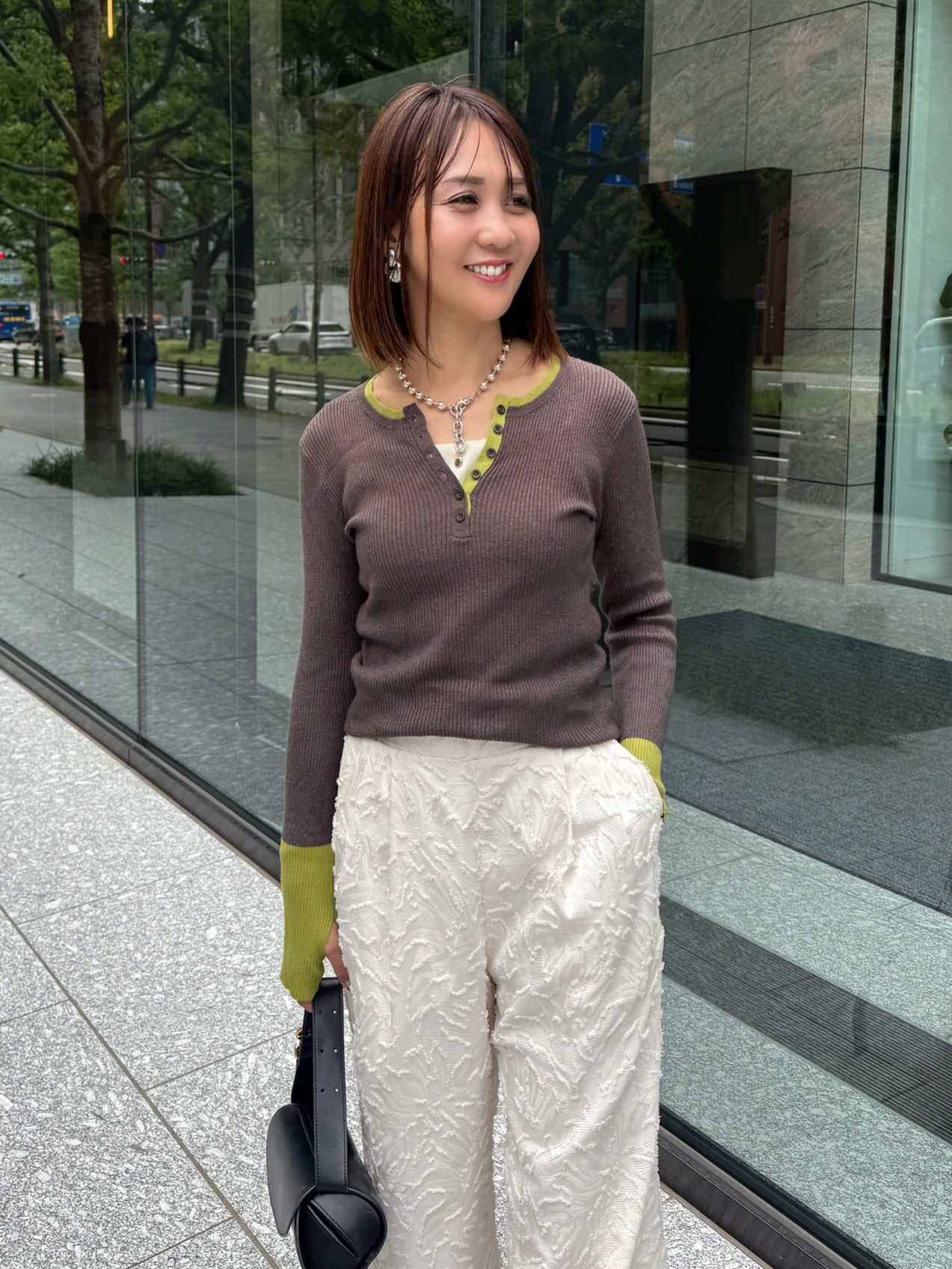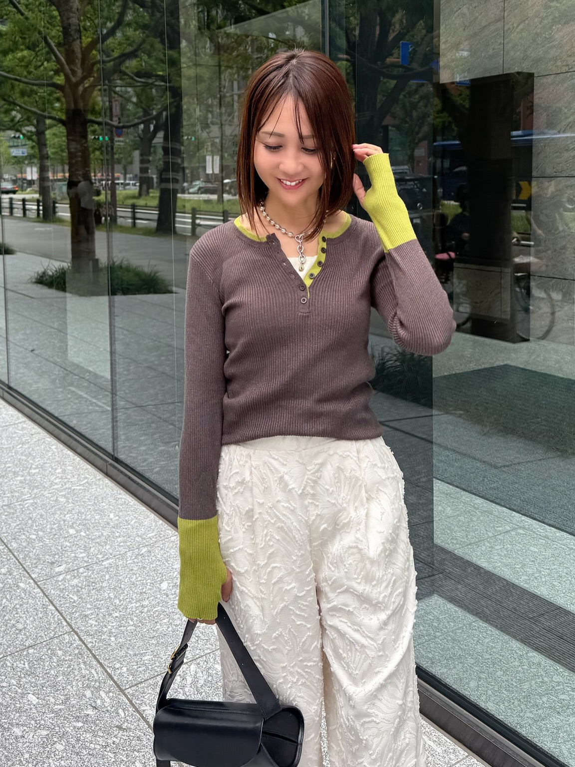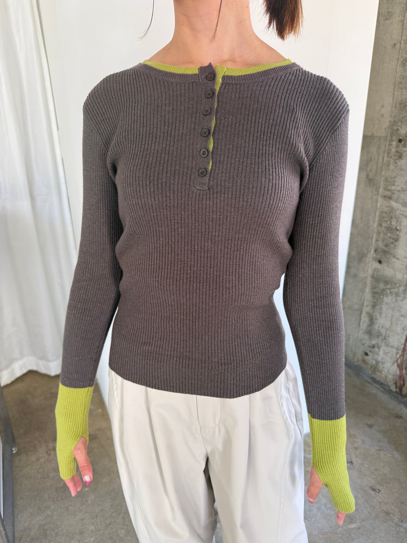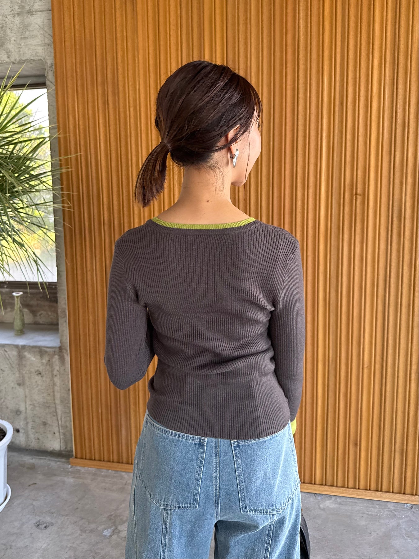 首周りと袖の配色デザインがトレンド感のあるリブニット。程よく体にフィットするサイズ感は華奢見えを叶えてくれます。ヘンリーネックのデザインは顔周りをすっきりとみせてくれます。1枚着はもちろん、インナーとしても大活躍してくれる1枚。素材は、伸縮性があるのでストレスフリーに着用可能。袖口のフィンガーホールの仕様となります。