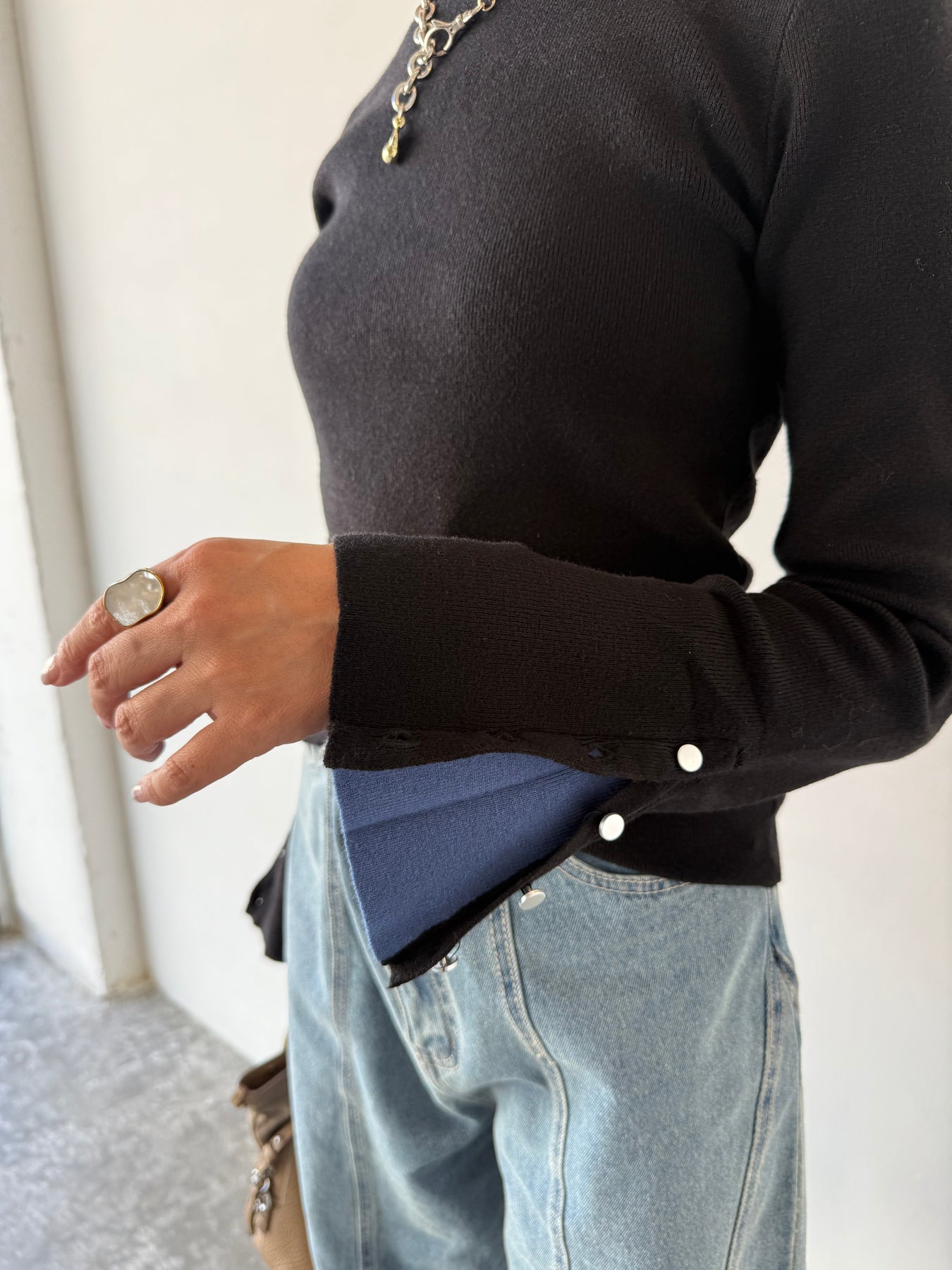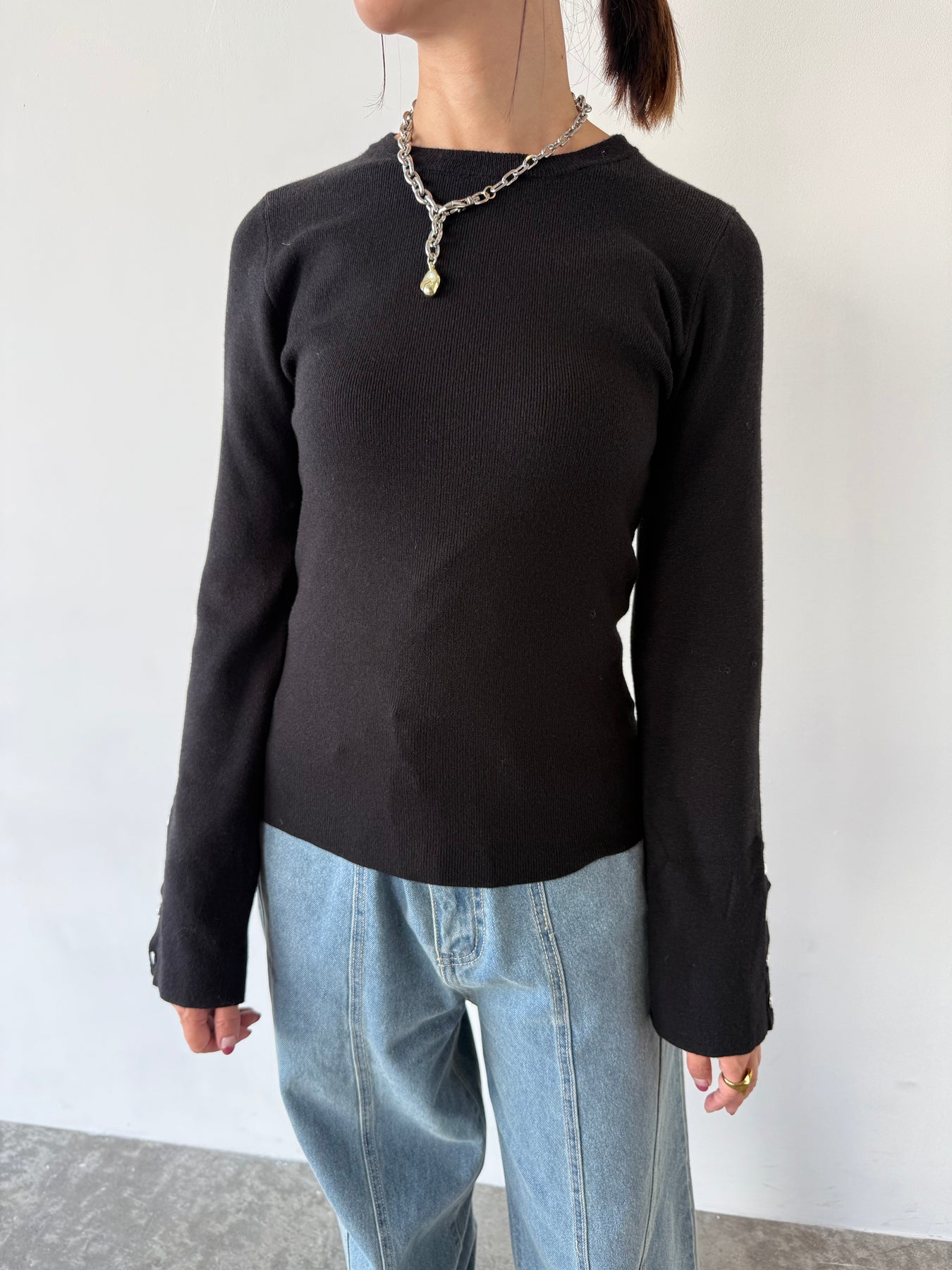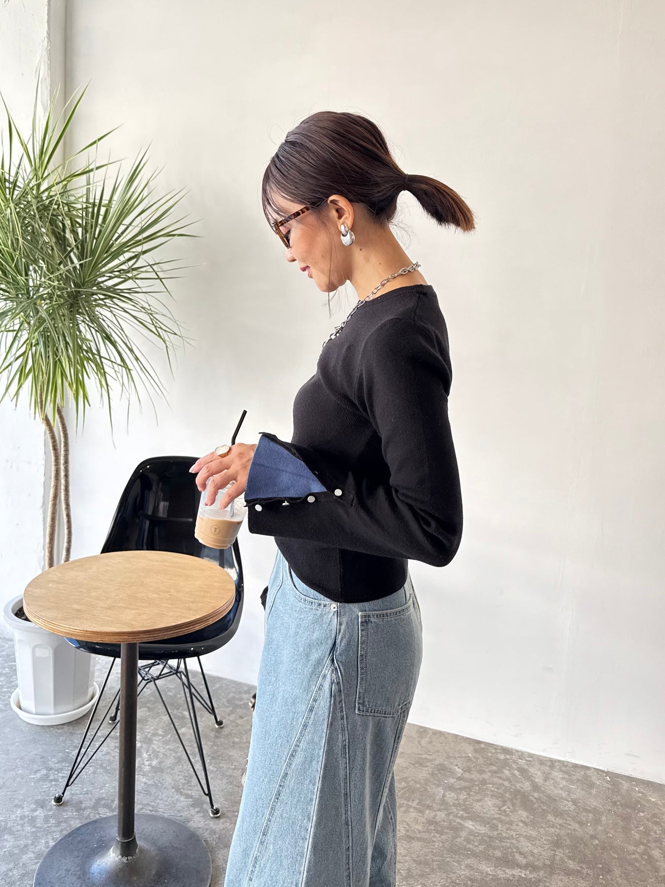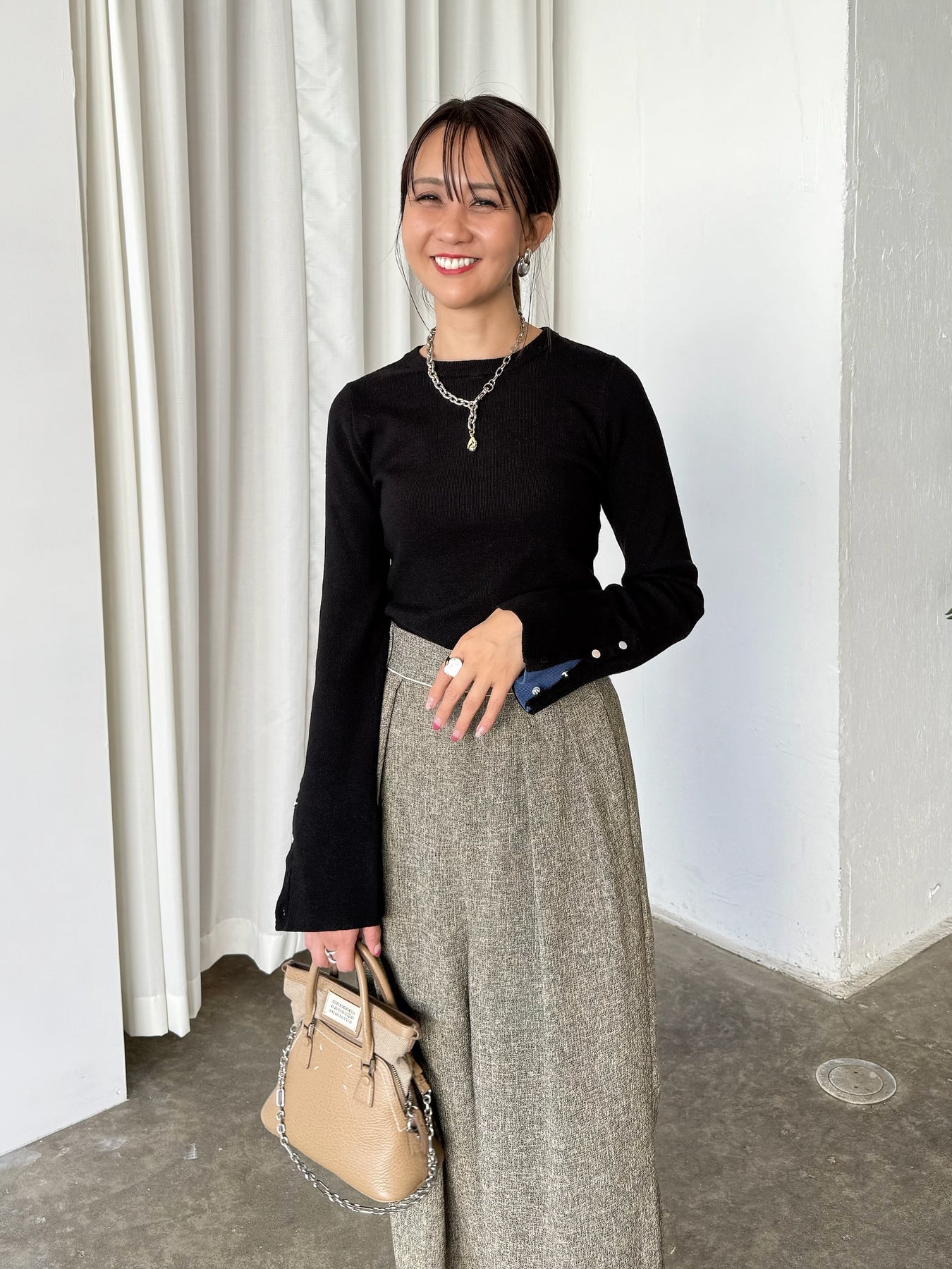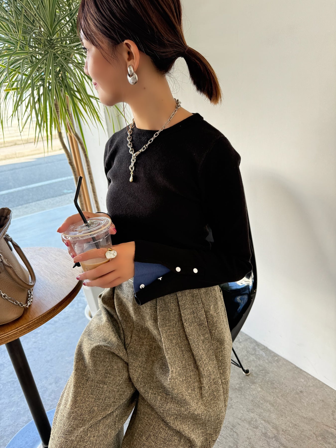 配色デザインがトレンド感のあるニットトップス。袖ボタンを外した時は、フレアー袖に配色デザインがシンプルながら一癖あるデザインに。ボタンは留めてベーシックに着用することも可能です。1枚でもインナーとしても使いやすいアイテムです。素材は、もっちりとした肌触りの良い素材となります。秋冬に大活躍してくれます。