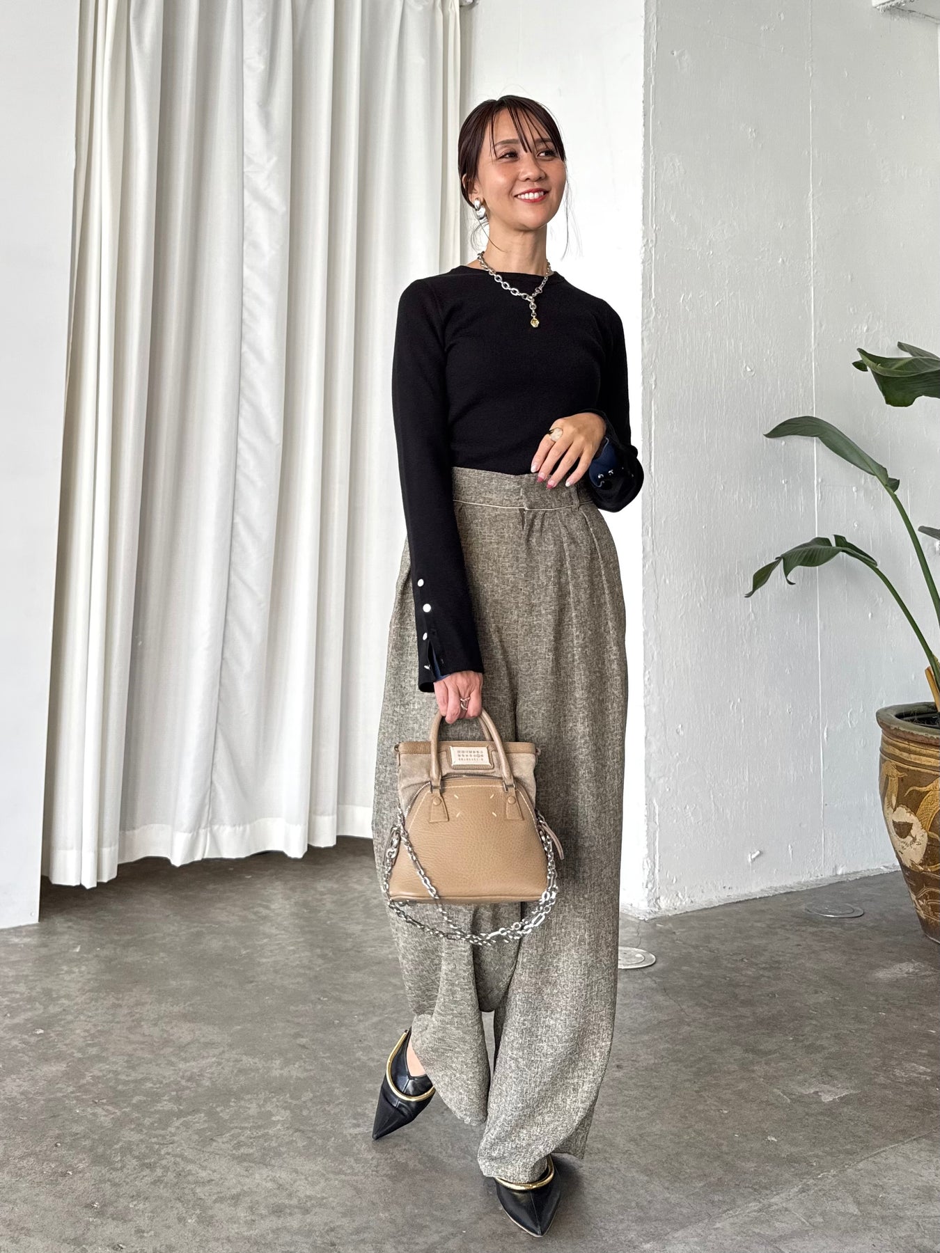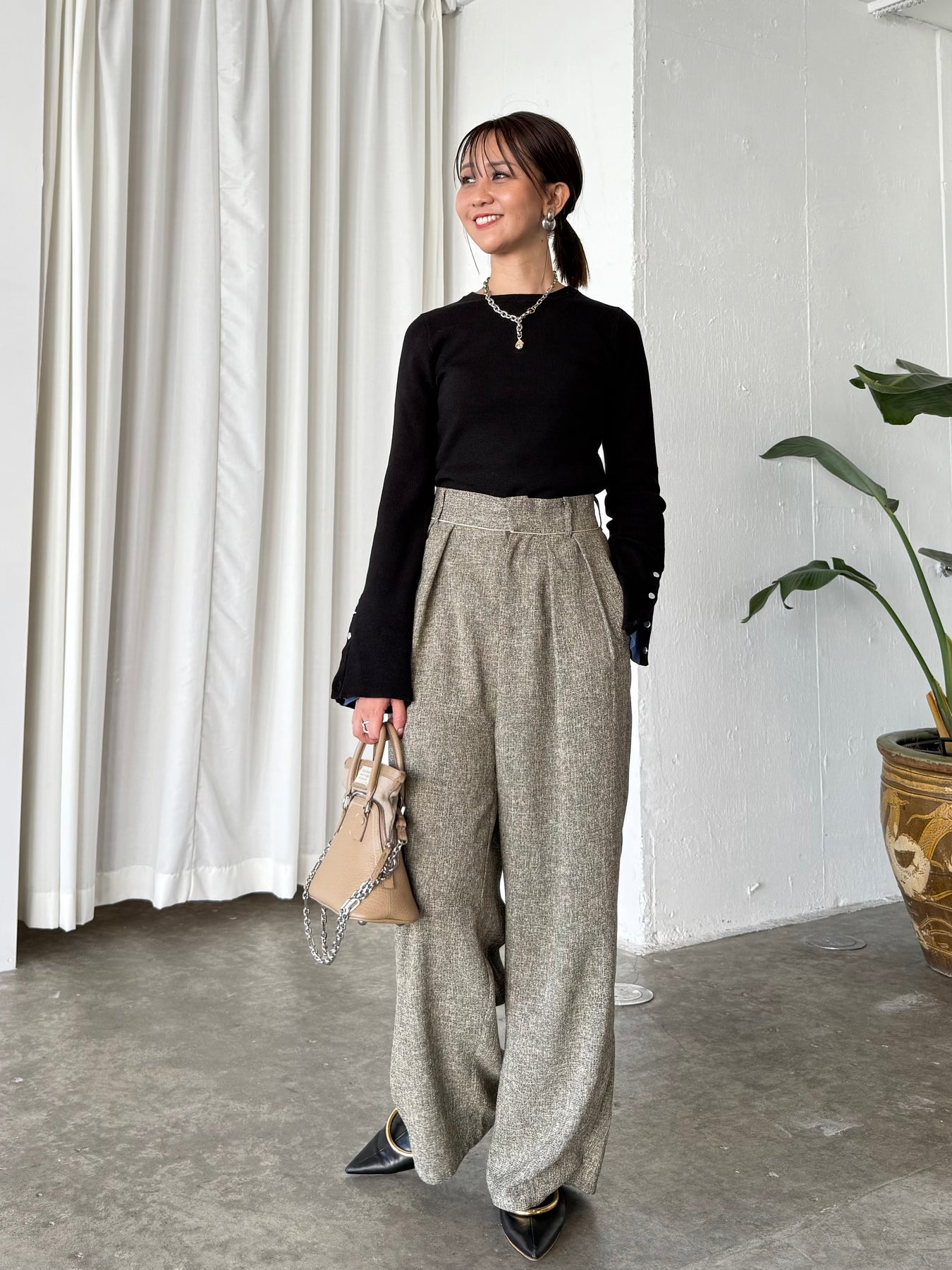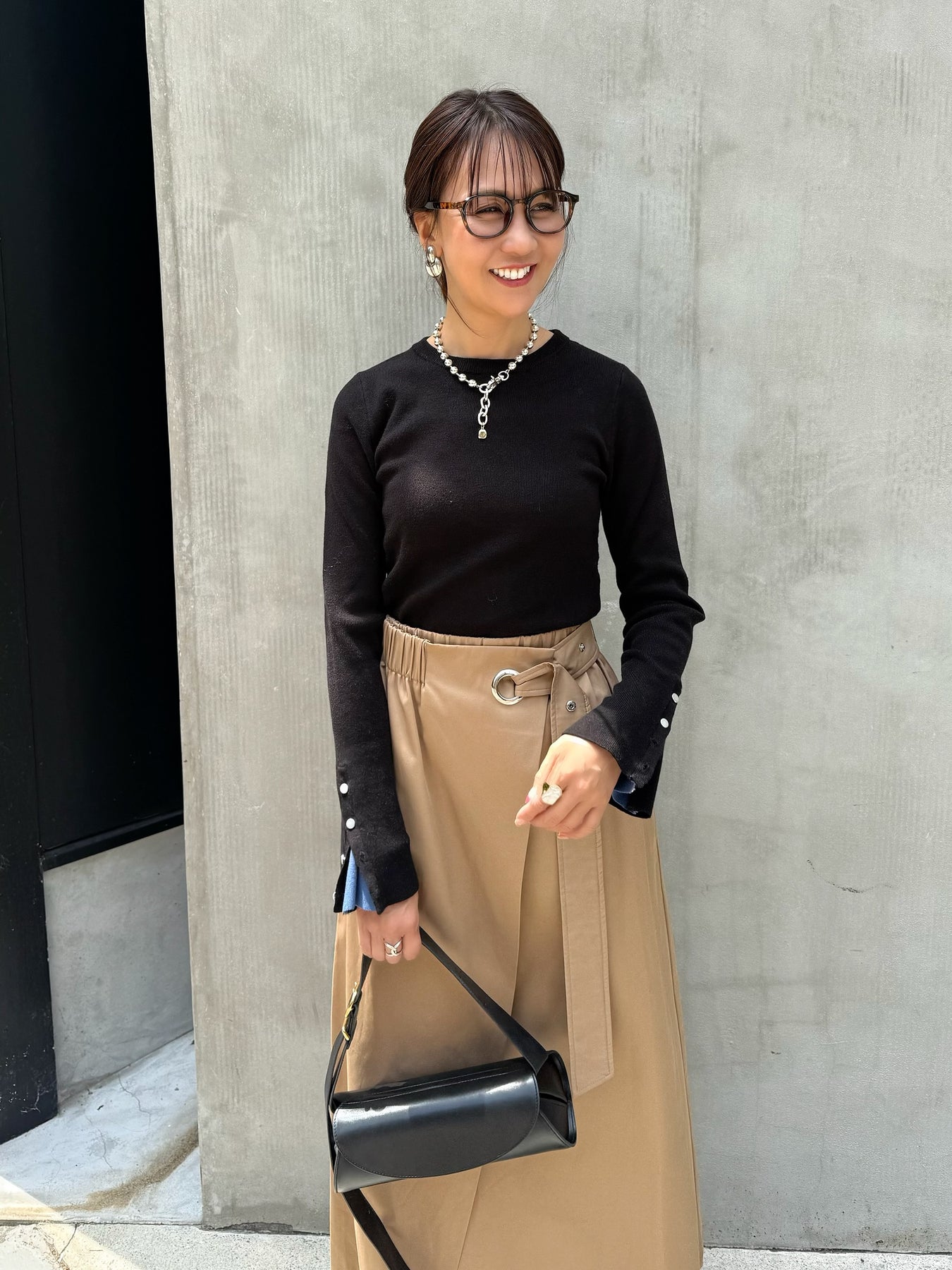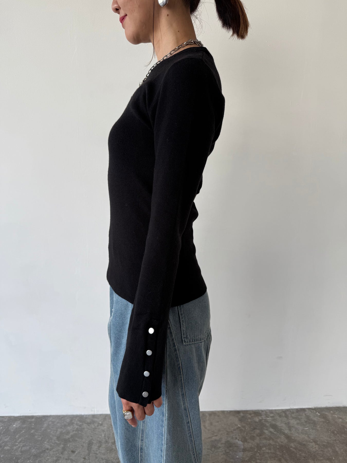 配色デザインがトレンド感のあるニットトップス。袖ボタンを外した時は、フレアー袖に配色デザインがシンプルながら一癖あるデザインに。ボタンは留めてベーシックに着用することも可能です。1枚でもインナーとしても使いやすいアイテムです。素材は、もっちりとした肌触りの良い素材となります。秋冬に大活躍してくれます。