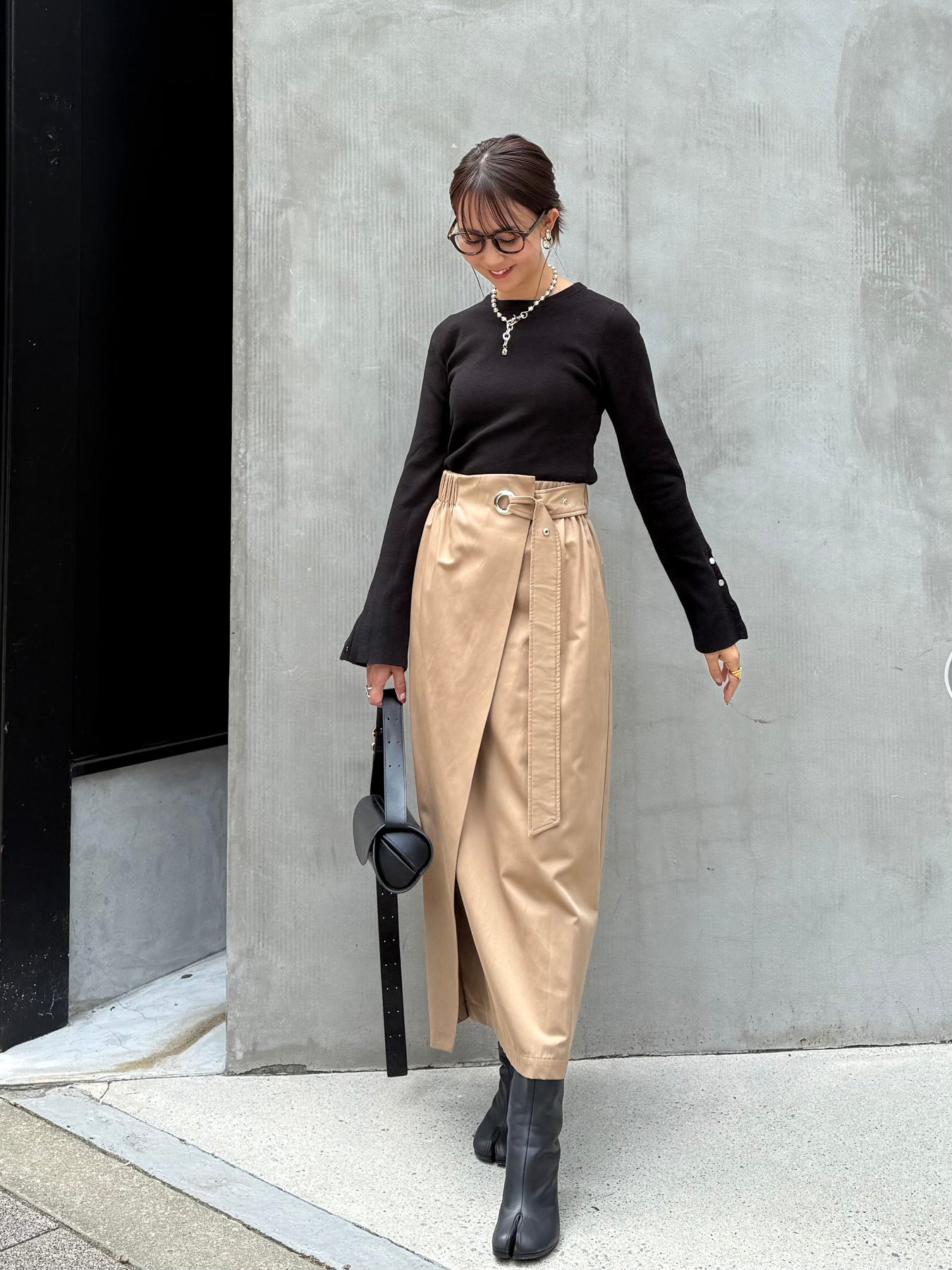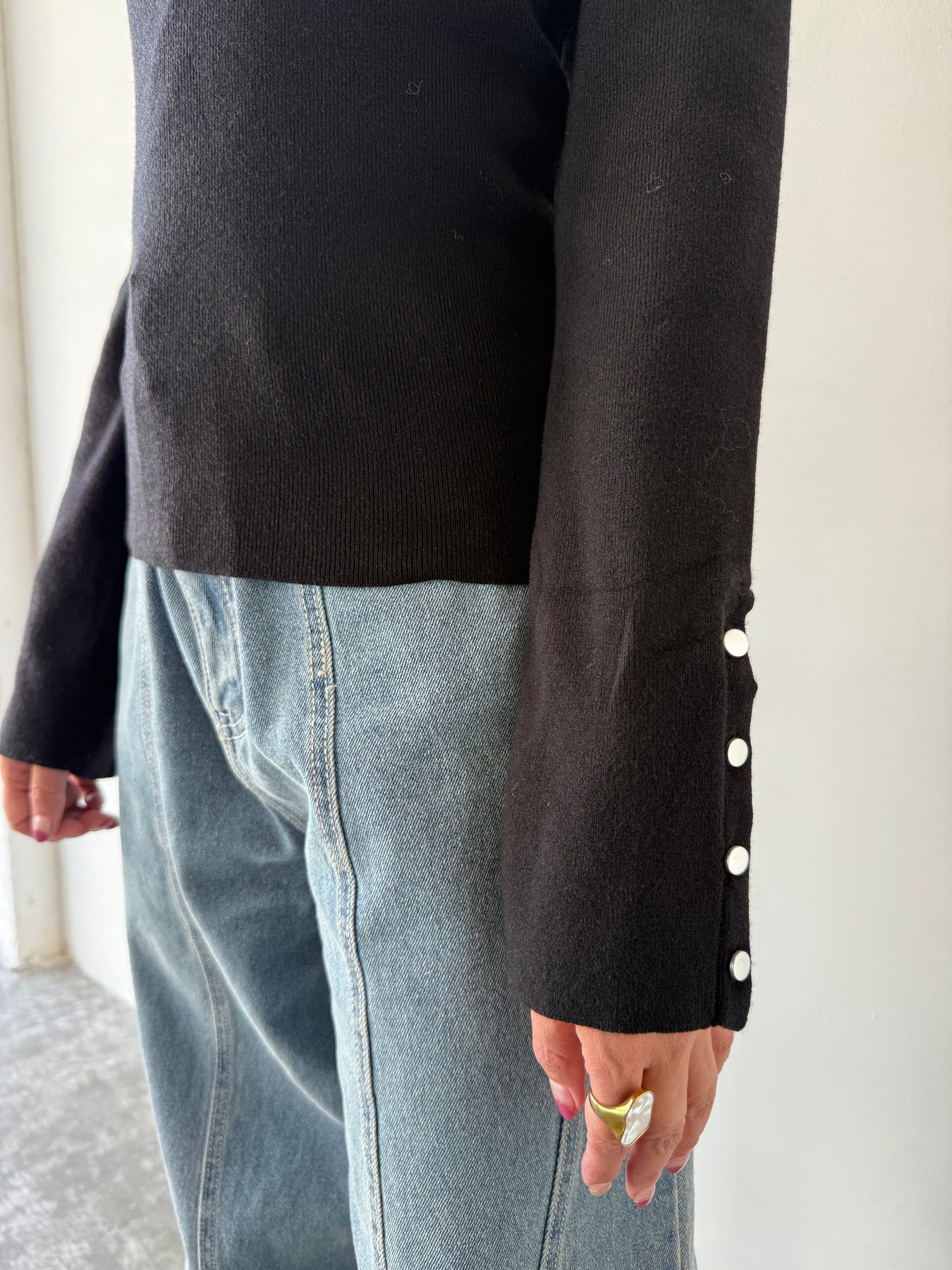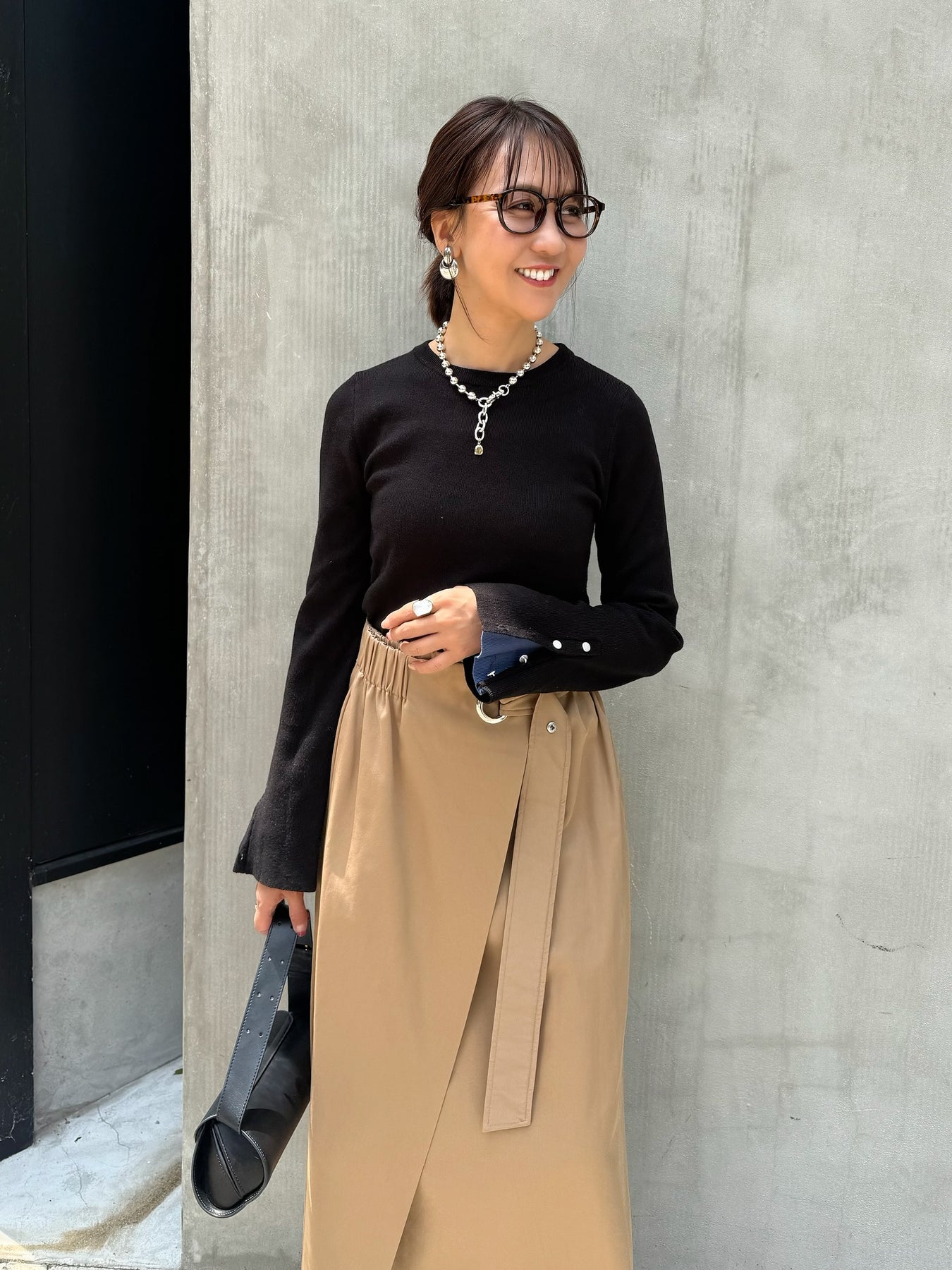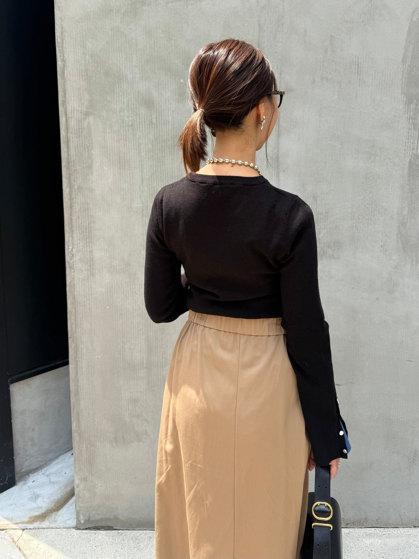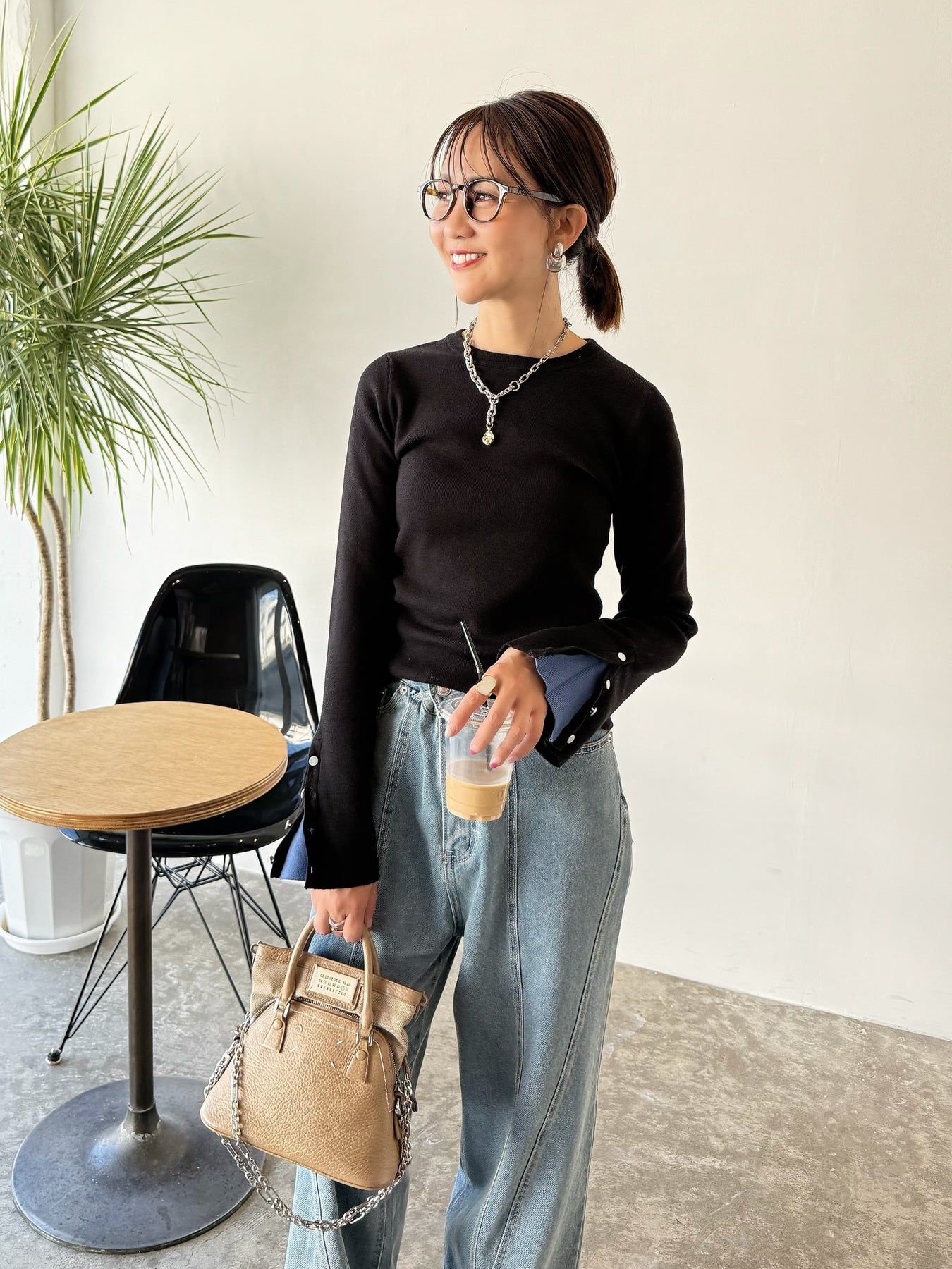 配色デザインがトレンド感のあるニットトップス。袖ボタンを外した時は、フレアー袖に配色デザインがシンプルながら一癖あるデザインに。ボタンは留めてベーシックに着用することも可能です。1枚でもインナーとしても使いやすいアイテムです。素材は、もっちりとした肌触りの良い素材となります。秋冬に大活躍してくれます。