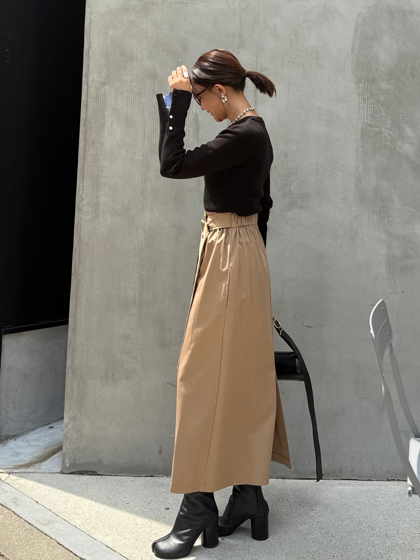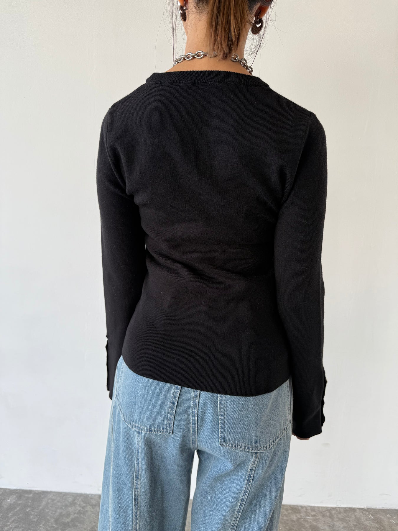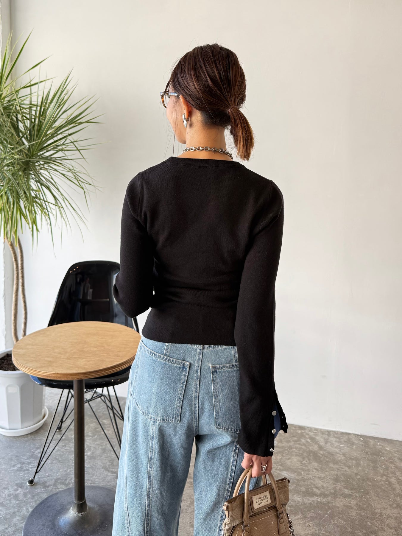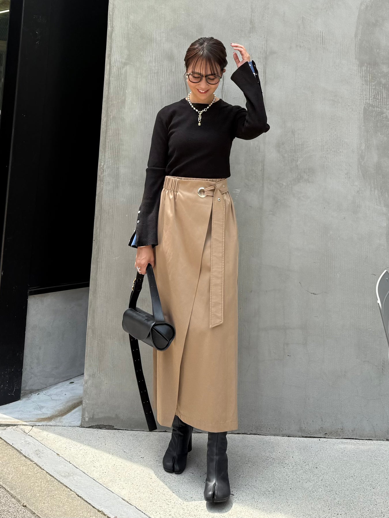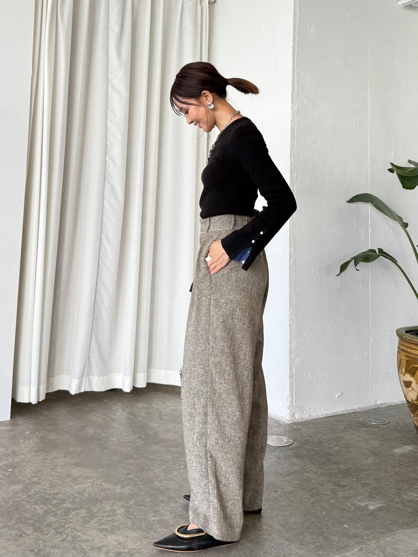 配色デザインがトレンド感のあるニットトップス。袖ボタンを外した時は、フレアー袖に配色デザインがシンプルながら一癖あるデザインに。ボタンは留めてベーシックに着用することも可能です。1枚でもインナーとしても使いやすいアイテムです。素材は、もっちりとした肌触りの良い素材となります。秋冬に大活躍してくれます。