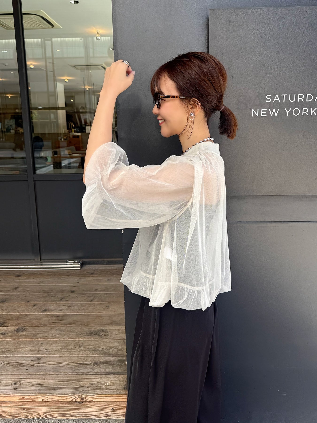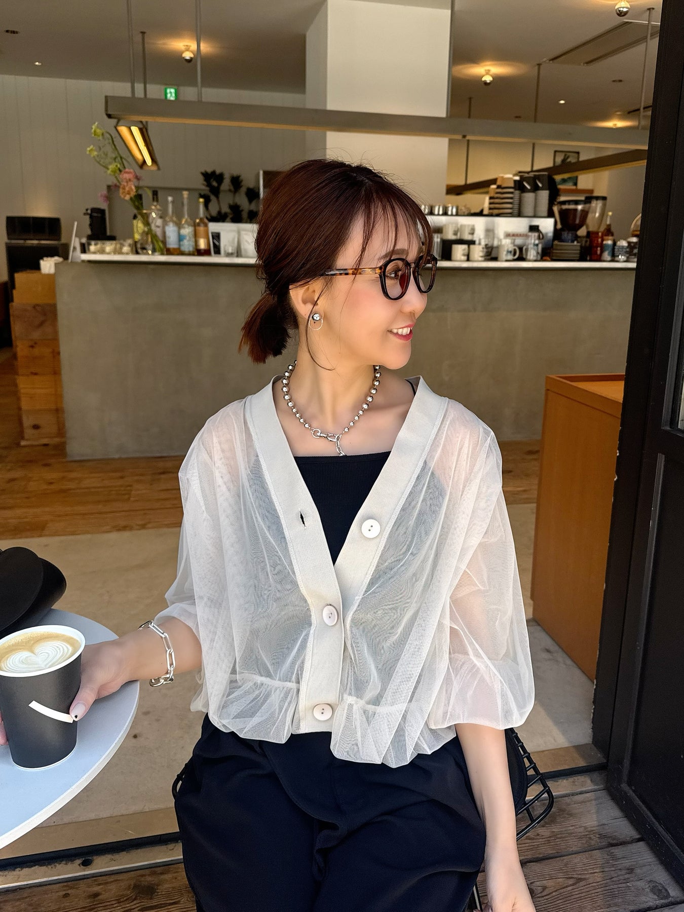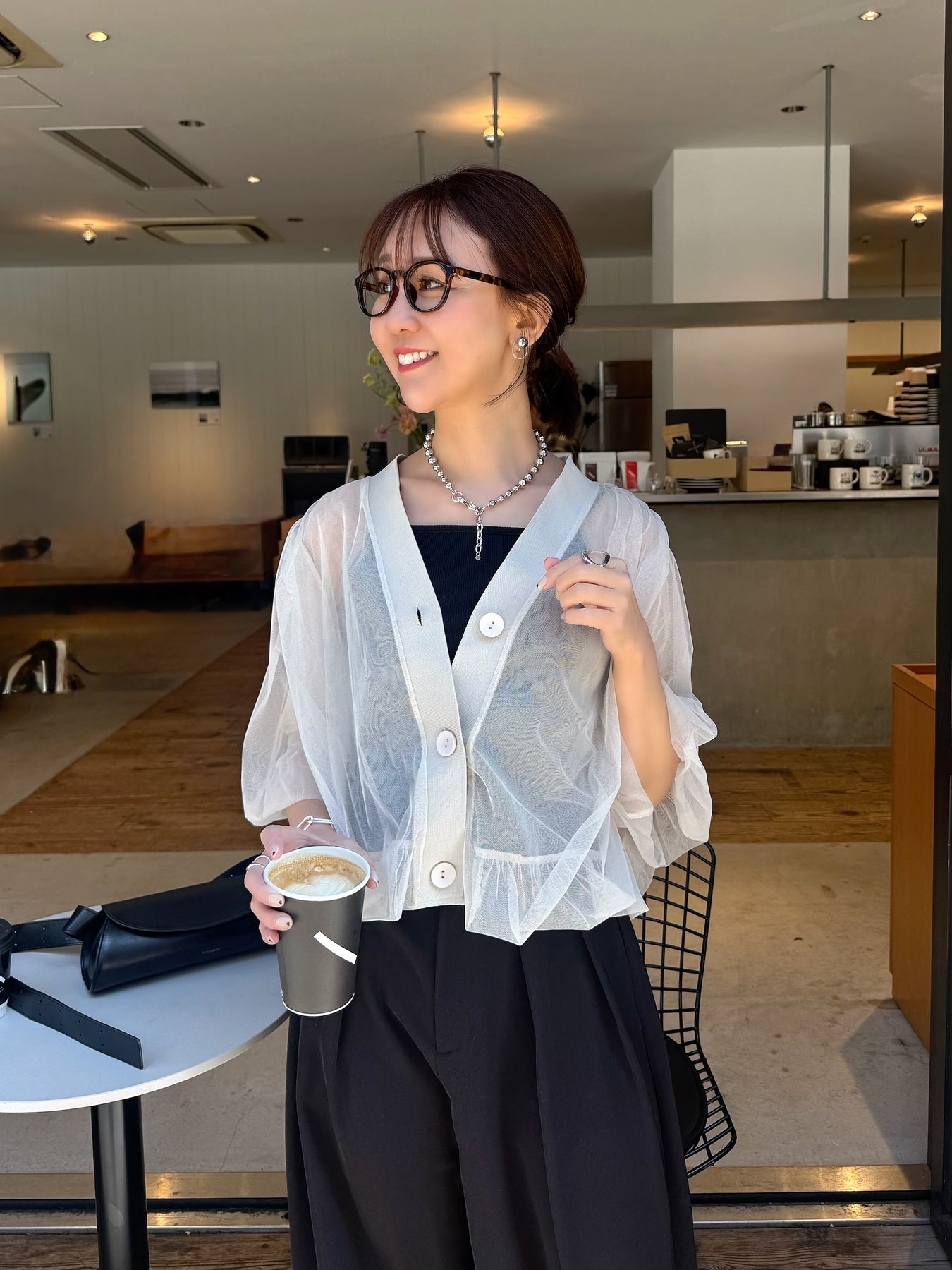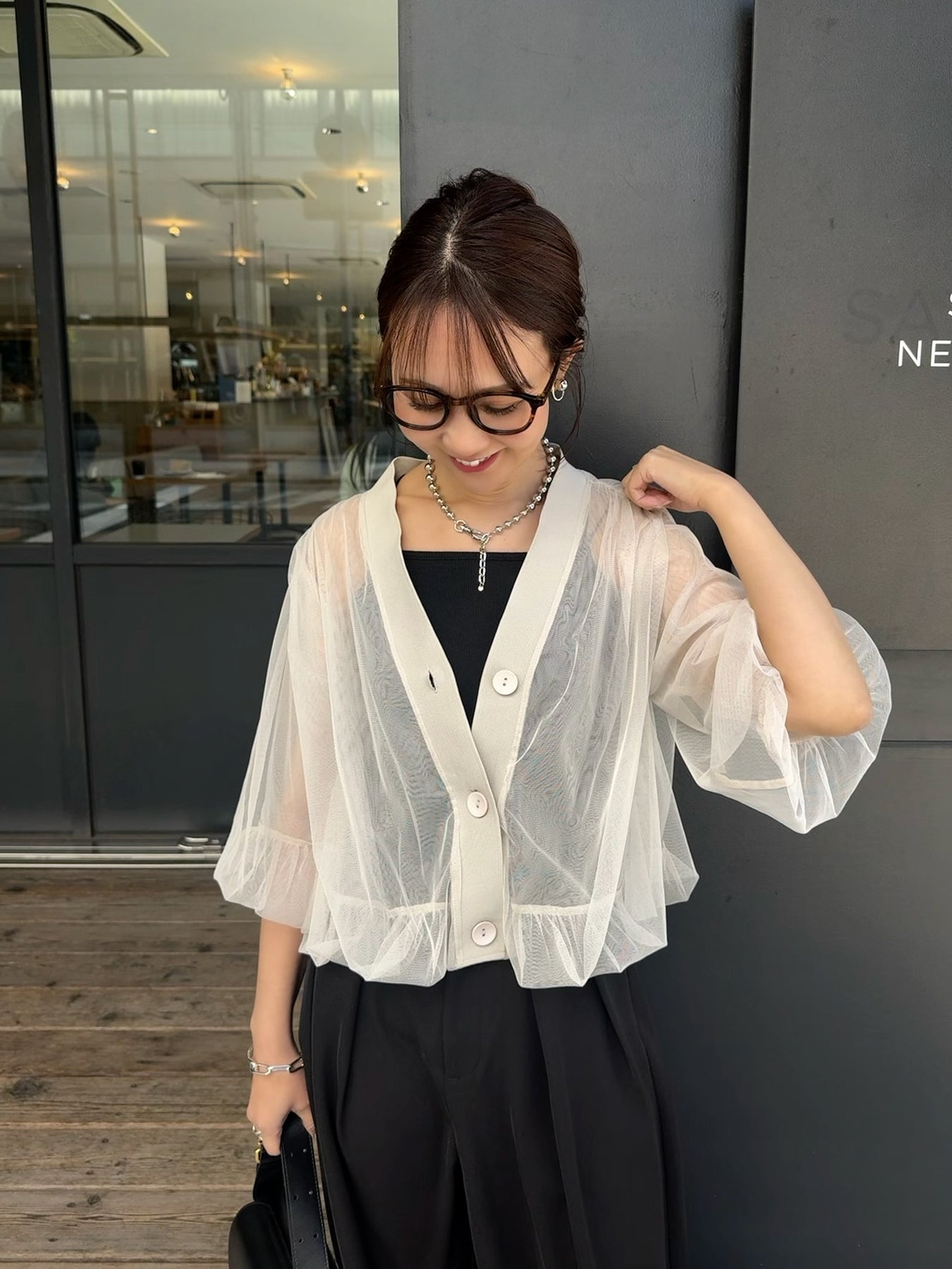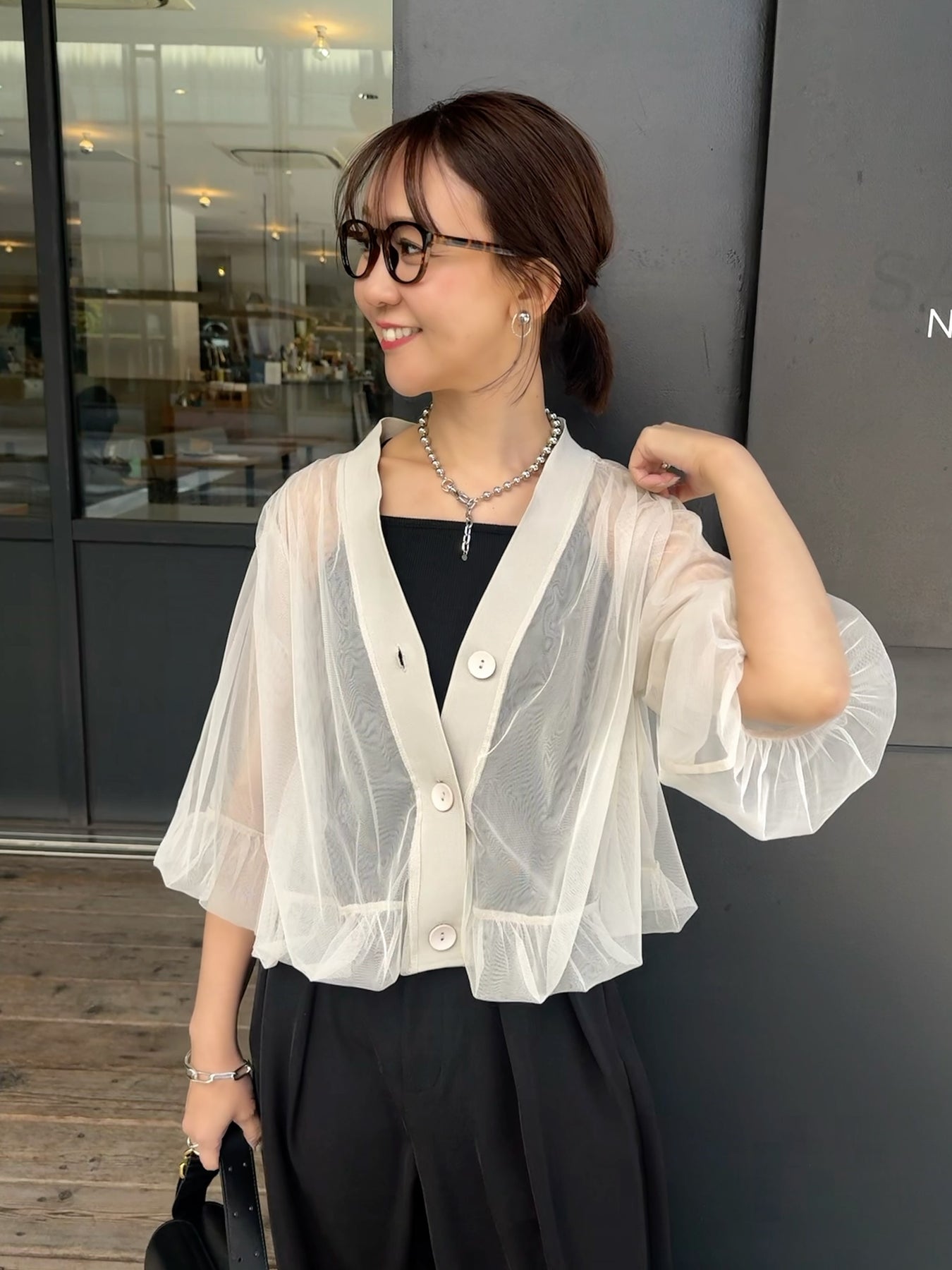 チュールをレイヤードしたカーディガン。程よいボリュームスリーブが女性らしく、袖口と裾はゴム仕様にすることで、ふんわりとした印象で着用いただけます。