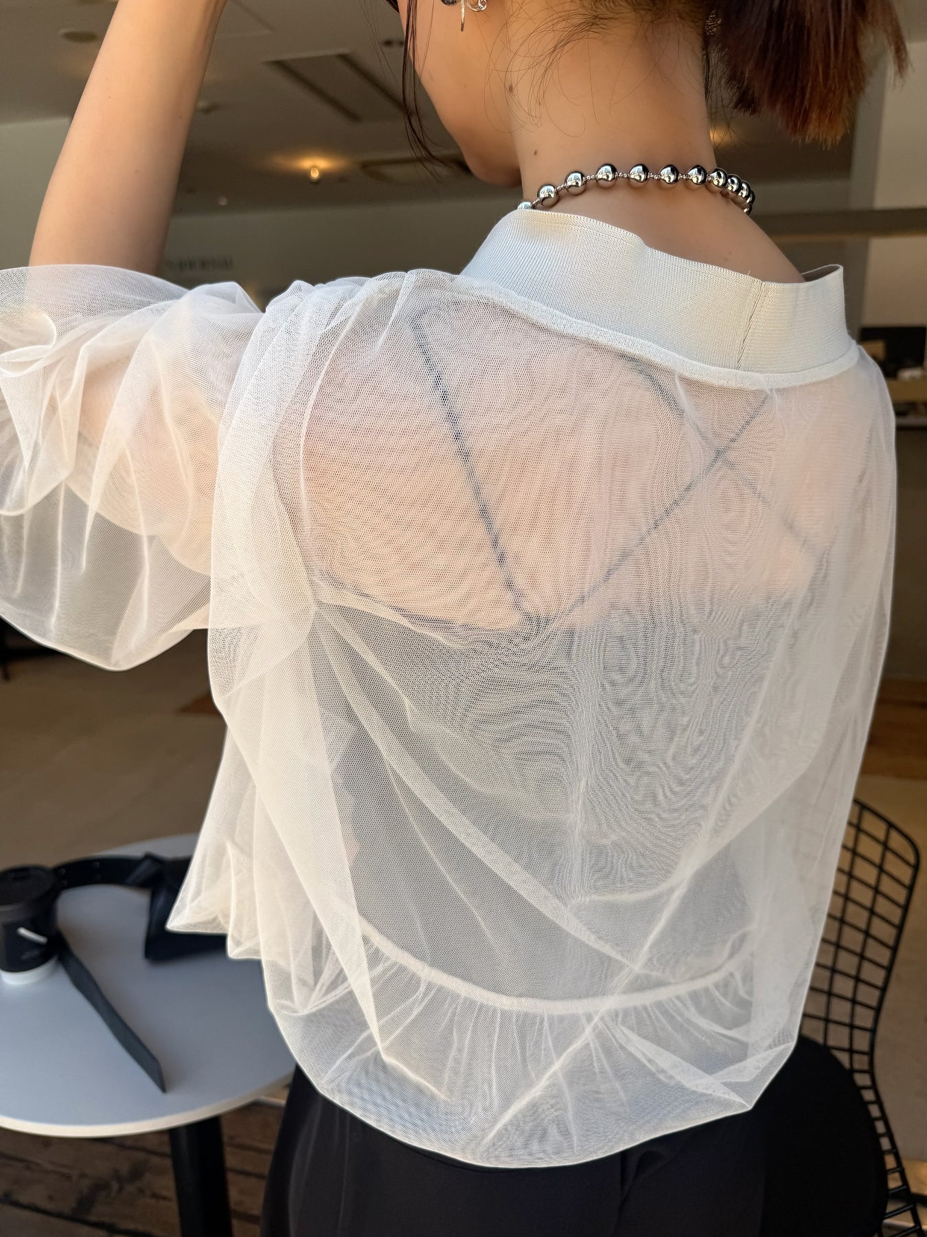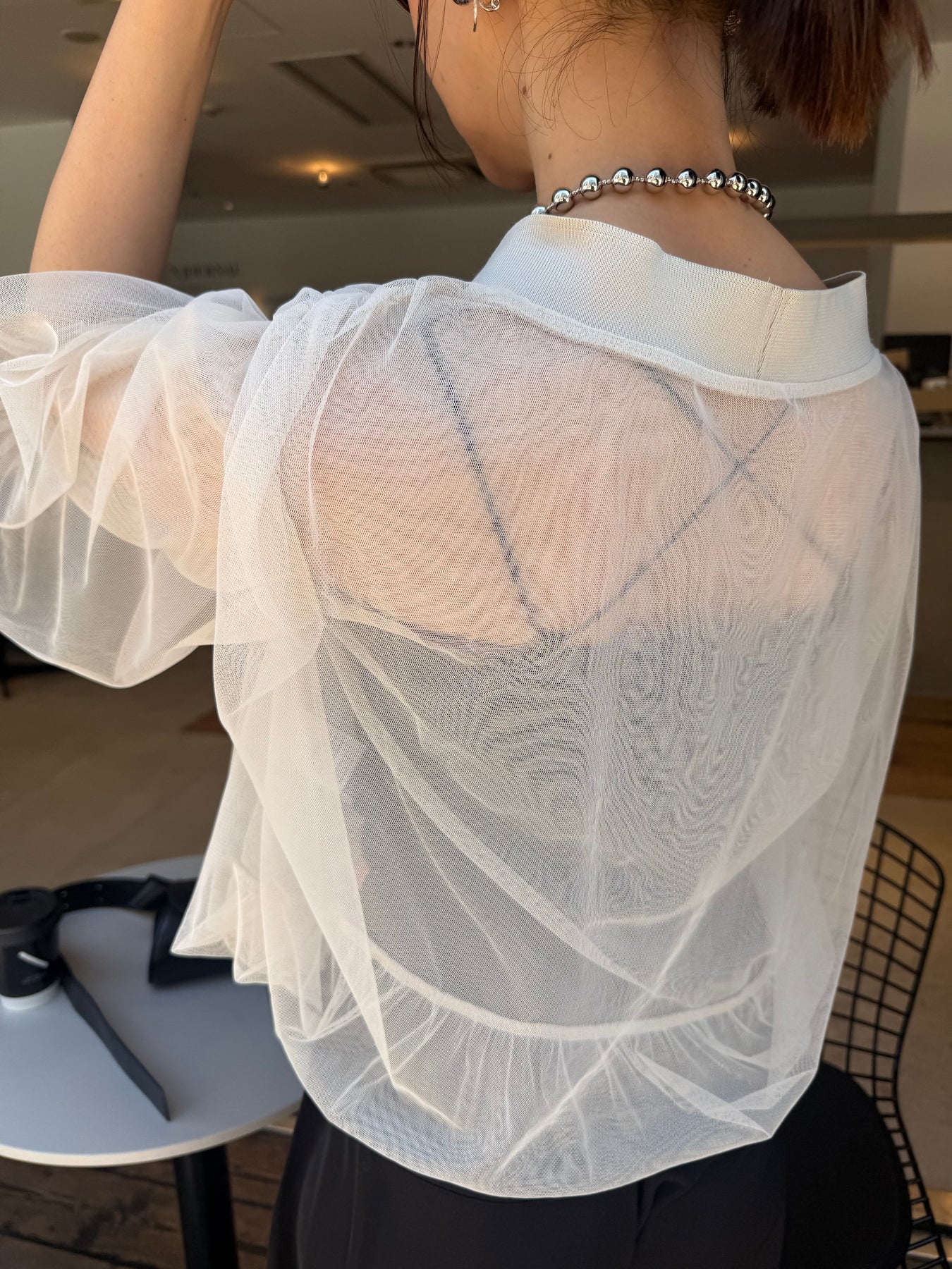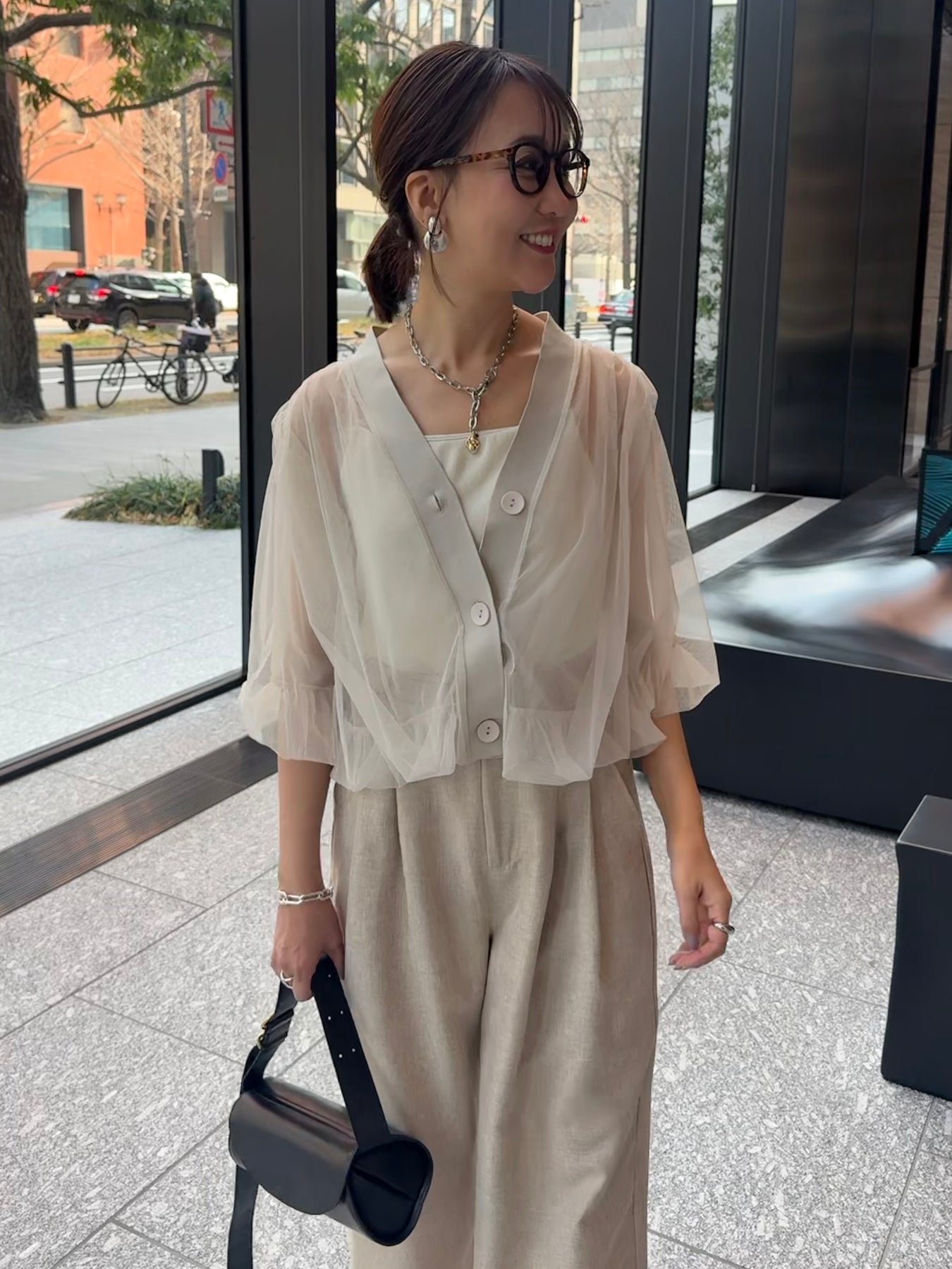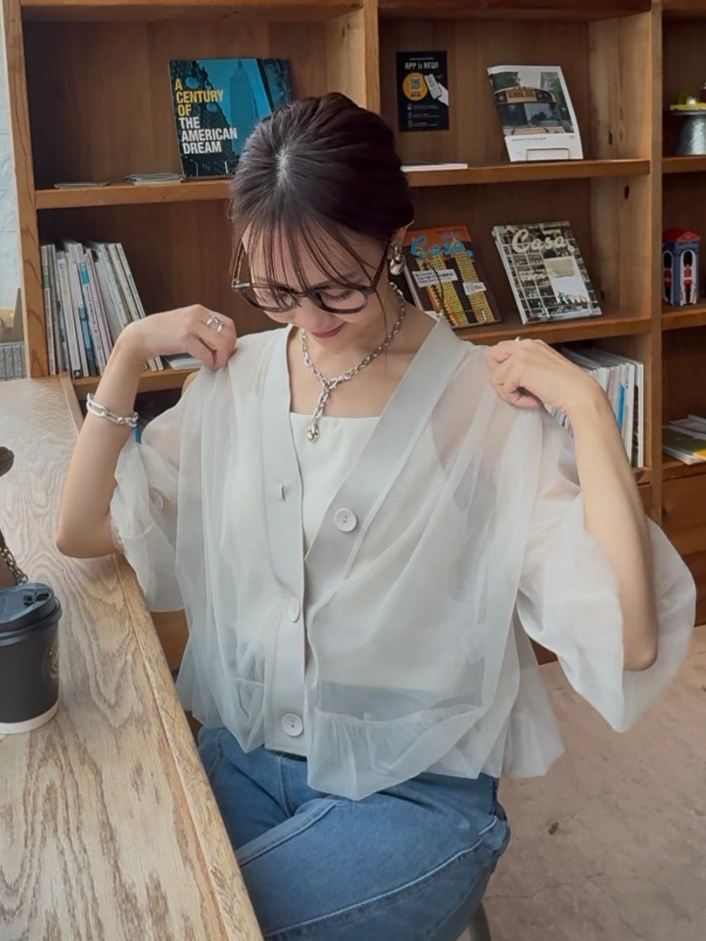 チュールをレイヤードしたカーディガン。程よいボリュームスリーブが女性らしく、袖口と裾はゴム仕様にすることで、ふんわりとした印象で着用いただけます。