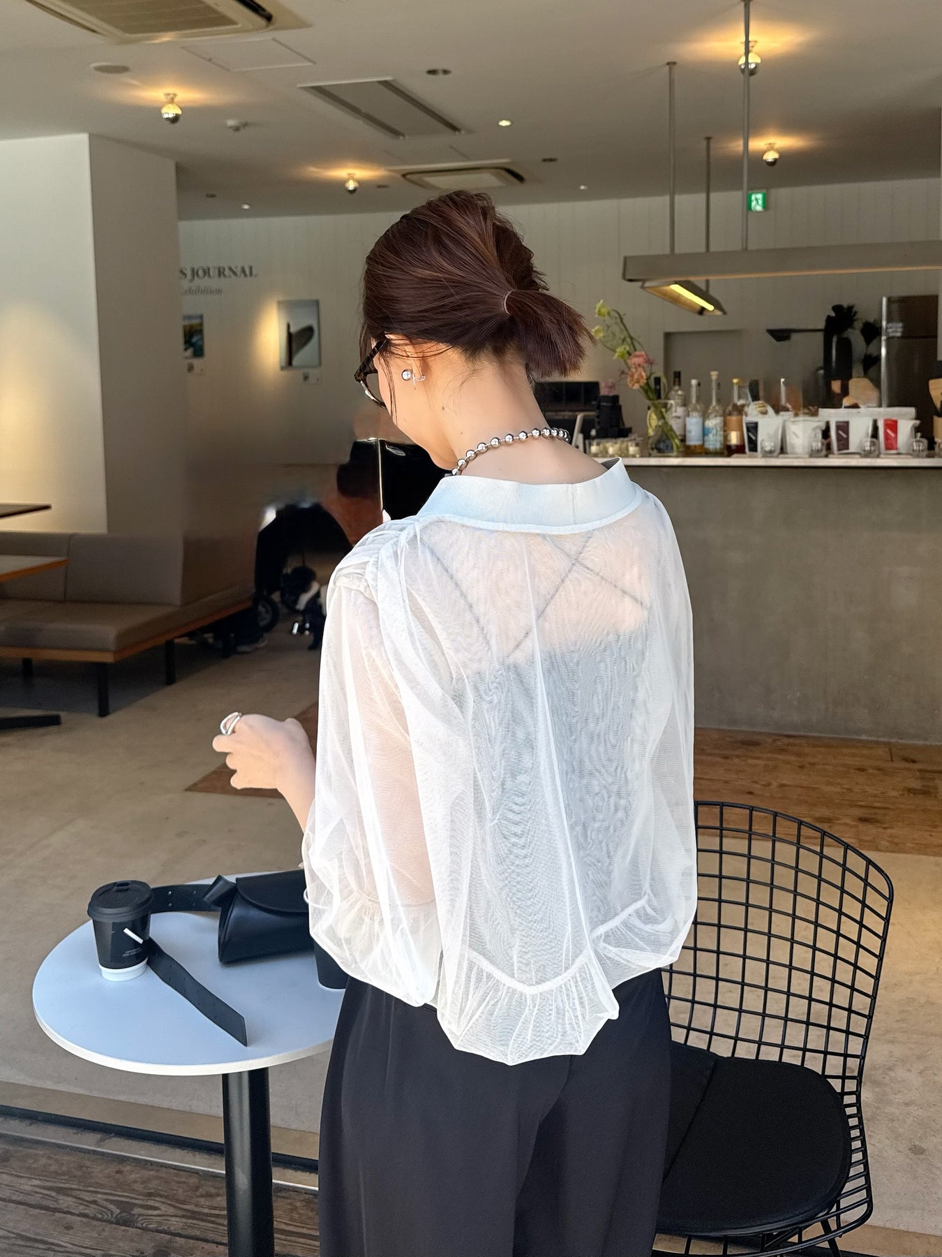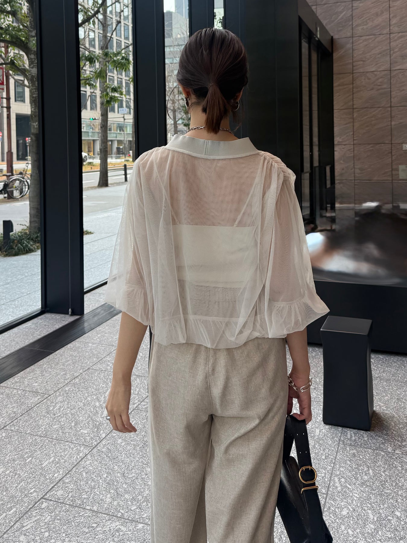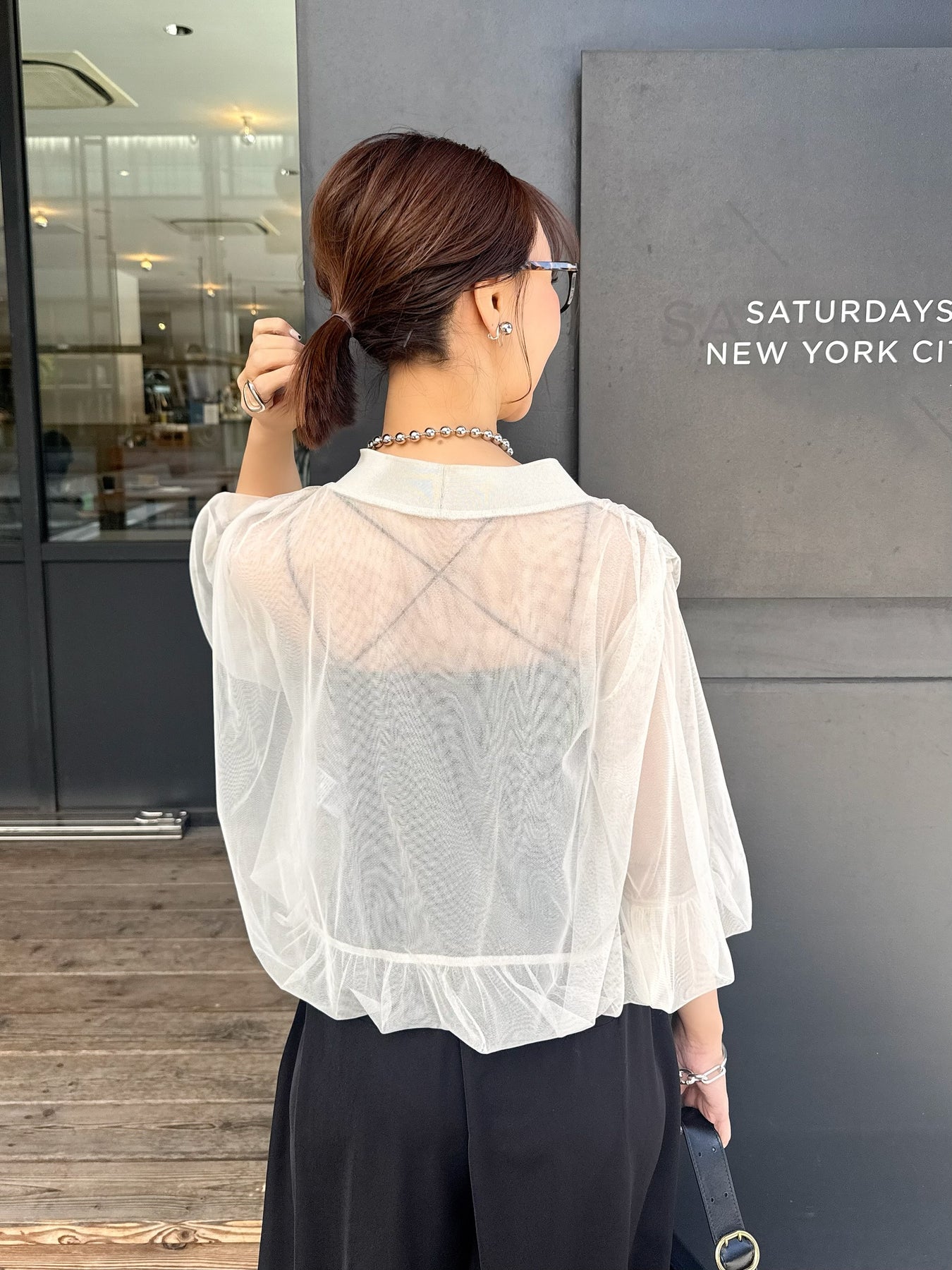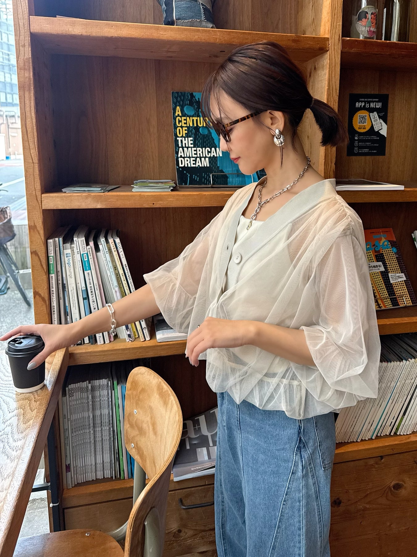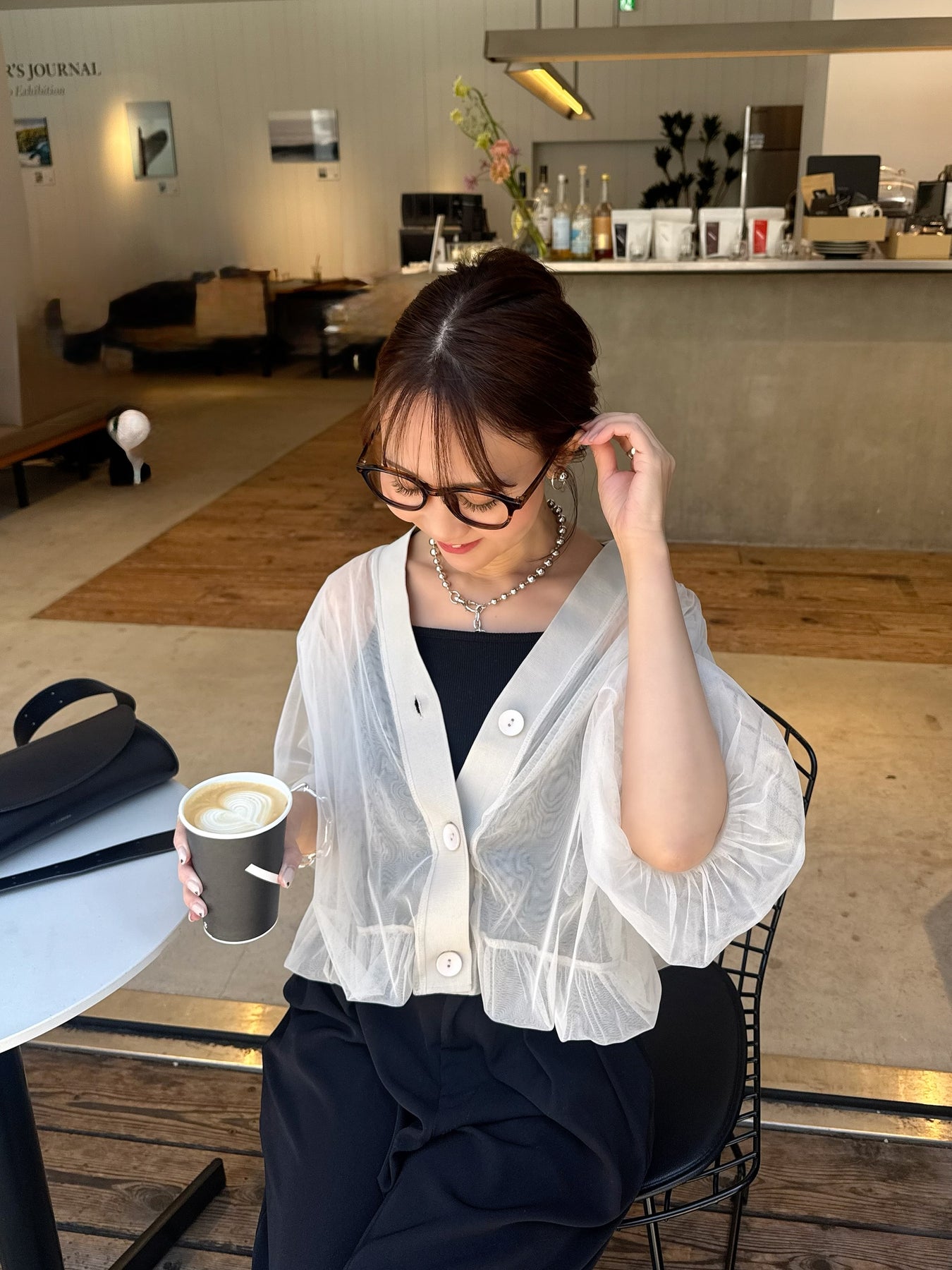 チュールをレイヤードしたカーディガン。程よいボリュームスリーブが女性らしく、袖口と裾はゴム仕様にすることで、ふんわりとした印象で着用いただけます。