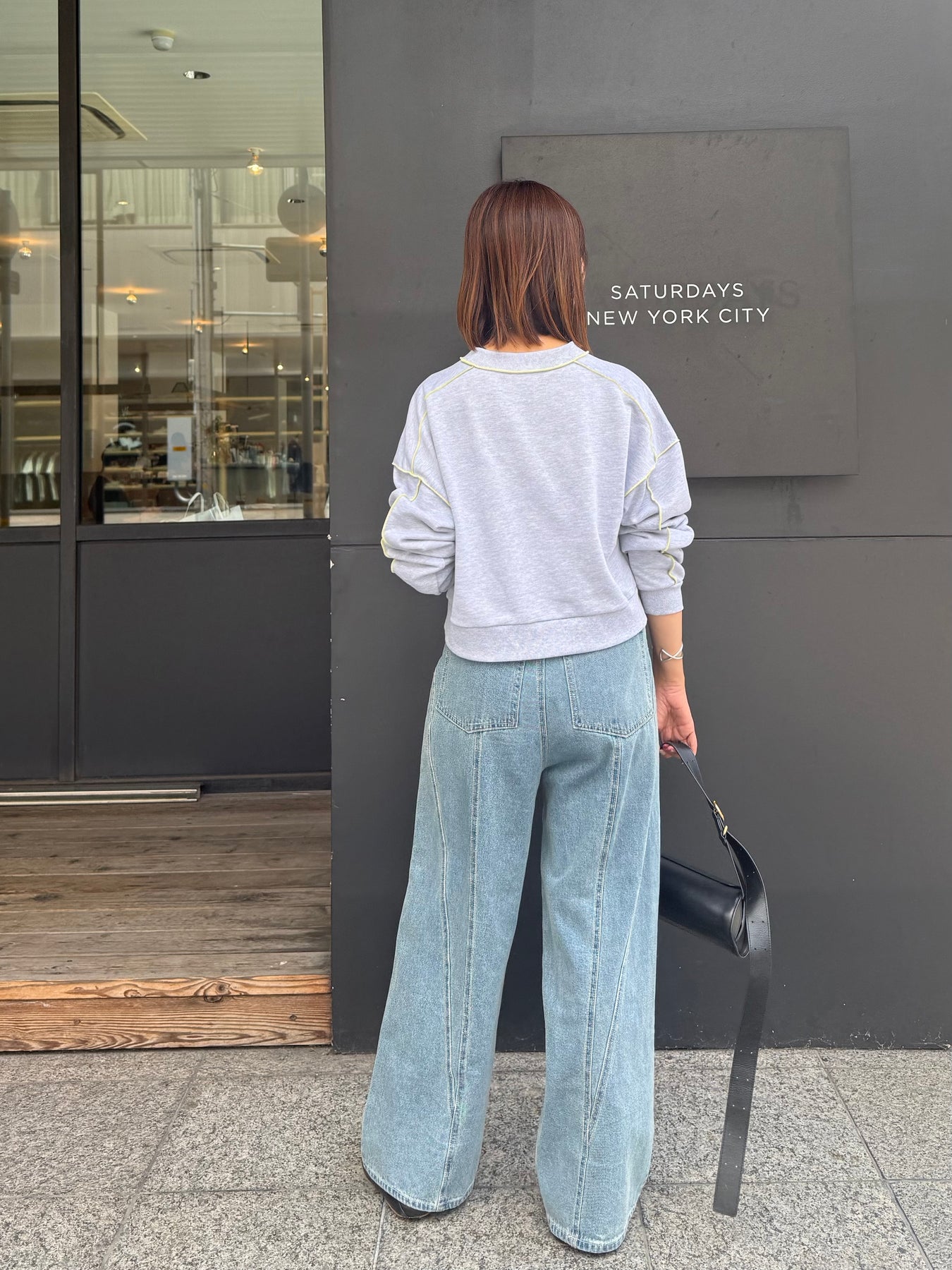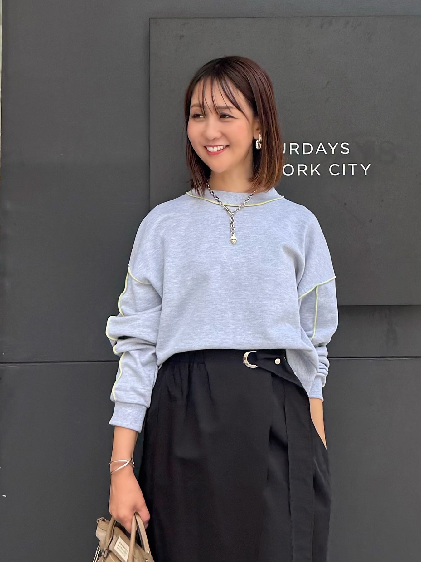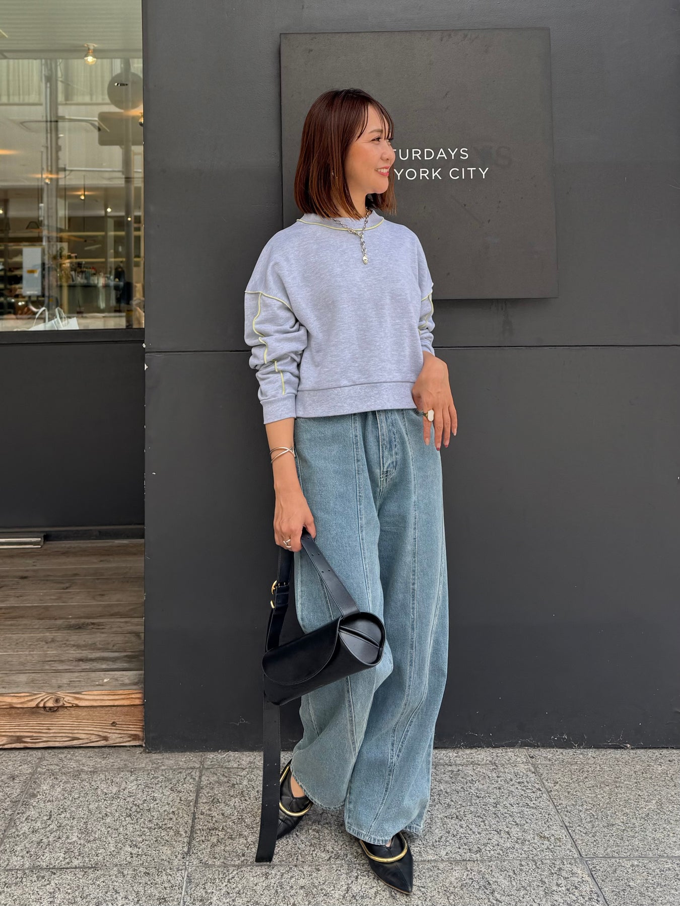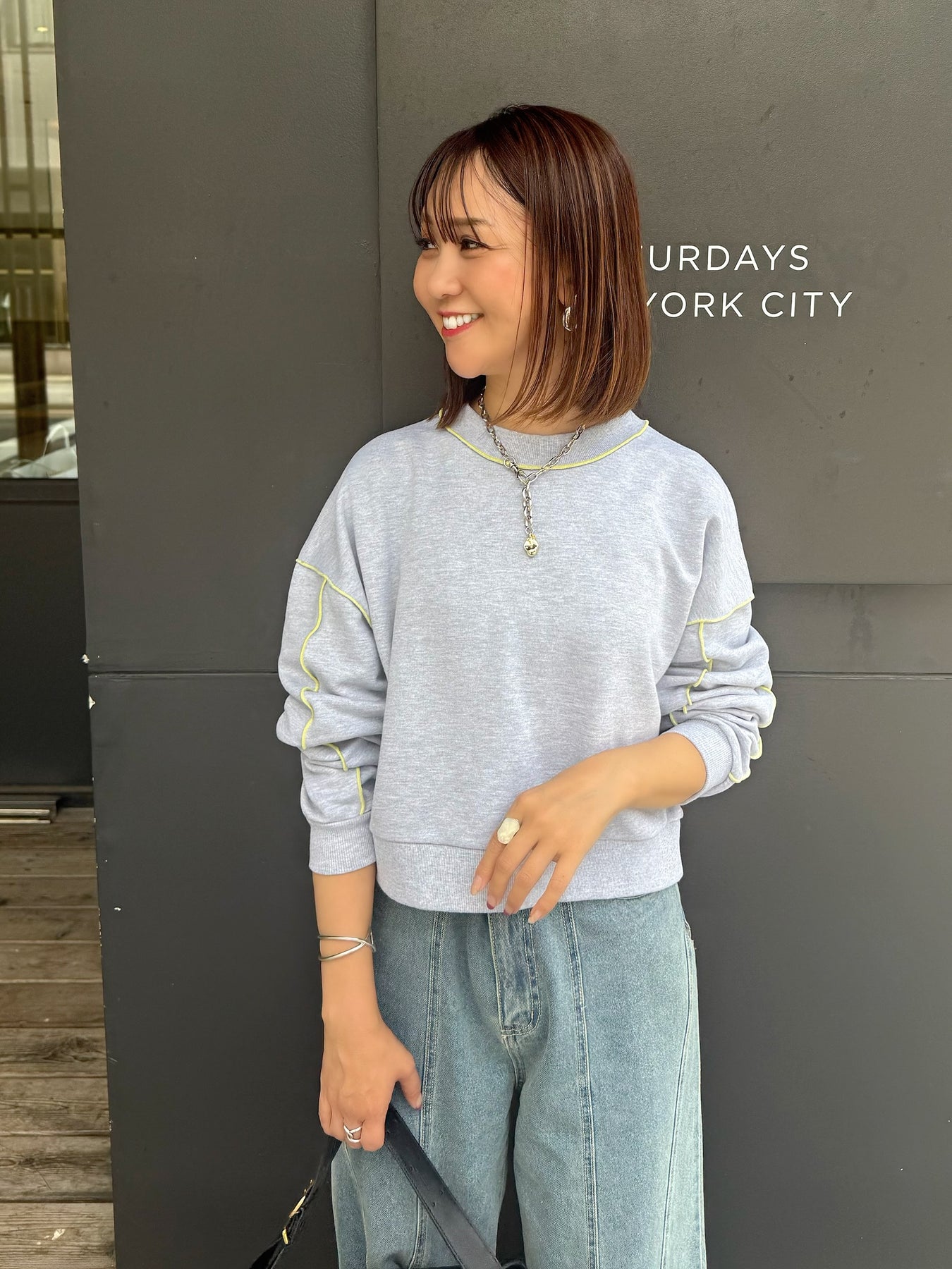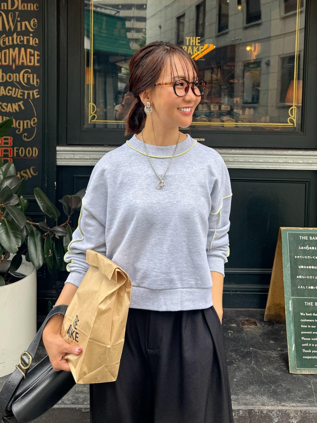 配色メローデザインが目を引く、クロップド丈のスウェット。すっきりとしたショート丈のシルエットは、どんなボトムにも合わせやすく、足が長くみえるようにデザインされています。カジュアルに見えがちなスウェット素材も、綺麗な印象を与えてくれる1枚。程よく肉厚のさらりとした素材感が綺麗めボトムとの相性もバツグンです。