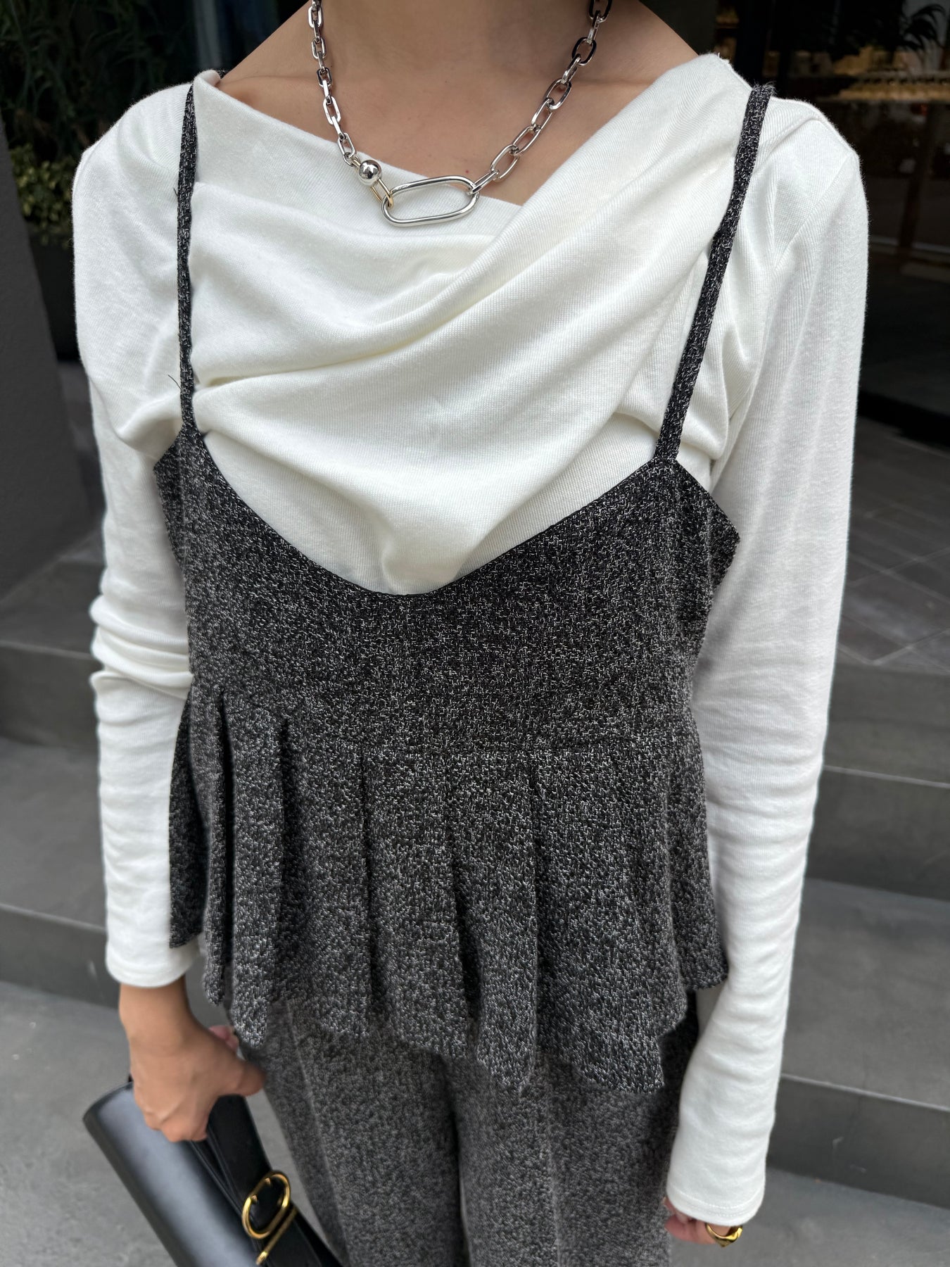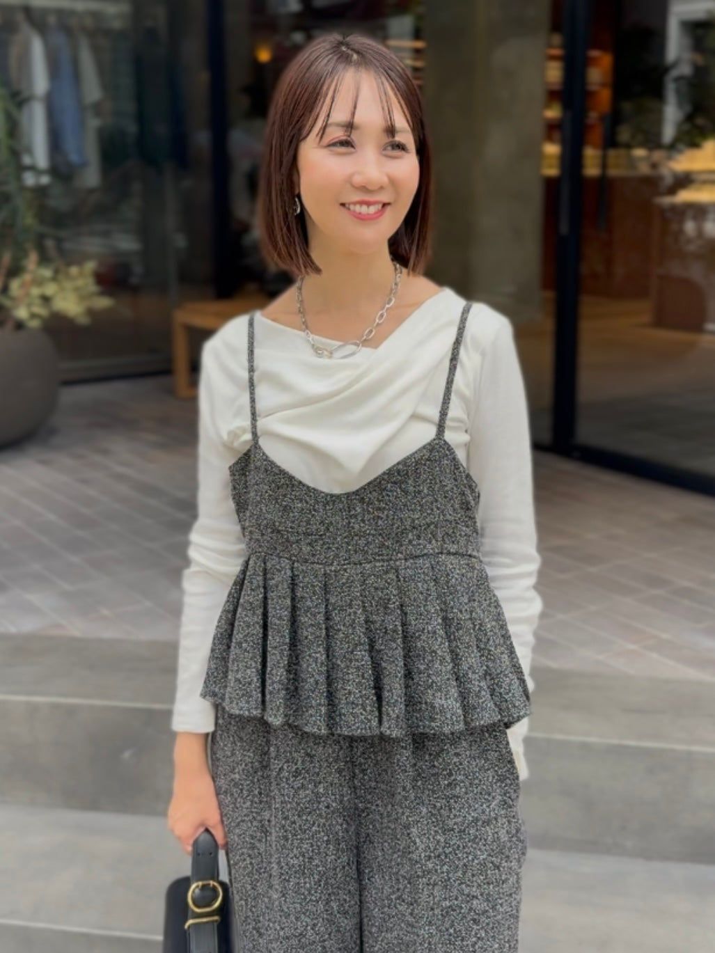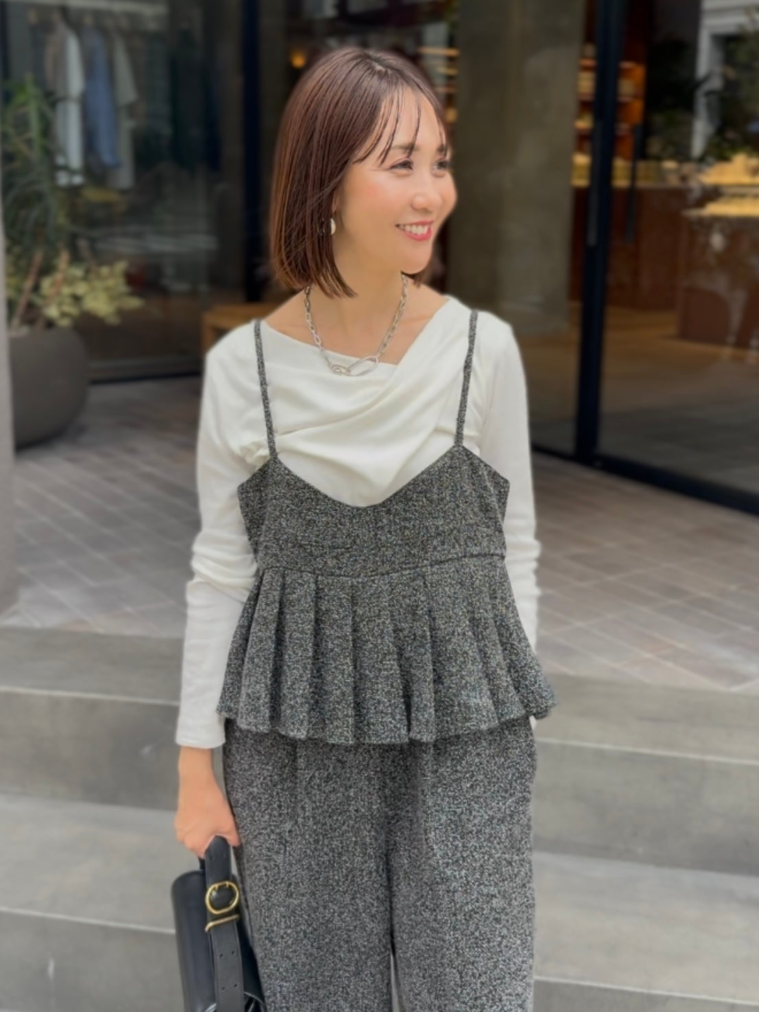 ビスチェ風のコンパクトなトップに、裾にかけてのプリーツデザインが女性らしい印象に。パンツはワイド過ぎないストレートシルエット。ウエスト位置を高めに設定することで、脚が長く見えるのも嬉しいポイント。インナー次第でロングシーズン活躍してるアイテムです。
