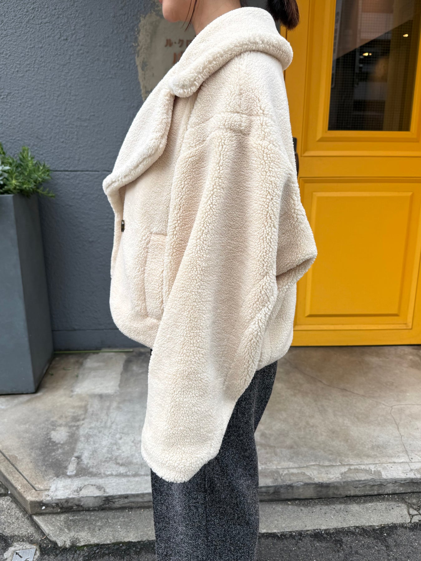 暖かみのある柔らかな素材感が可愛いボア素材のショートジャケット。大きめのテーラードカラーのデザインが顔周りをすっきりとみせてくれます。またショート丈のデザインなので、着膨れせず、パンツとも合わせやすいアイテムです。
