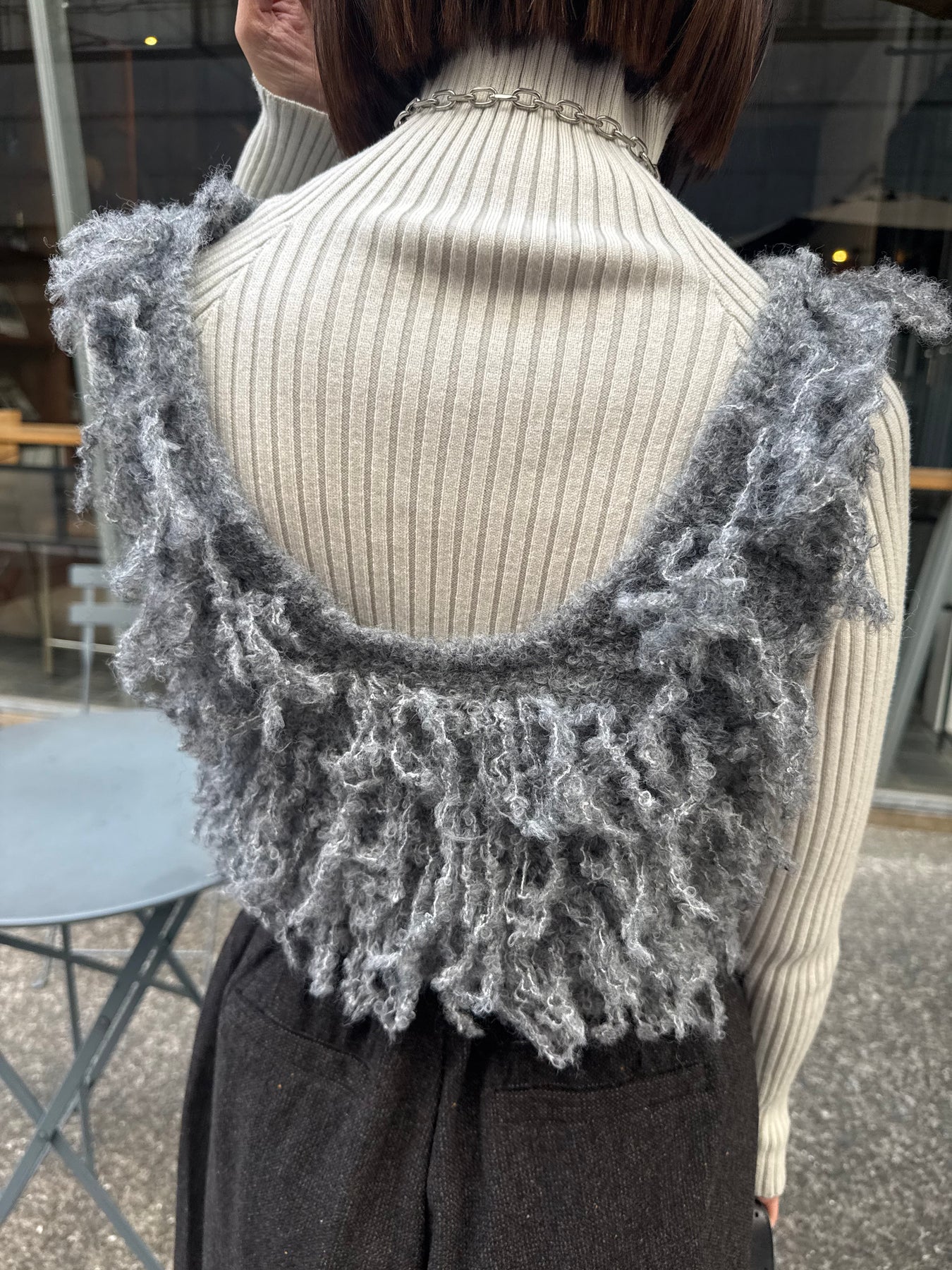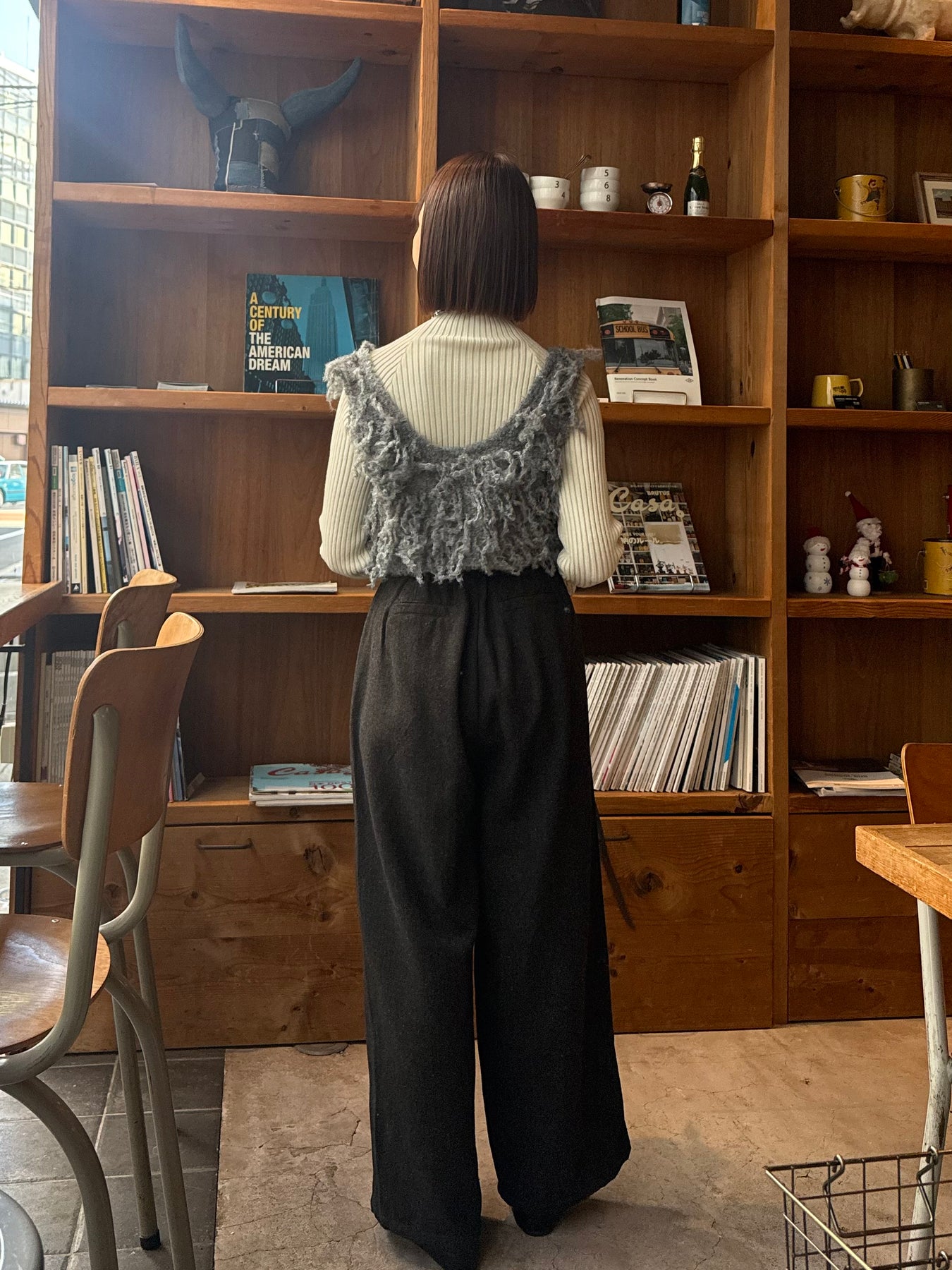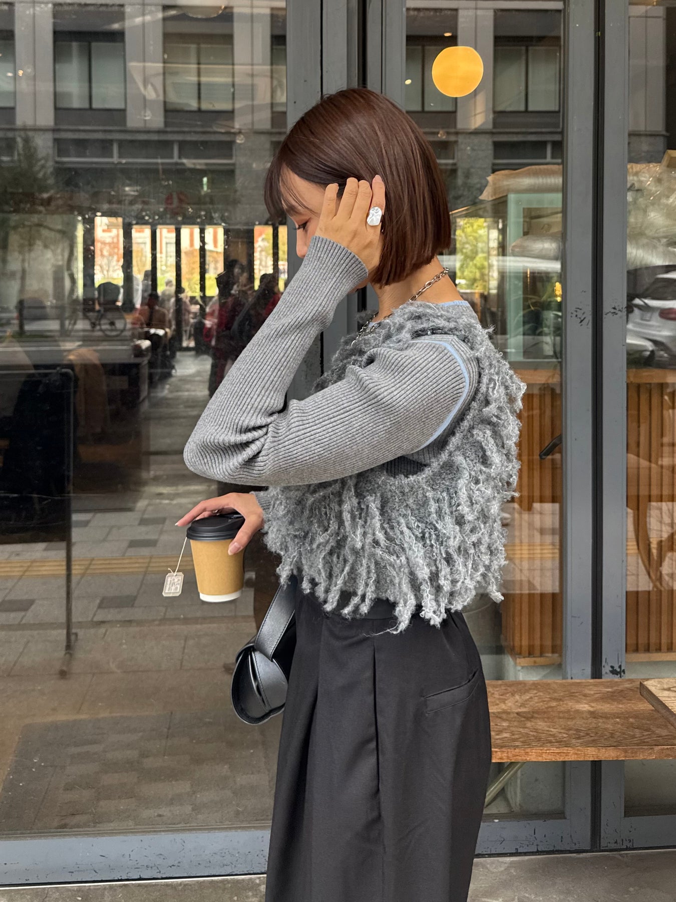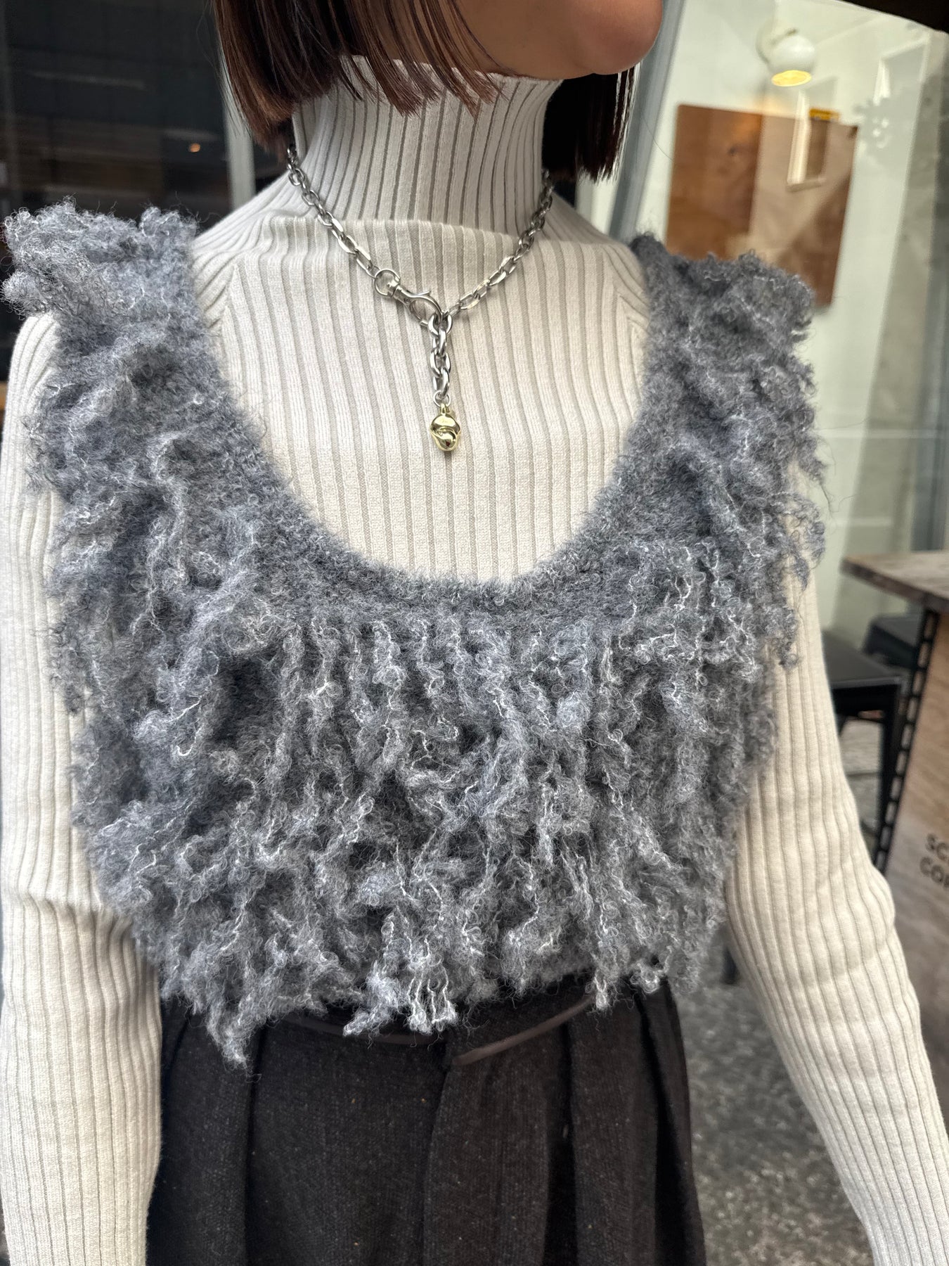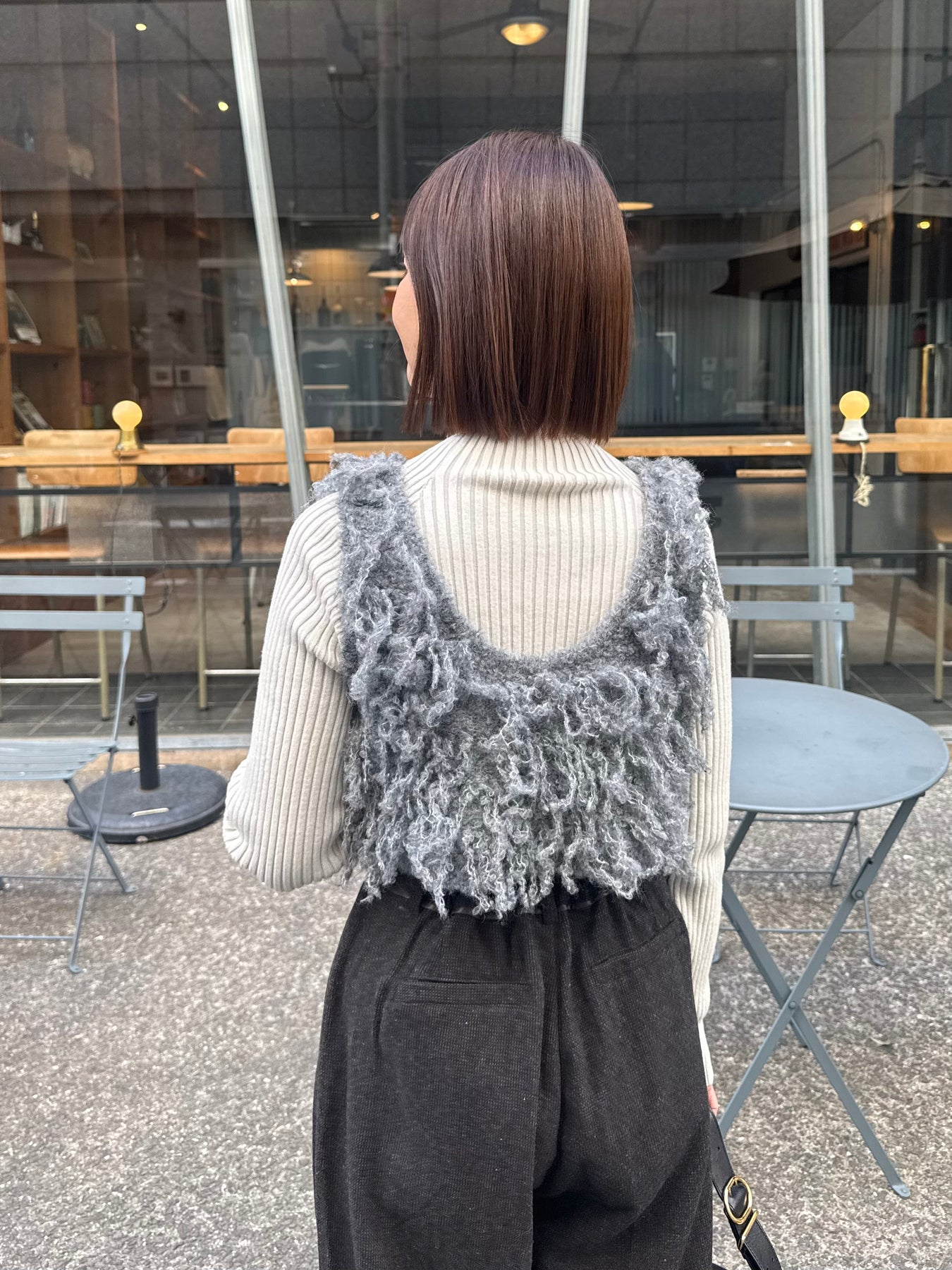 柔らかなブークレー素材で作られたビスチェ。肌触りの良い素材で着心地抜群。シンプルなインナーと合わせるだけでアクセントになるアイテムです。短めの着丈なので、ボトムとの相性も良いアイテムとなります。