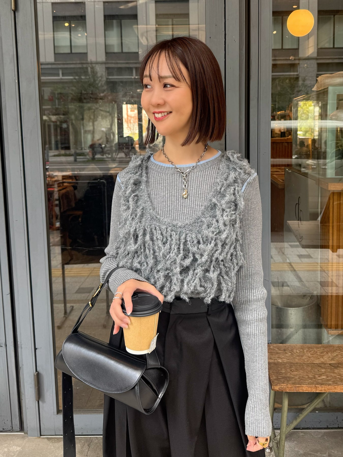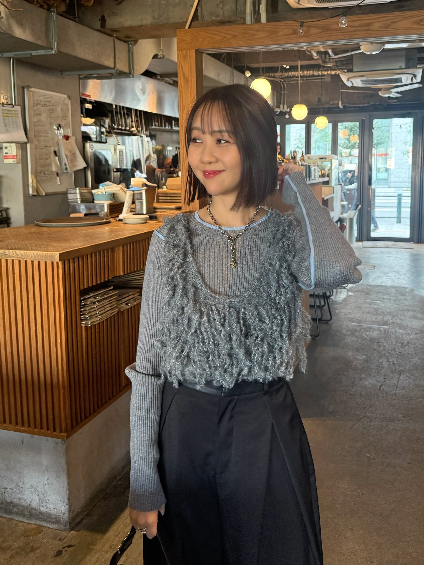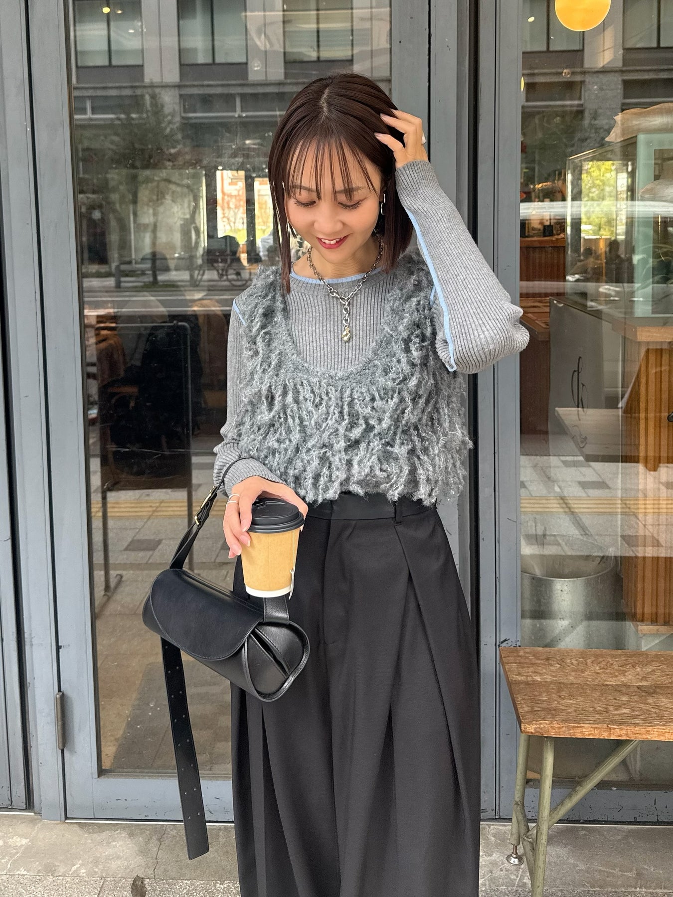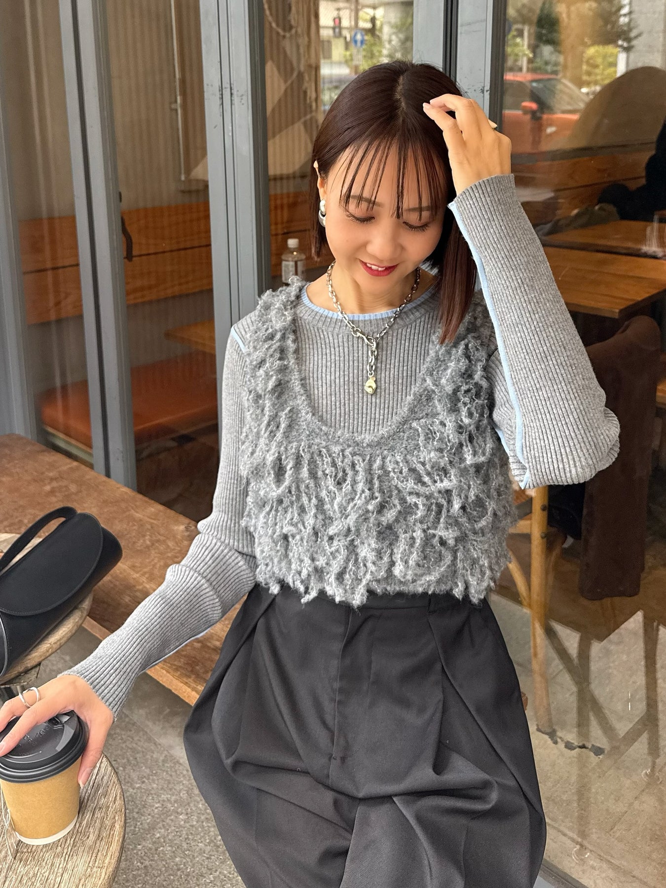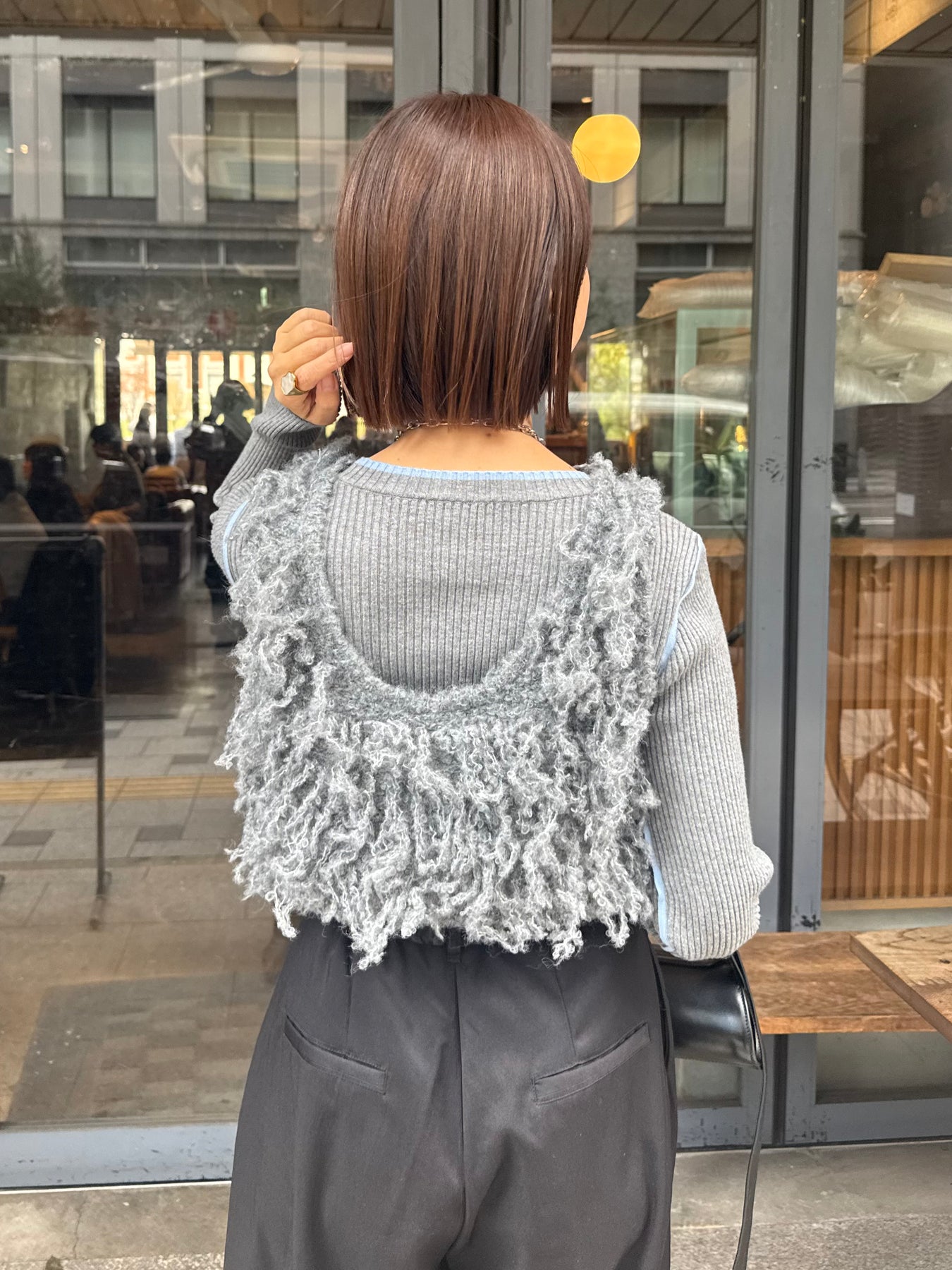 柔らかなブークレー素材で作られたビスチェ。肌触りの良い素材で着心地抜群。シンプルなインナーと合わせるだけでアクセントになるアイテムです。短めの着丈なので、ボトムとの相性も良いアイテムとなります。