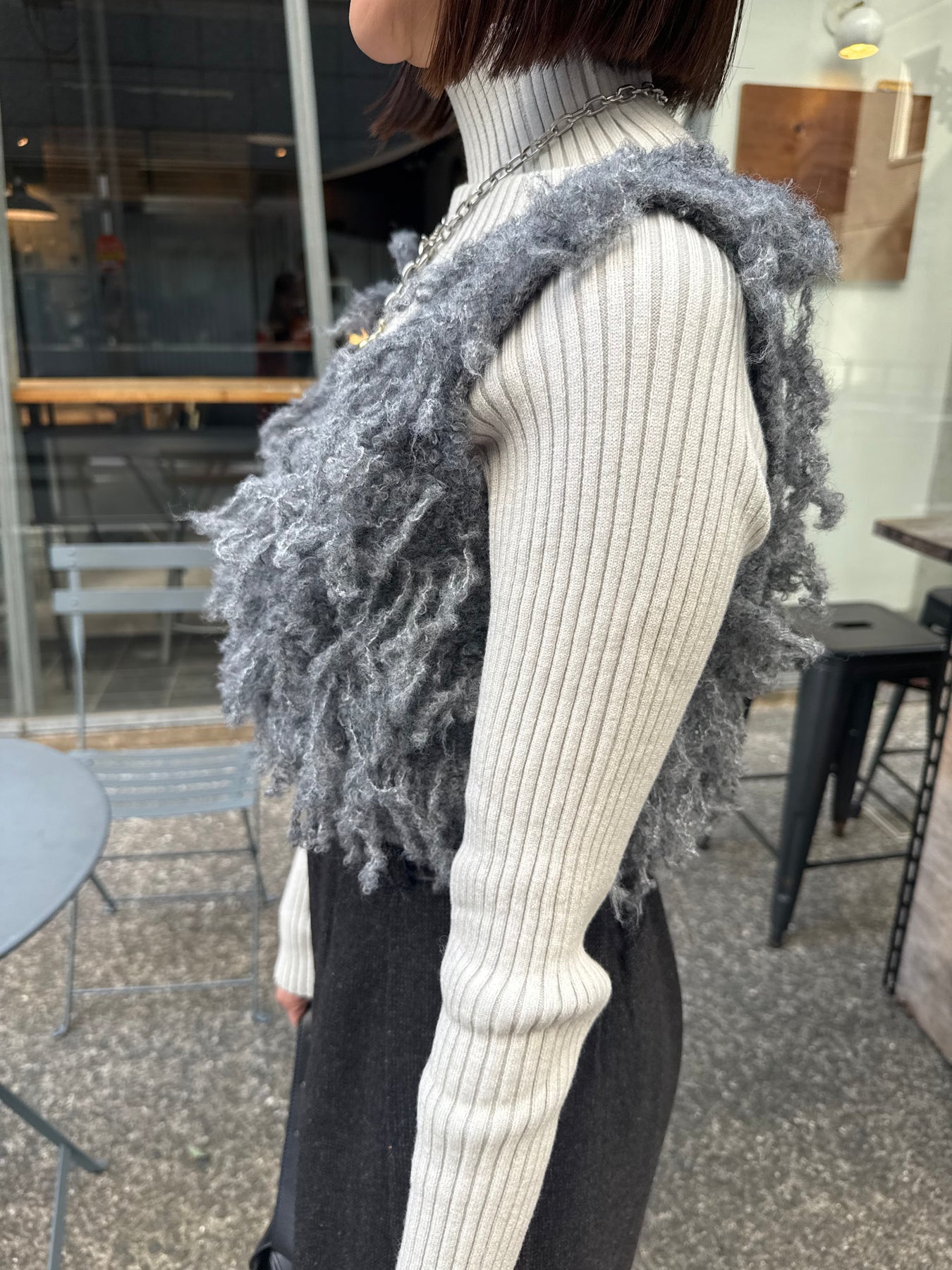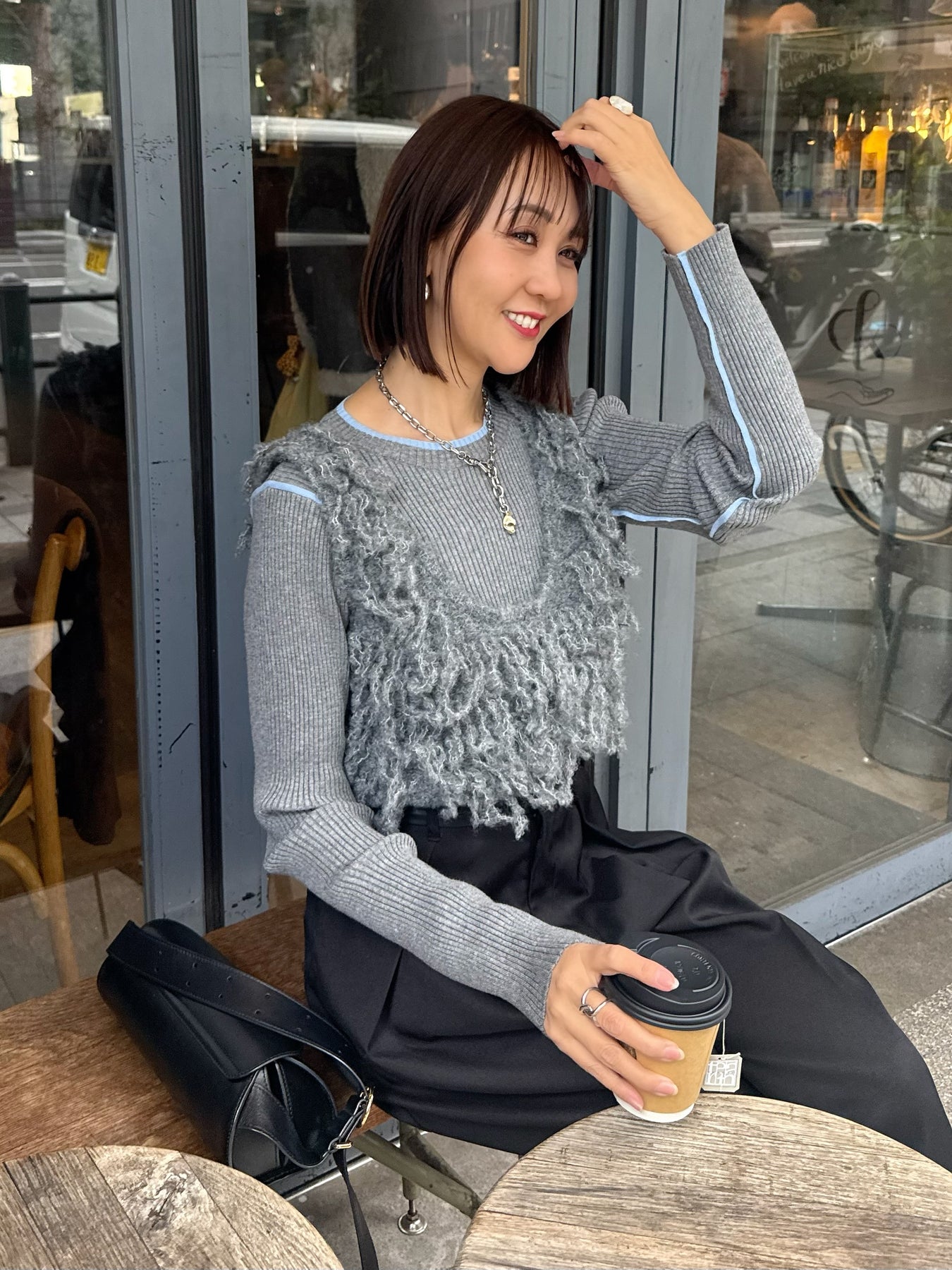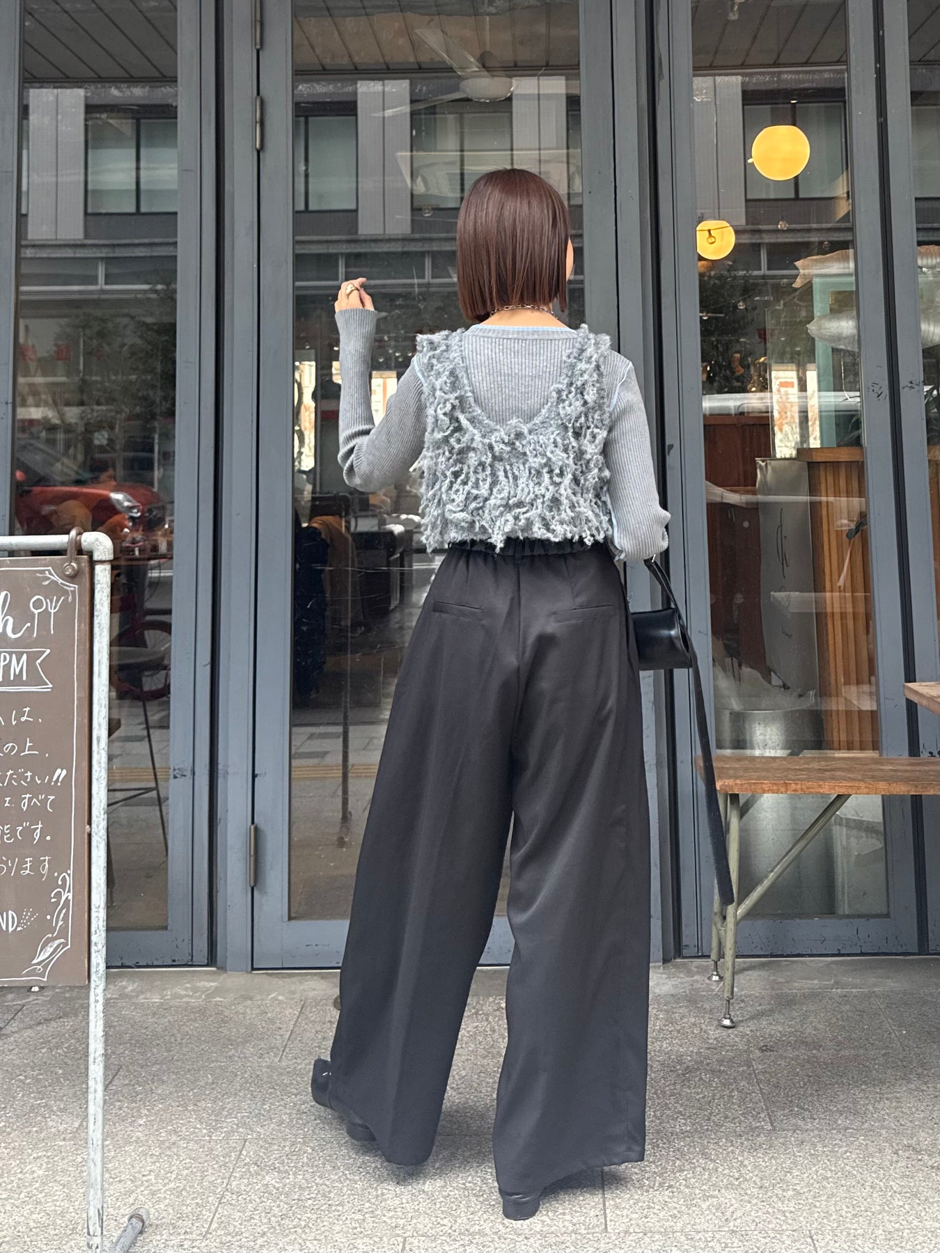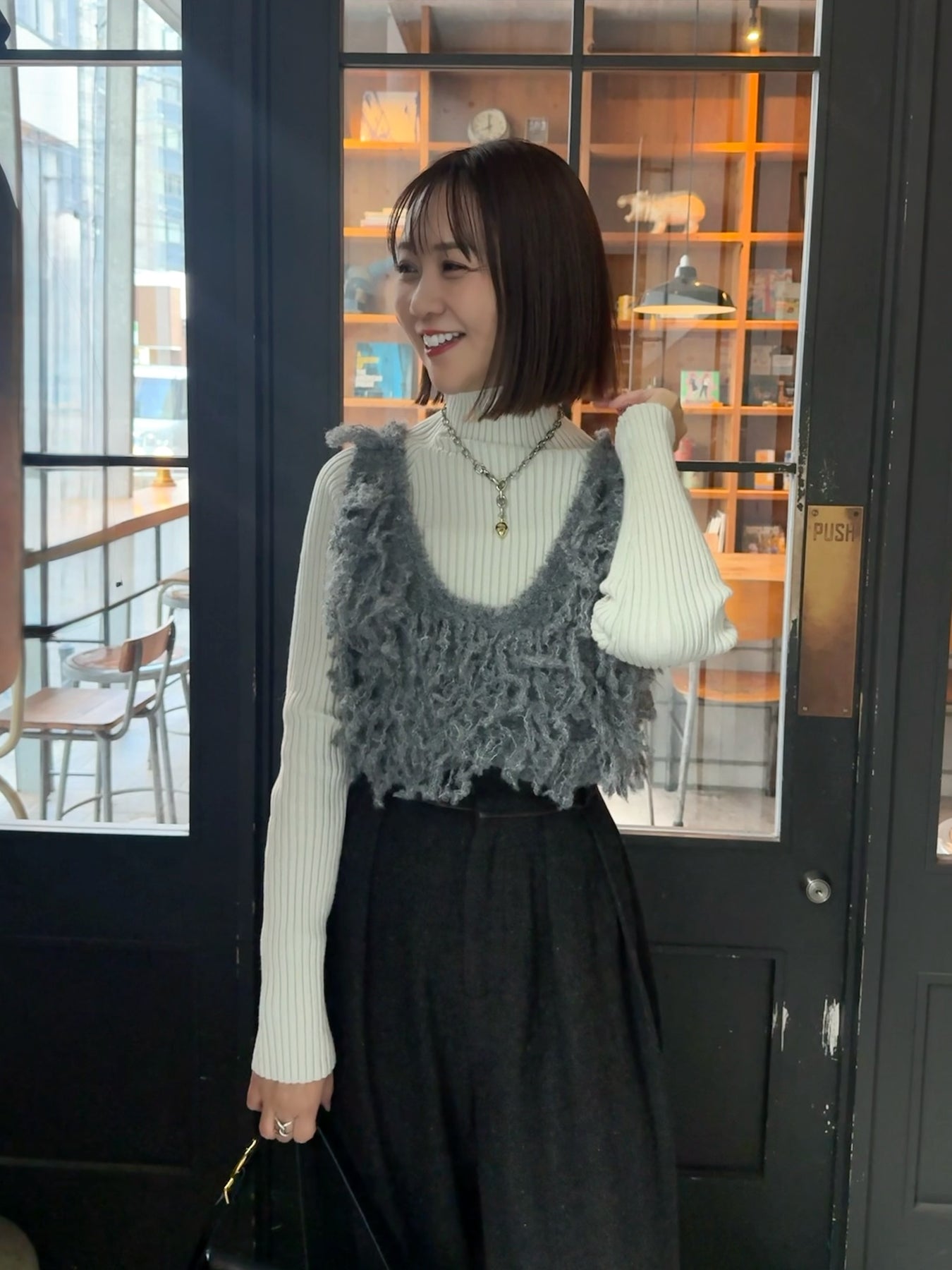 柔らかなブークレー素材で作られたビスチェ。肌触りの良い素材で着心地抜群。シンプルなインナーと合わせるだけでアクセントになるアイテムです。短めの着丈なので、ボトムとの相性も良いアイテムとなります。