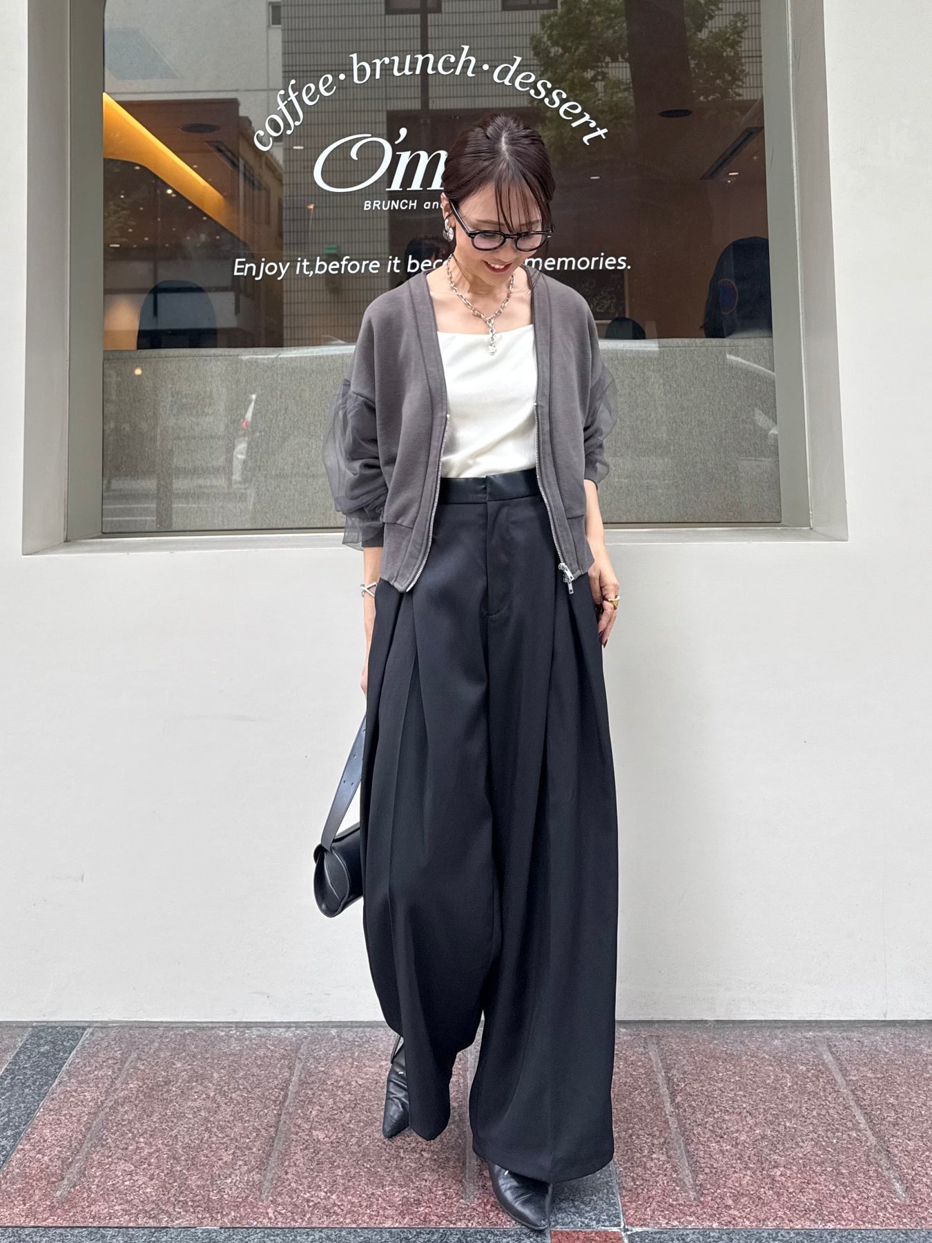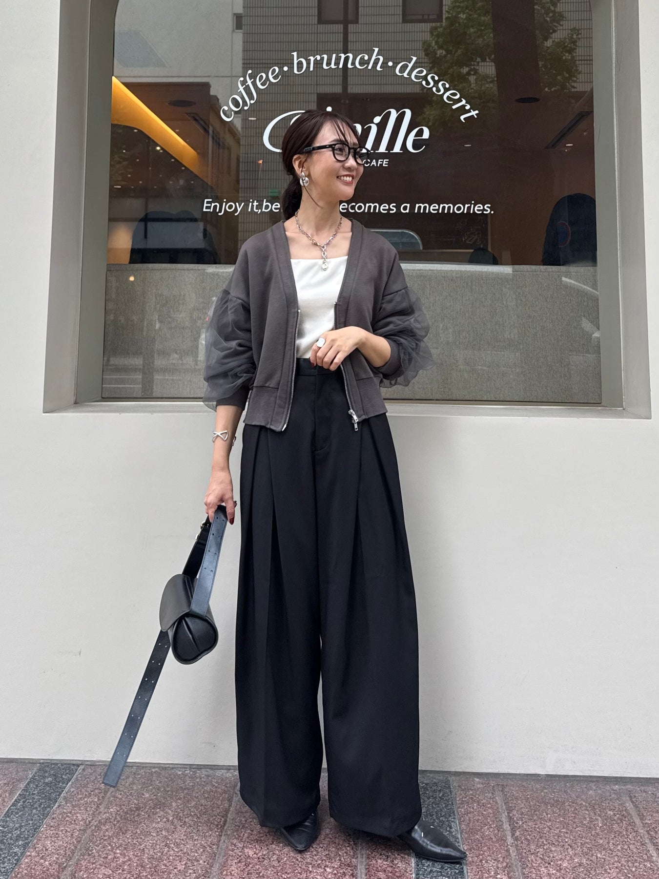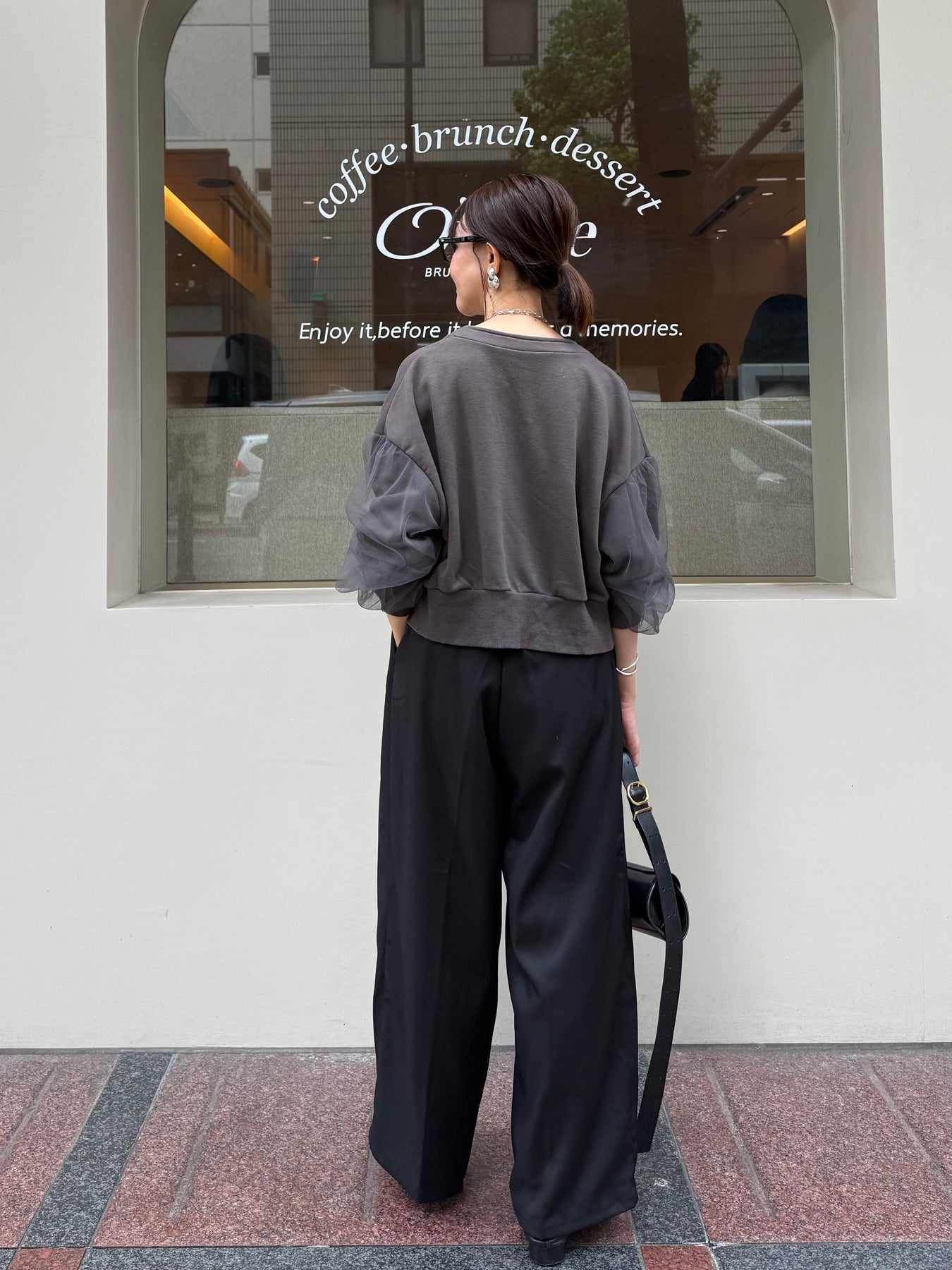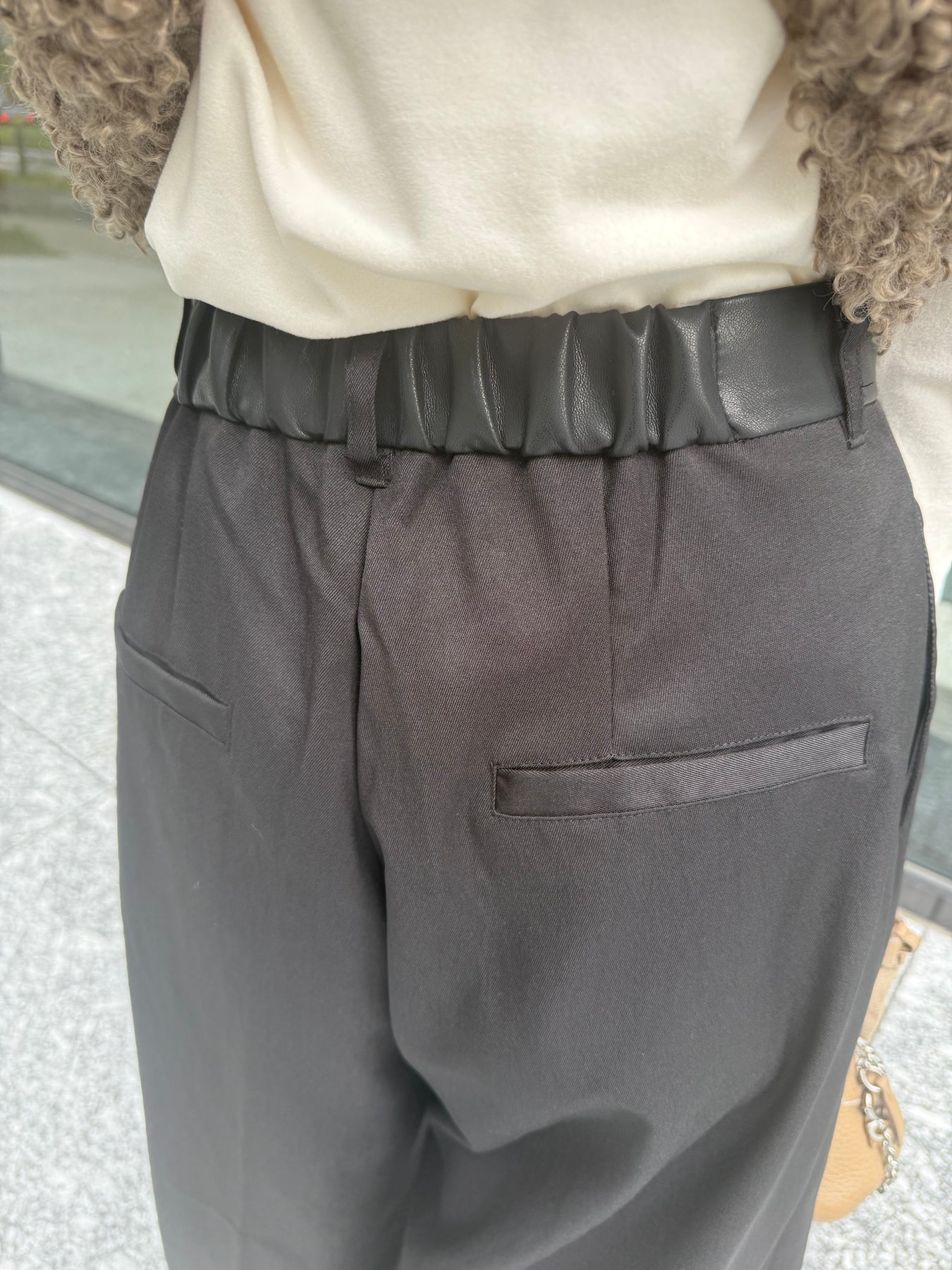 後ろはウエストゴムで履きやすく、分量感はありながらも腰回りはスッキリ。腰高な印象に映る脚長効果抜群シルエットです。