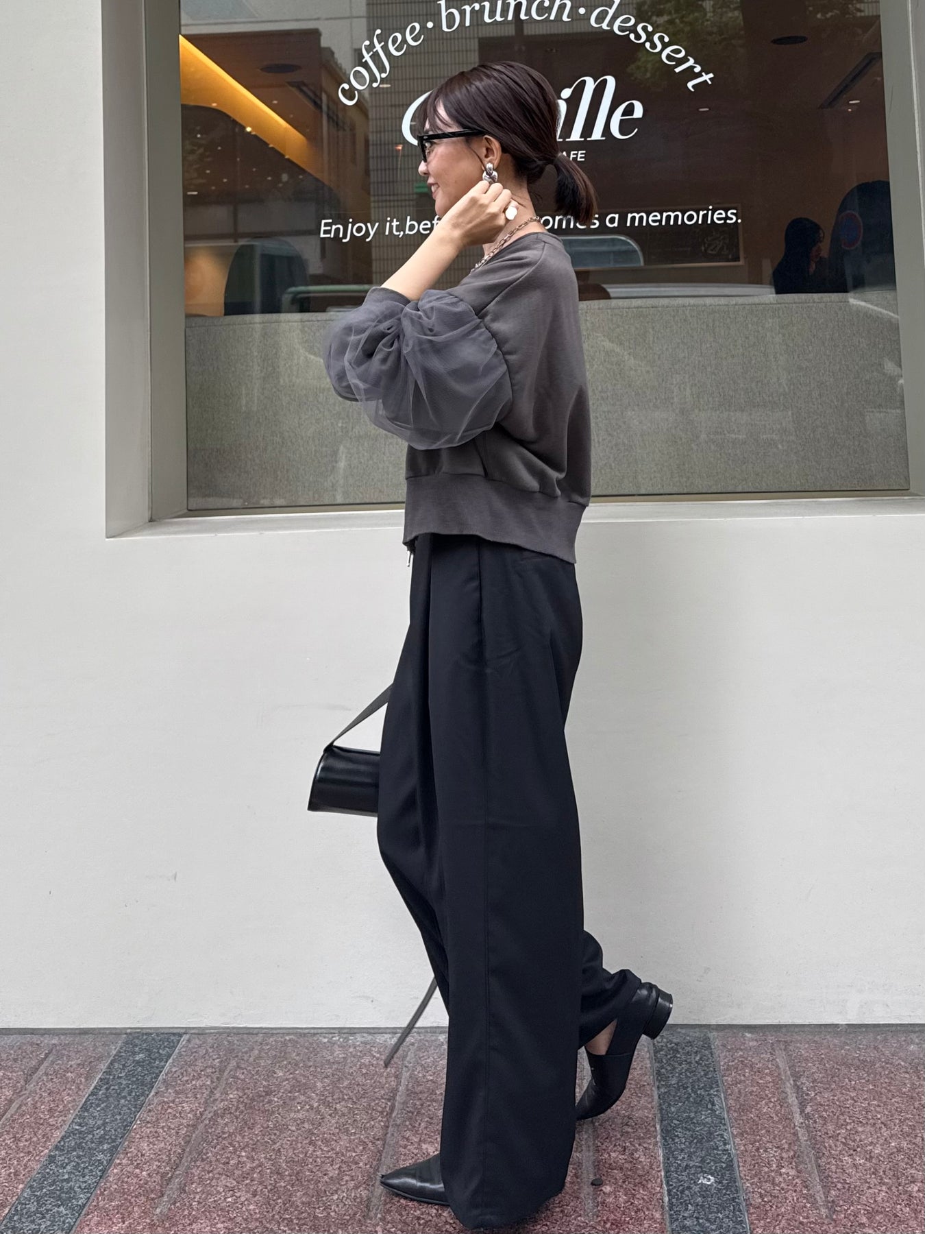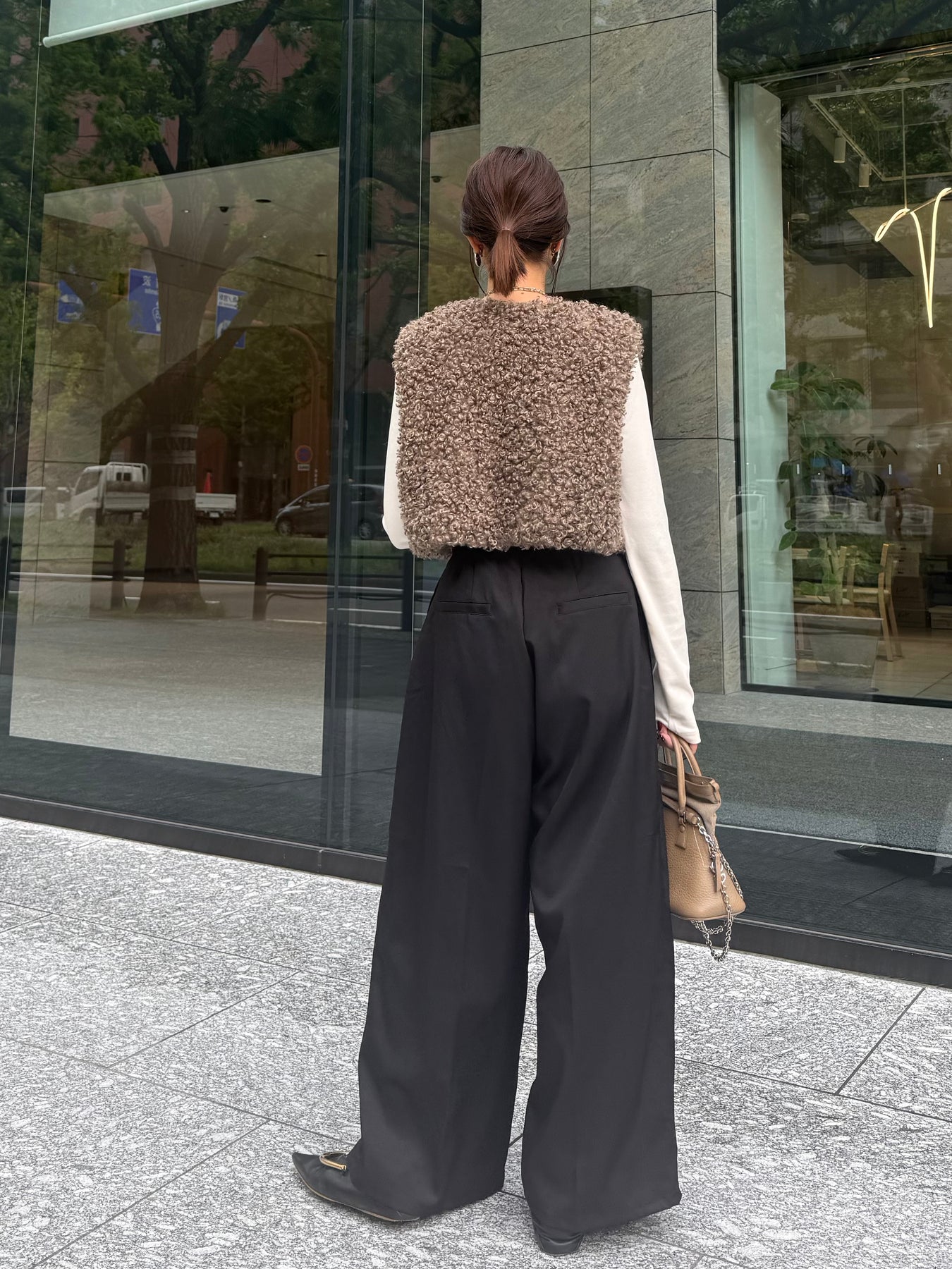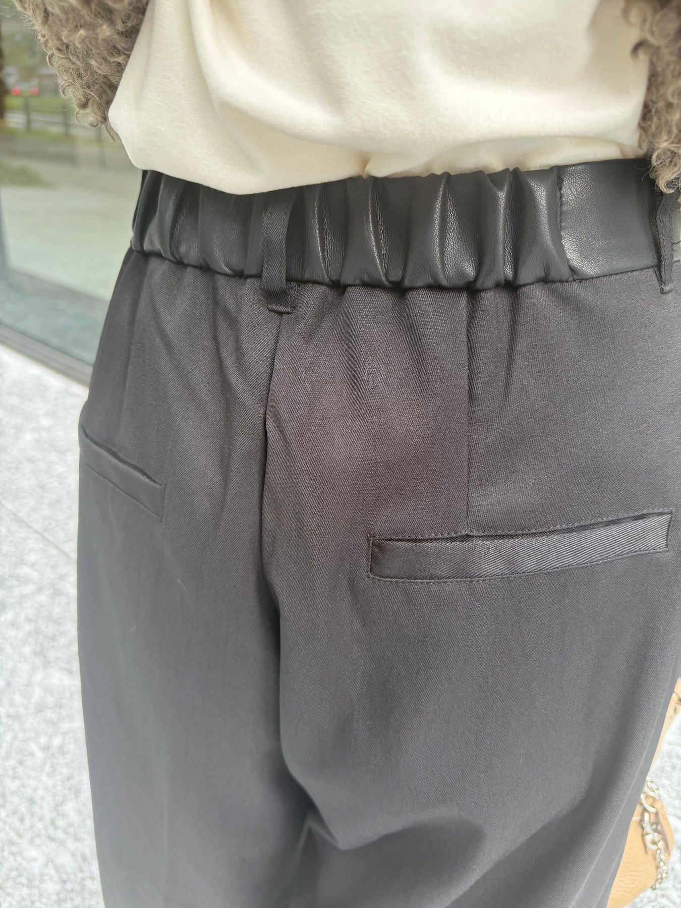 後ろはウエストゴムで履きやすく、分量感はありながらも腰回りはスッキリ。腰高な印象に映る脚長効果抜群シルエットです。