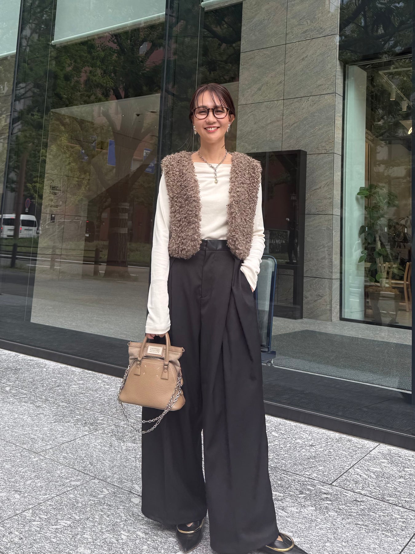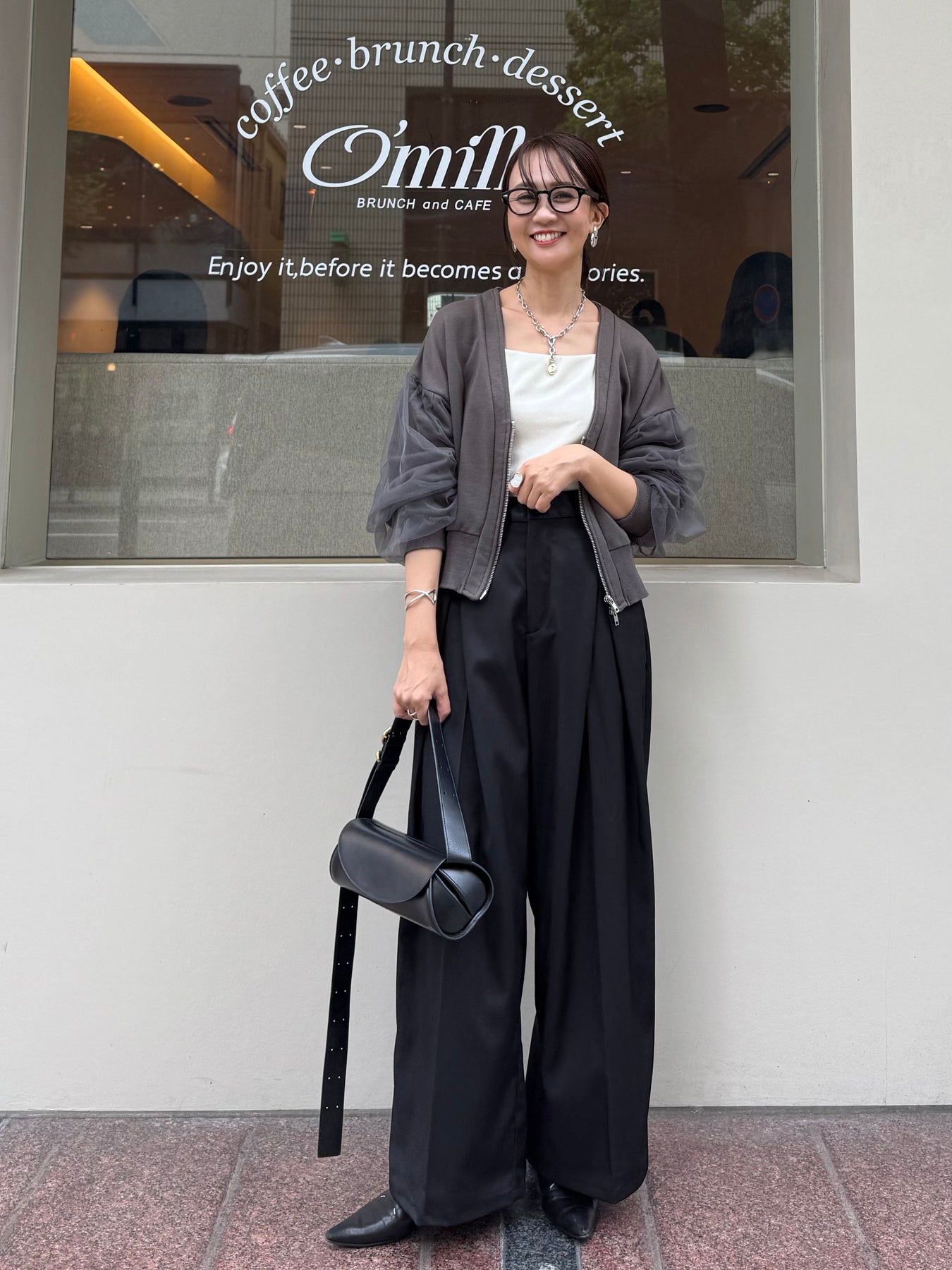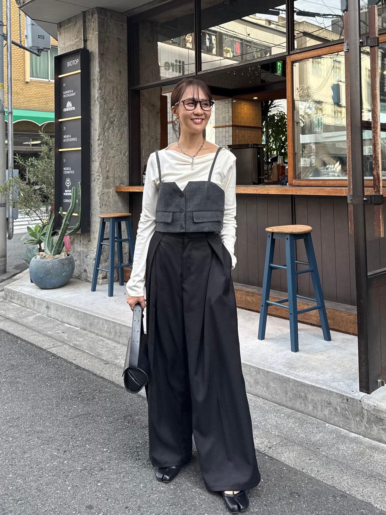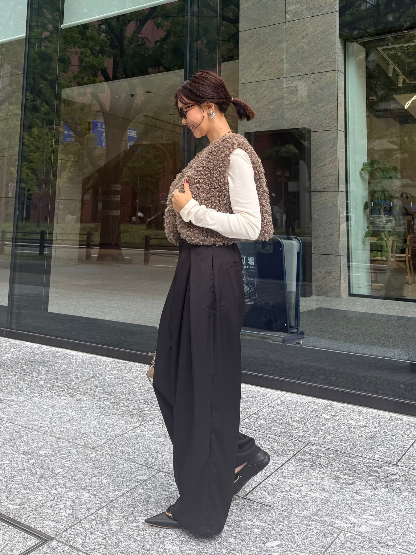 後ろはウエストゴムで履きやすく、分量感はありながらも腰回りはスッキリ。腰高な印象に映る脚長効果抜群シルエットです。
