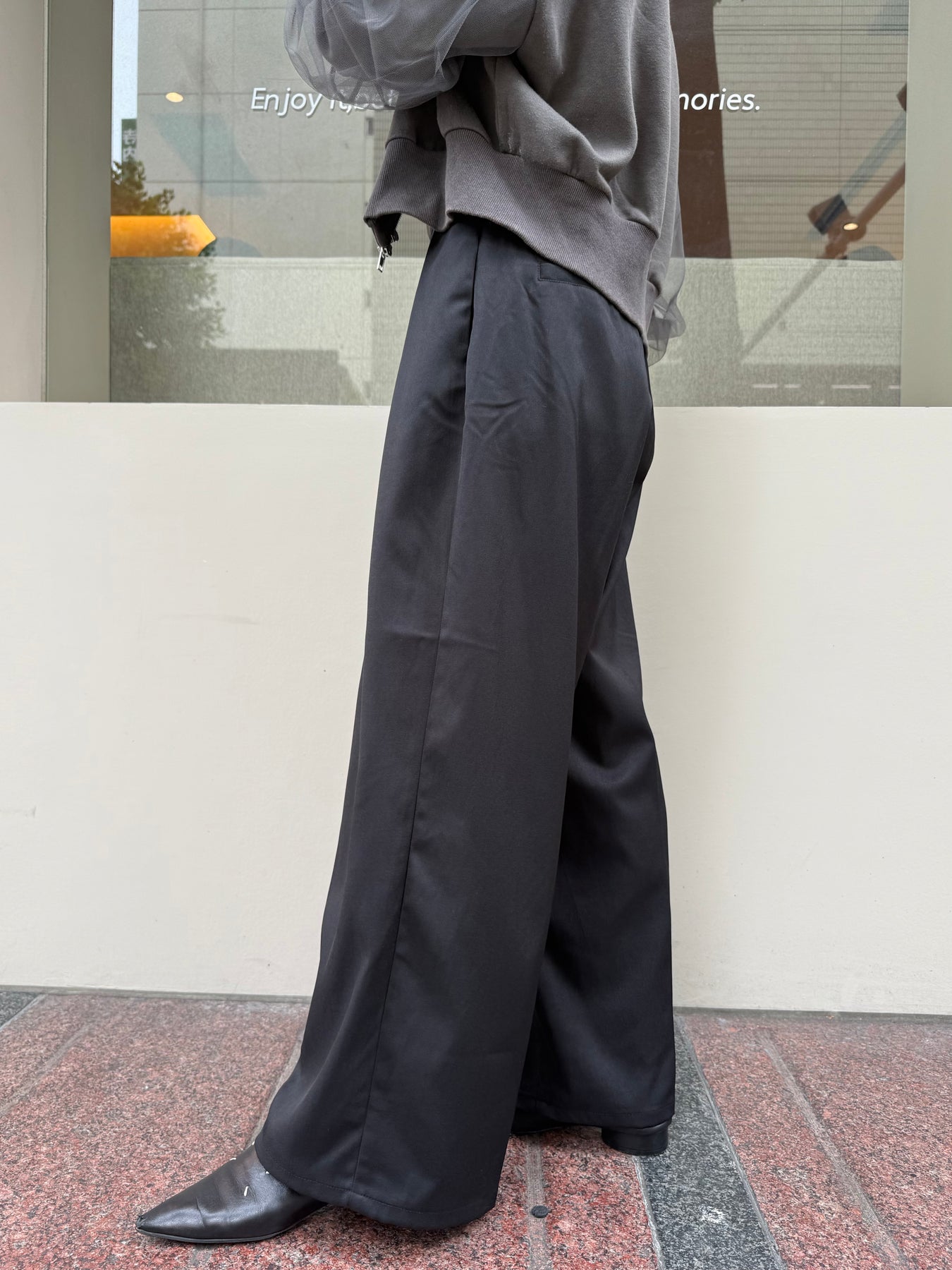 タックと程よくワイドのセンタープレスの縦ラインが、スタイルアップ効果も◎
