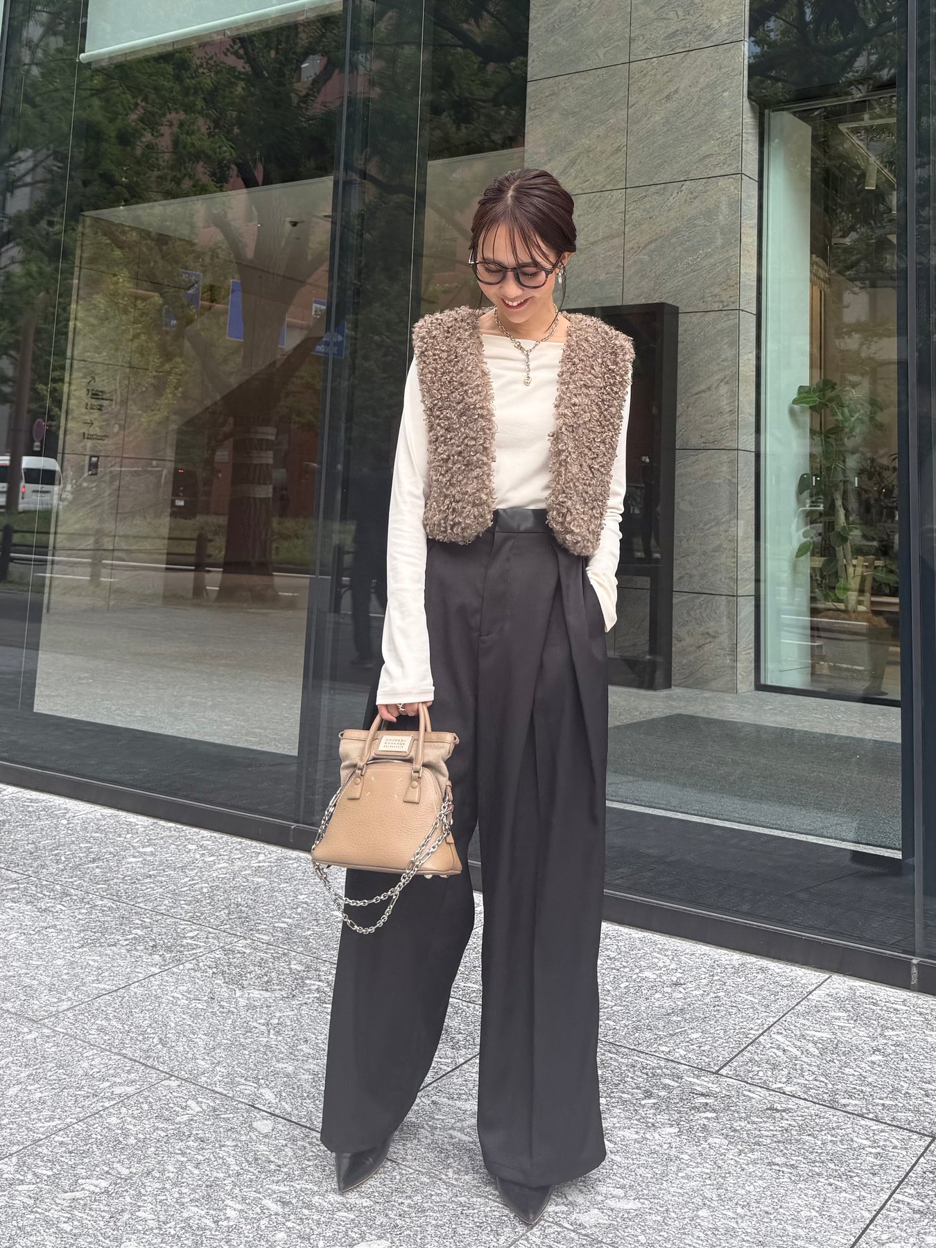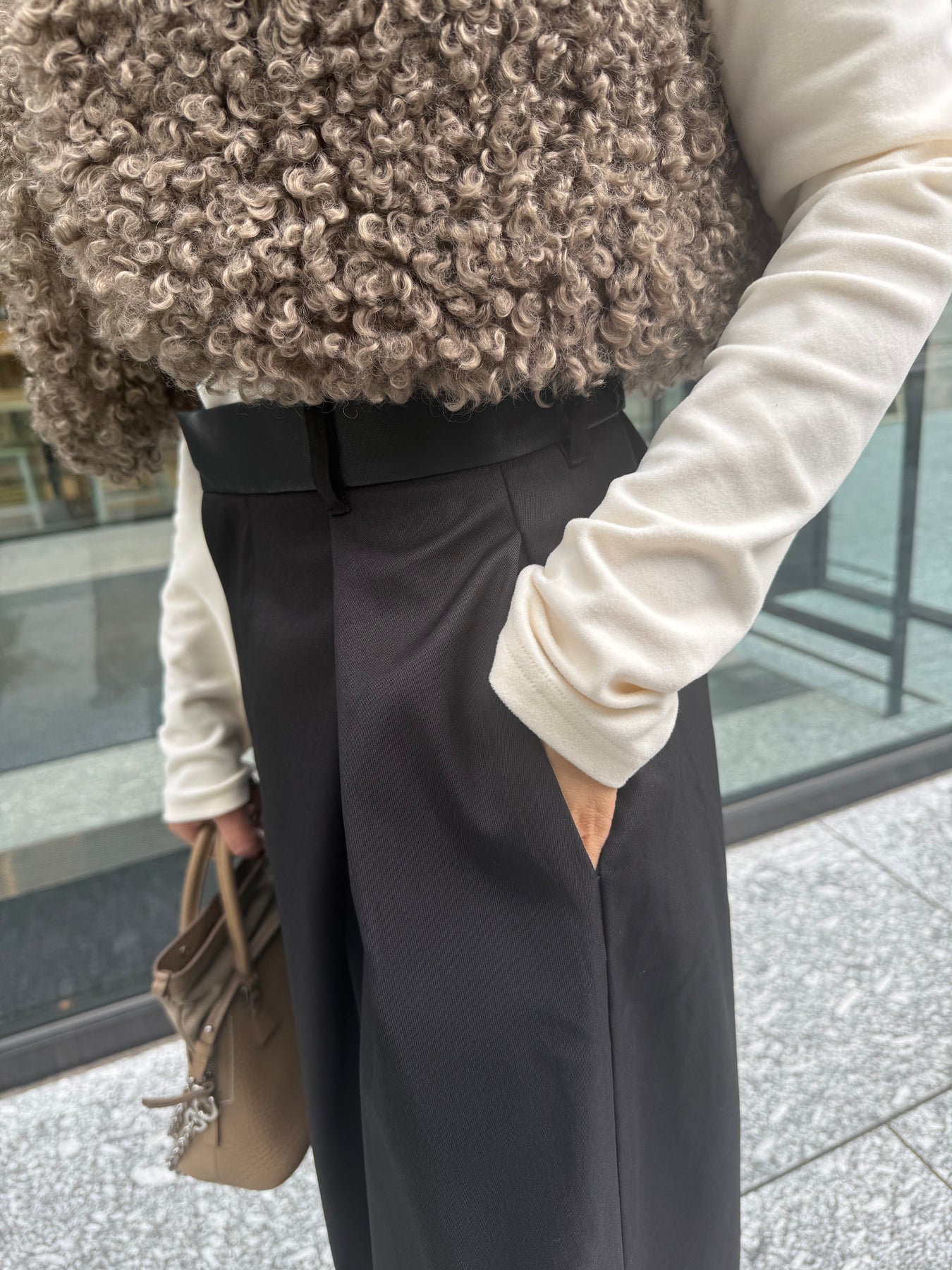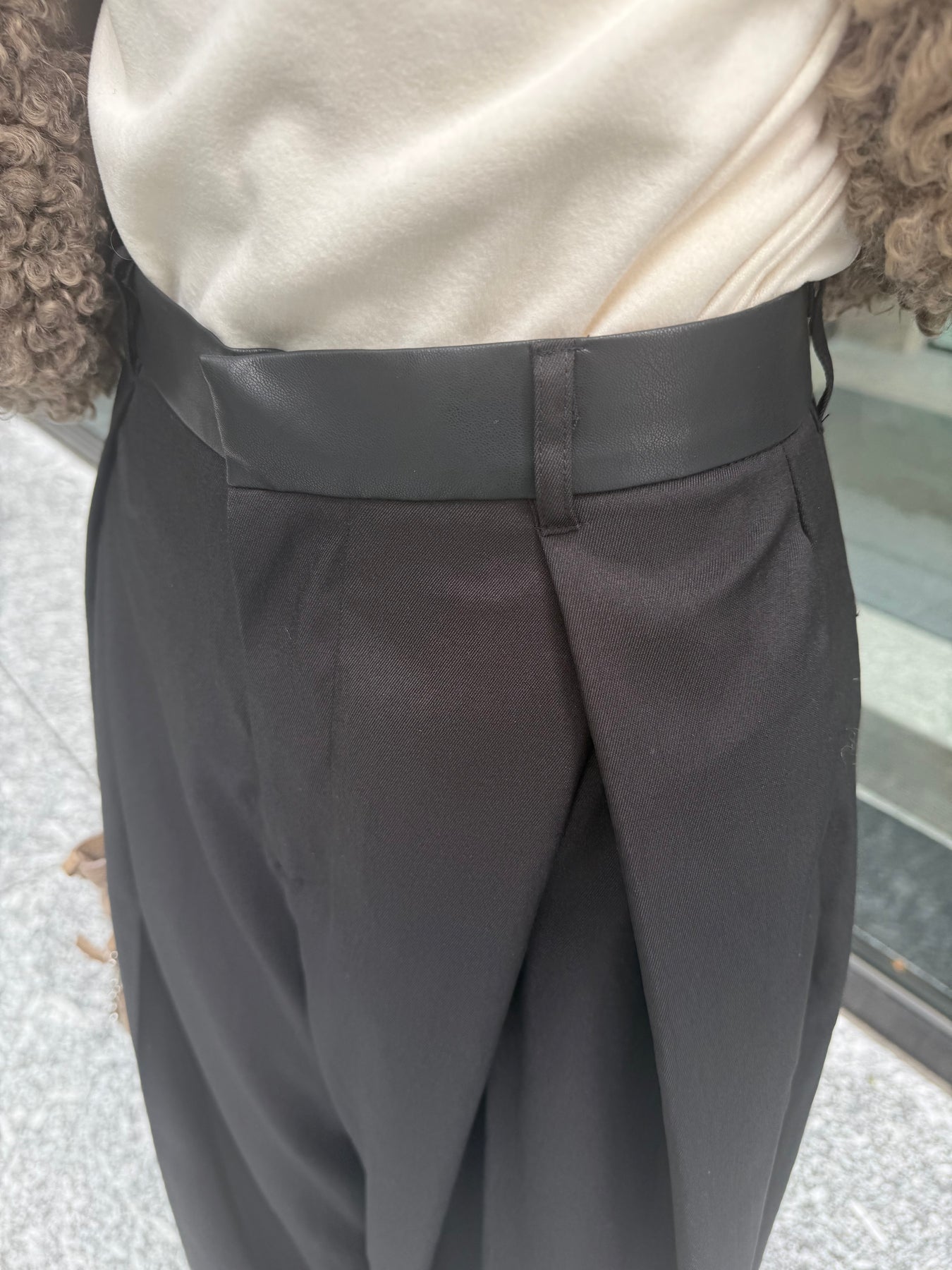 フロントの大胆なタックが目を惹く、こなれ感たっぷりのワイドパンツ。ウエスト部分のレザーパイピングがお洒落な1枚。