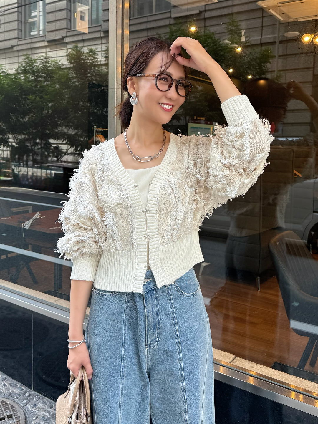 [新作300円OFF] 【予約】フリンジVネックカーディガン / アイボリー (10月下旬発送予定)
