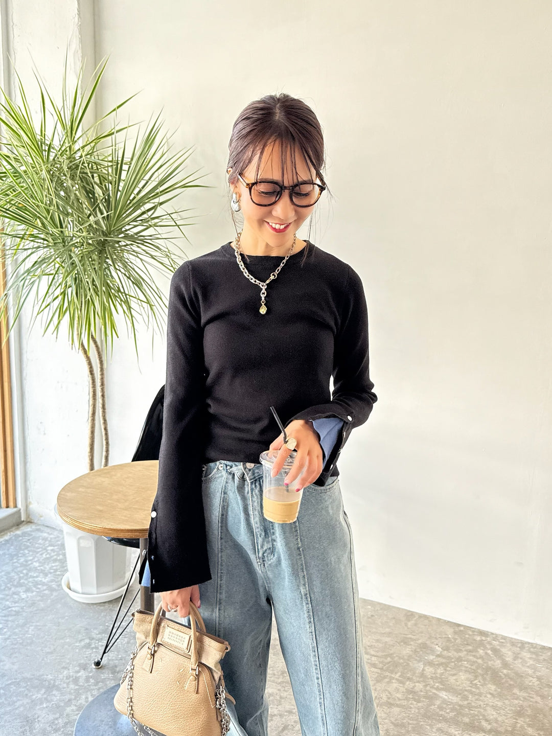 袖ボタンハイネックニット / ブラック