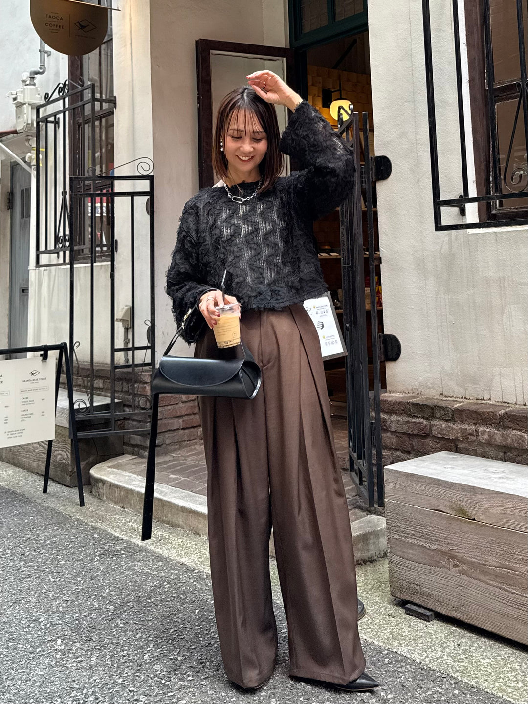 【予約】[SET]チュールフリルメッシュプルオーバー / ブラック + ツイルタックパンツ / ブラウン(10月上旬発送予定)