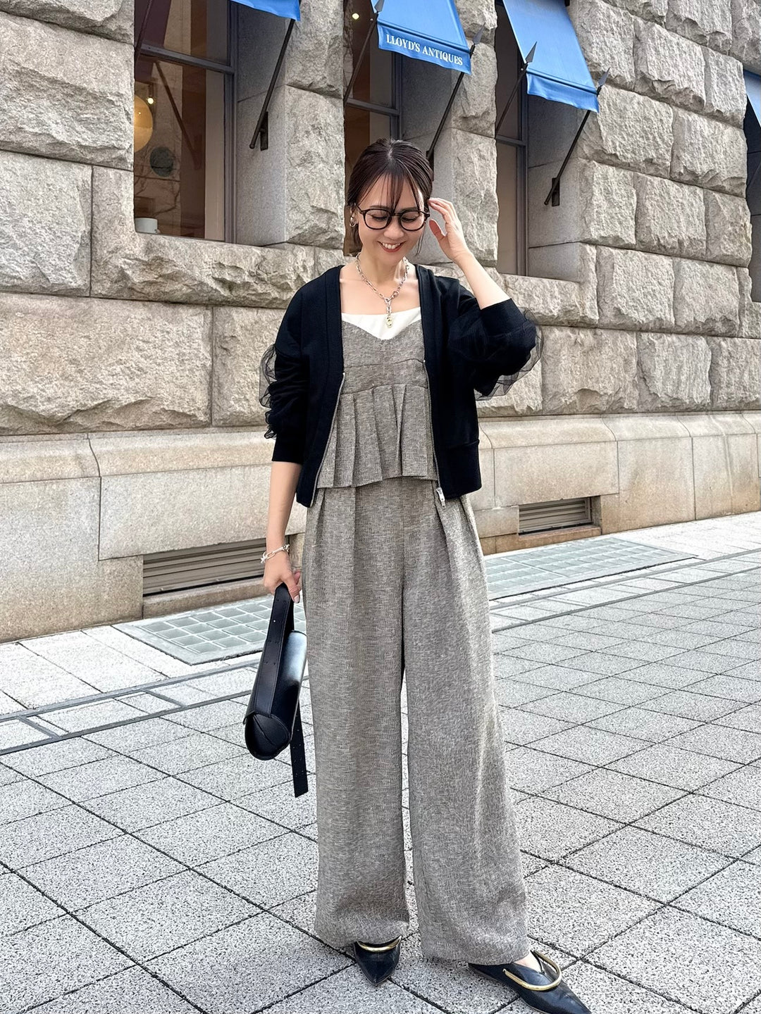 【予約】[3点SET] 袖チュールカーディガン / ブラック + サマーツイードプリーツキャミ / ブラウン + サマーツイードタックパンツ / ブラウン(3月下旬発送予定)