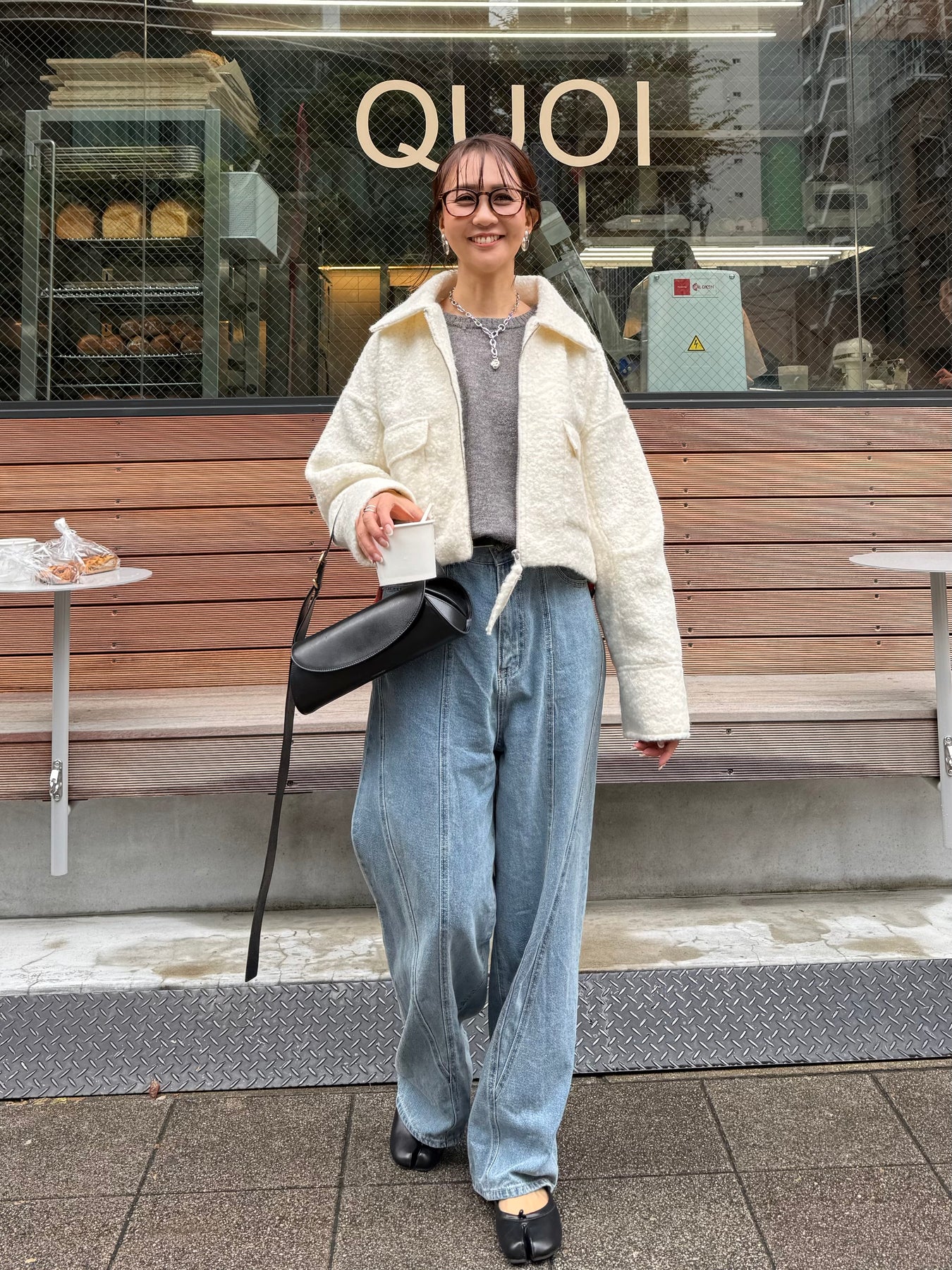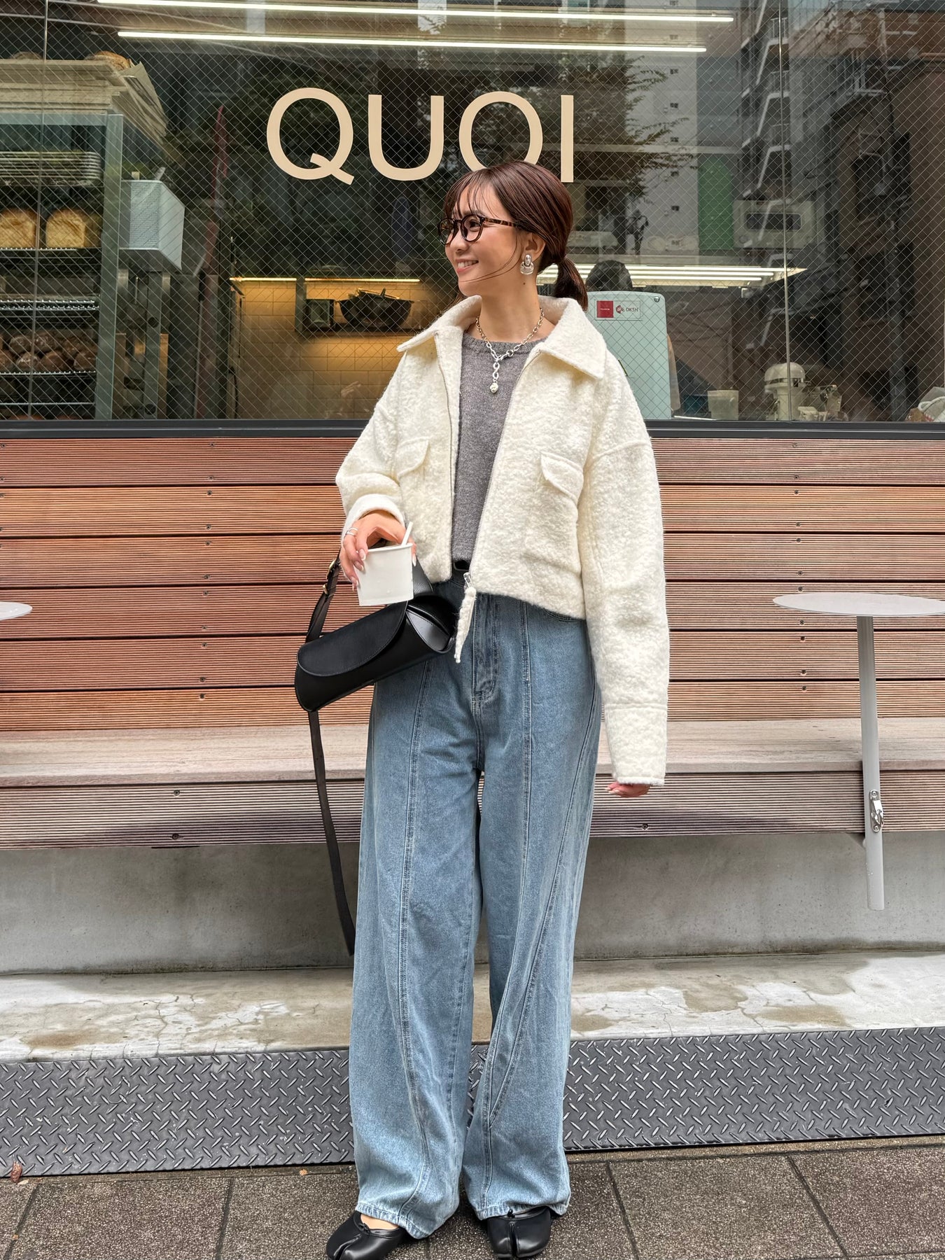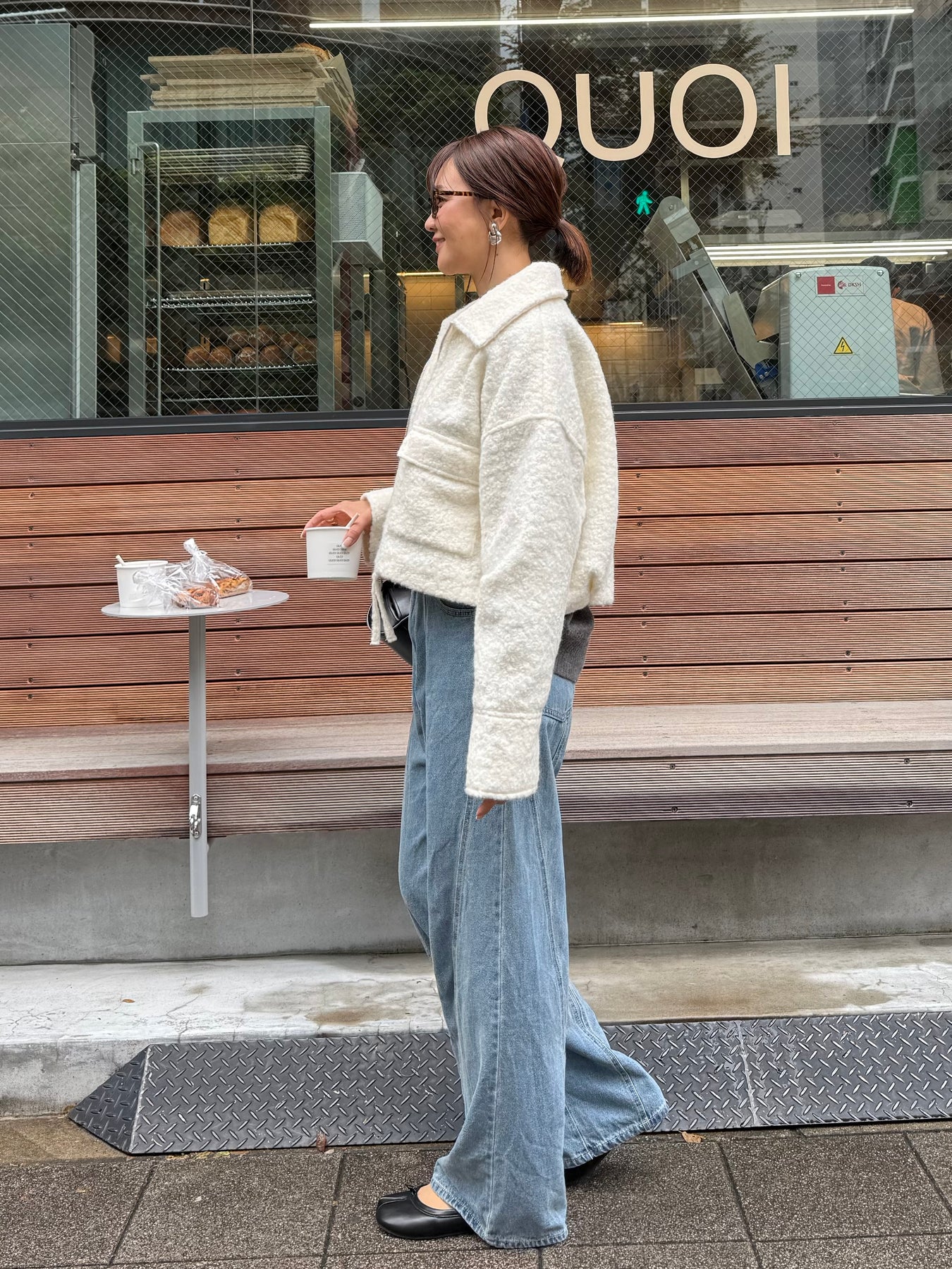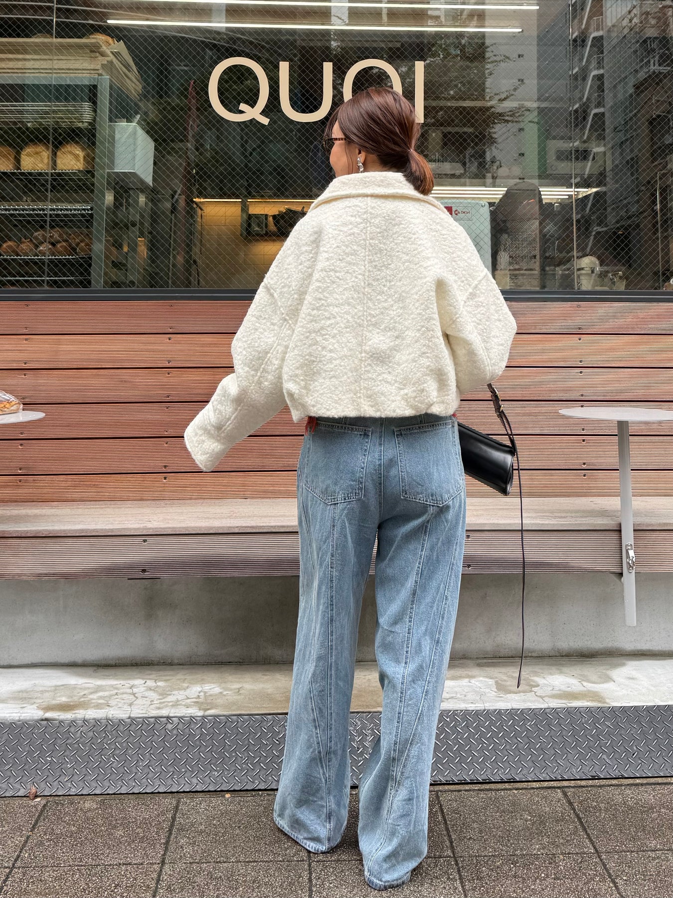 [SET] ループツイードショートジャケット / アイボリー + 切替えストレートデニムパンツ / ブルー