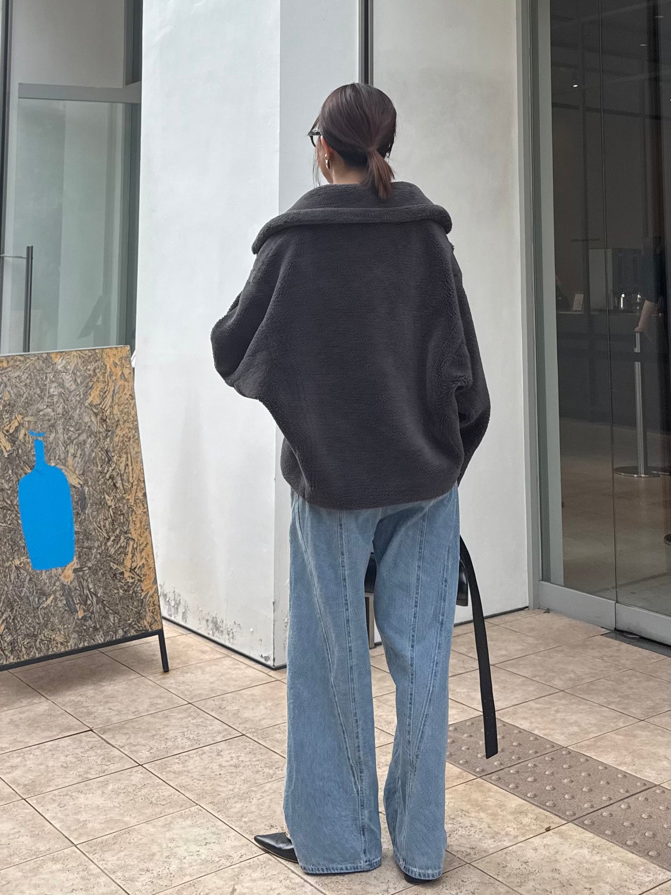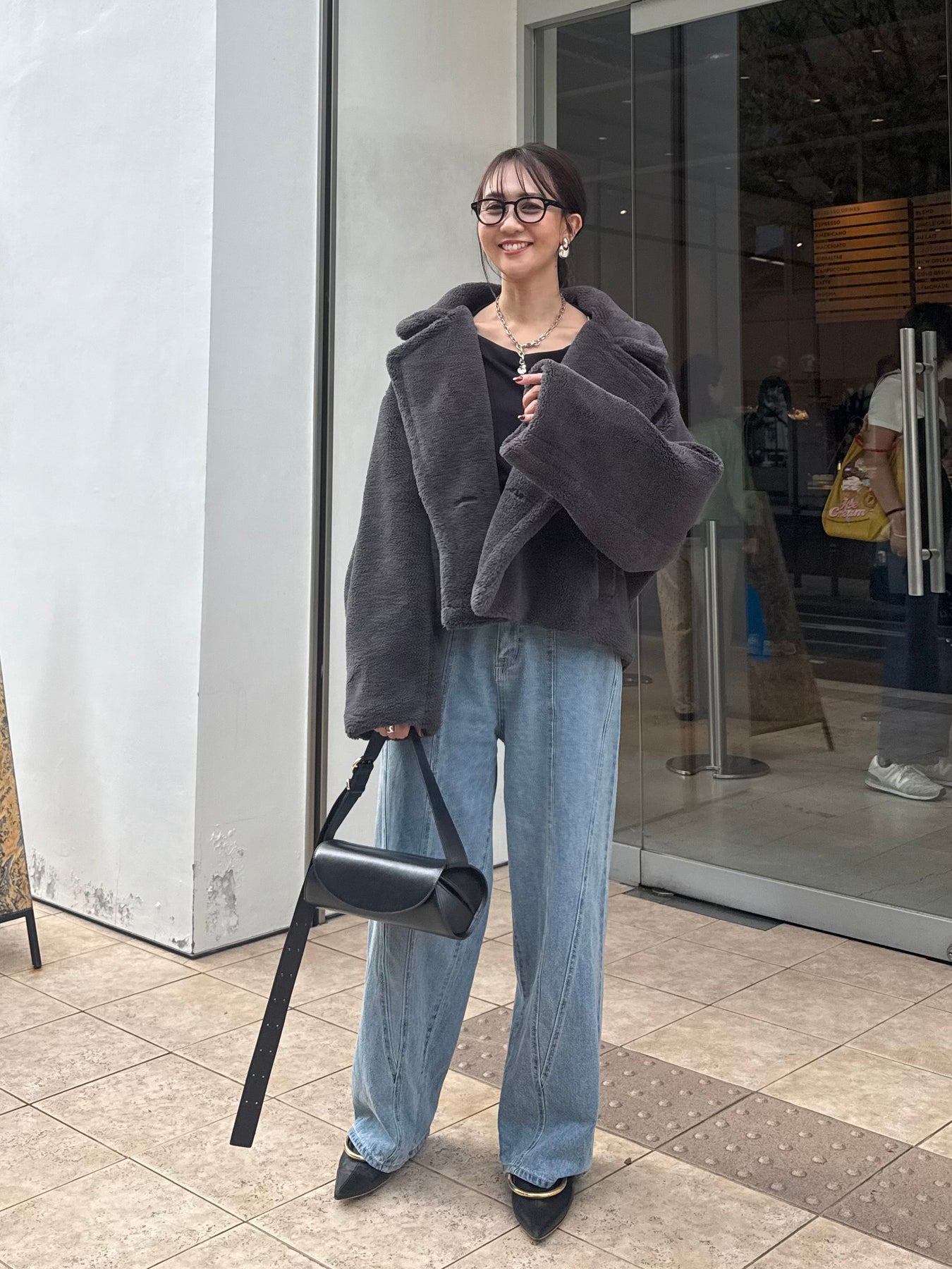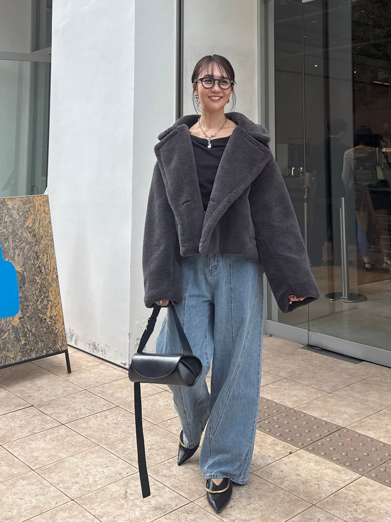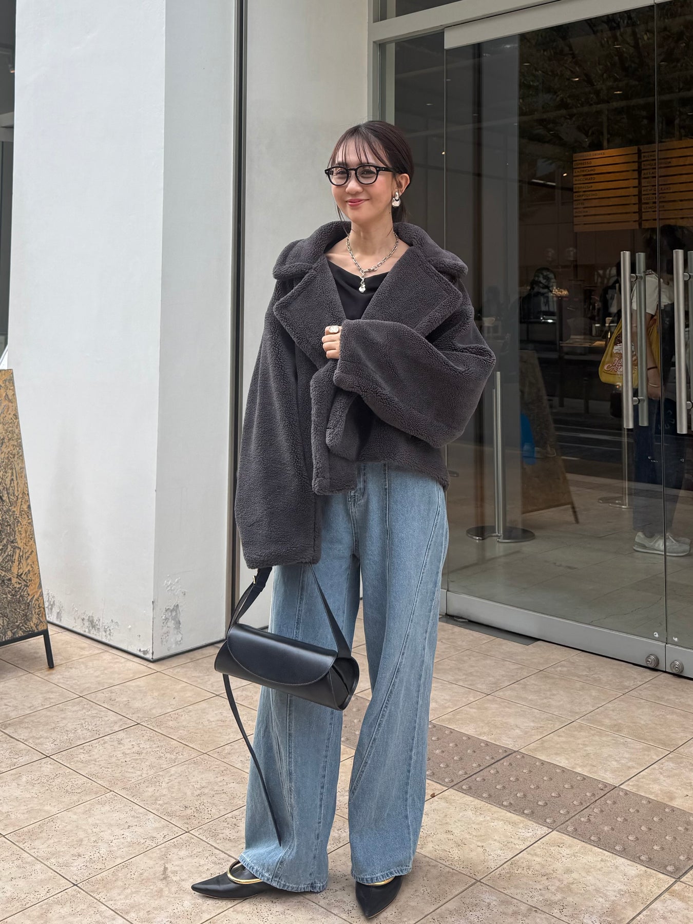 [SET]ボアショートコート / チャコールグレー + 切替えストレートデニムパンツ / ブルー