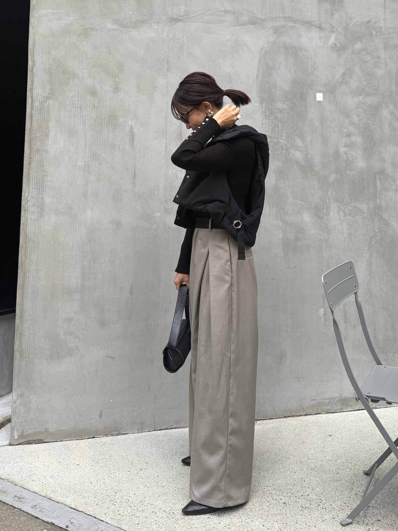 短めの丈感は、ワイドパンツなどとの相性もバツグンです。両脇下にベルトがついているので、調整も可能です。