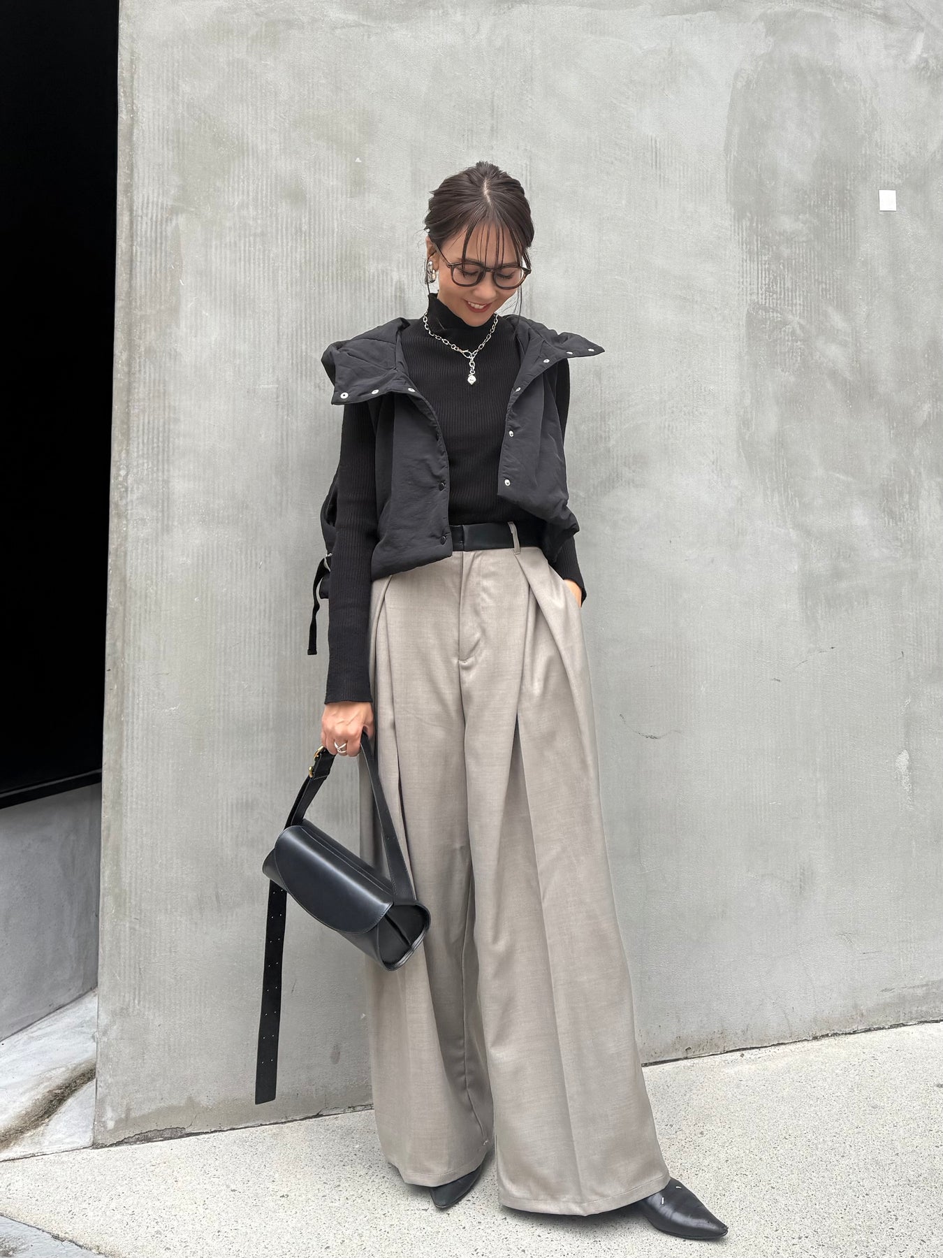フロントの大胆なタックが目を惹く、こなれ感たっぷりのワイドパンツ。ウエスト部分のレザーパイピングがお洒落な1枚。