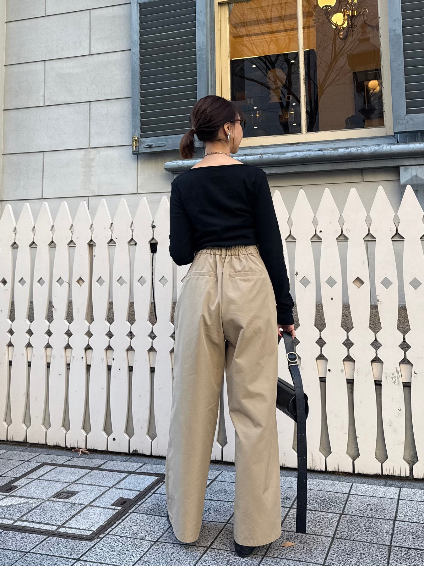 後ろはウエストゴムで履きやすく、分量感はありながらも腰回りはスッキリ!腰高な印象に映る脚長効果抜群シルエットです