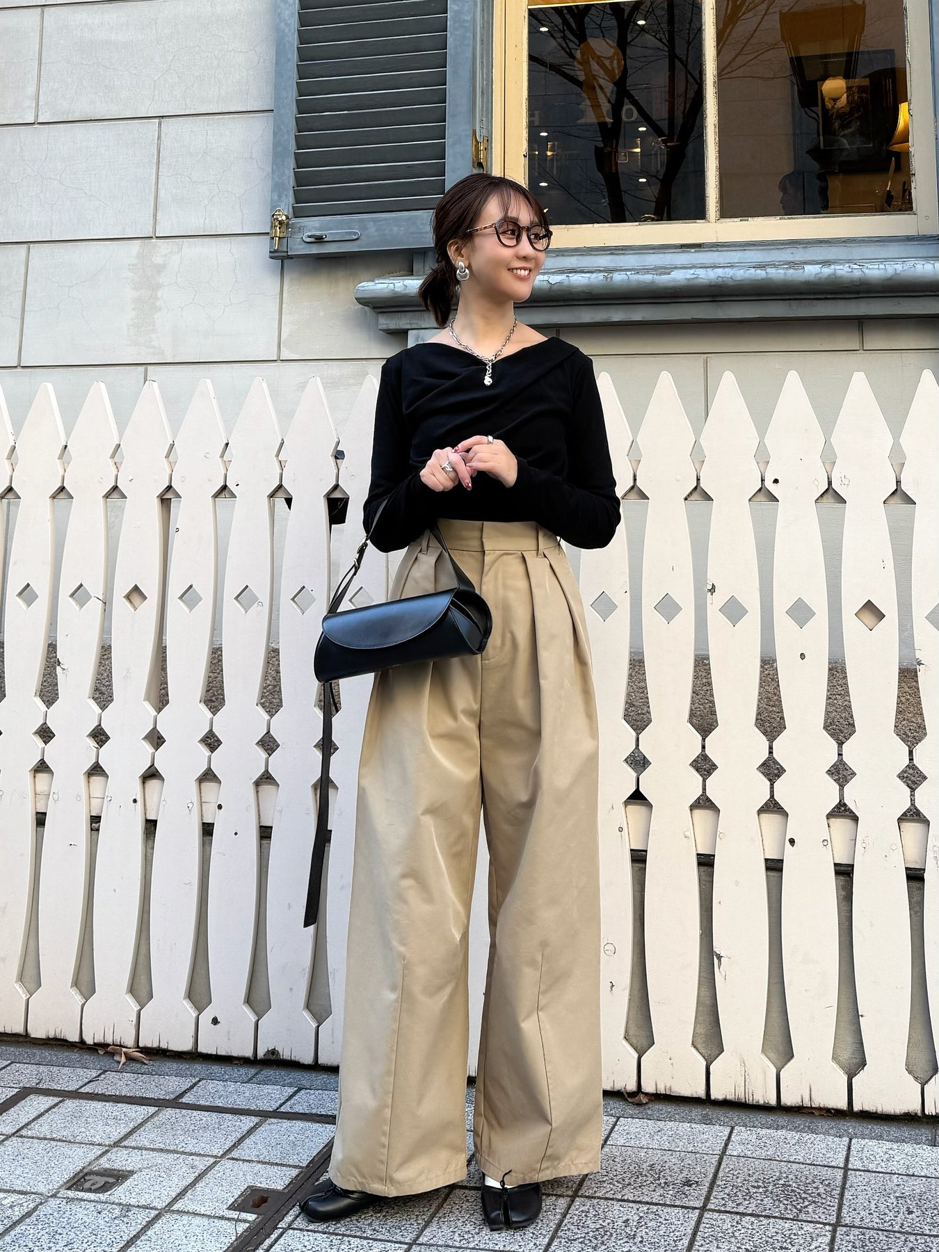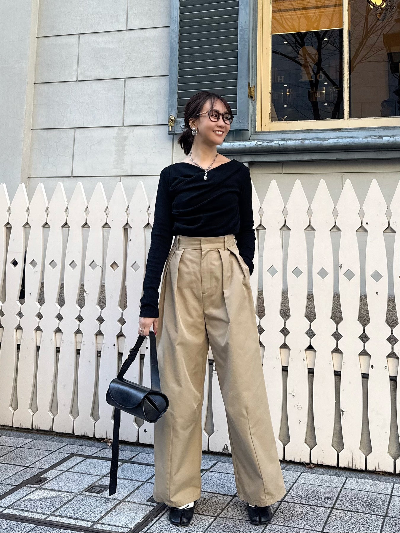 フロントの大胆なタックが目を惹く、こなれ感たっぷりのワイドパンツ。