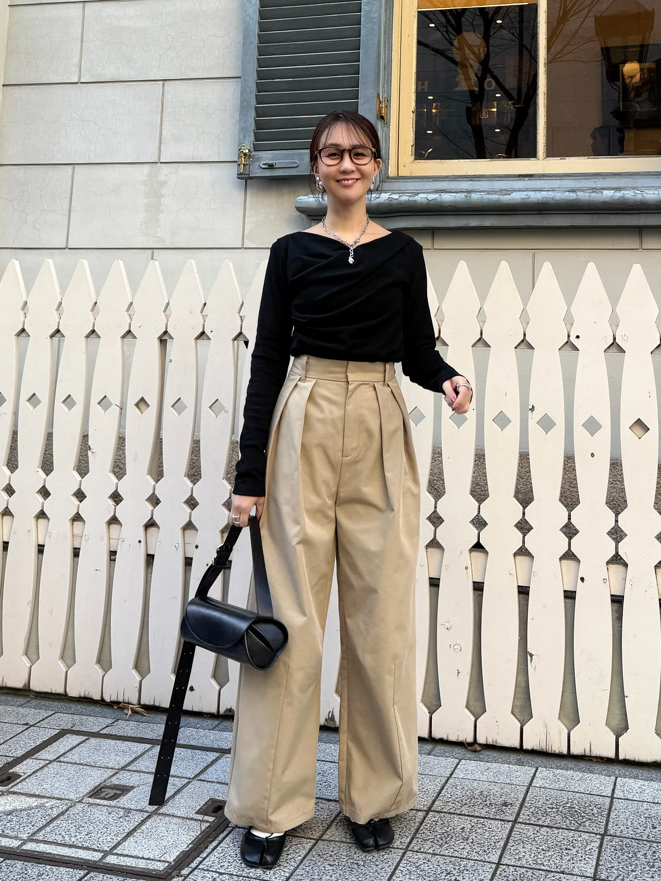 シンプルなボトムスに合わせても、上品なコーデにしてくれる万能アイテムです。