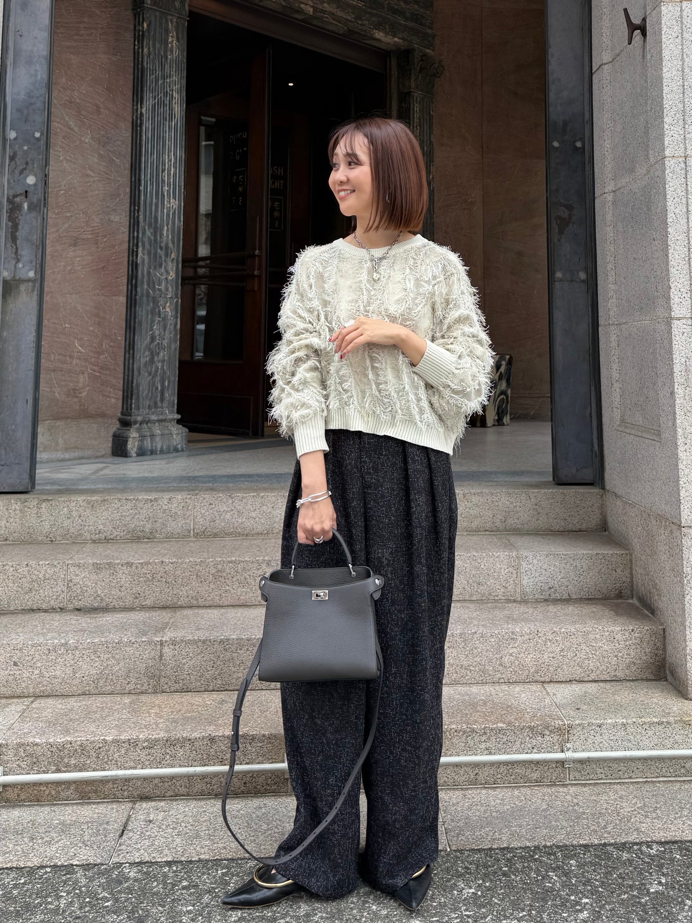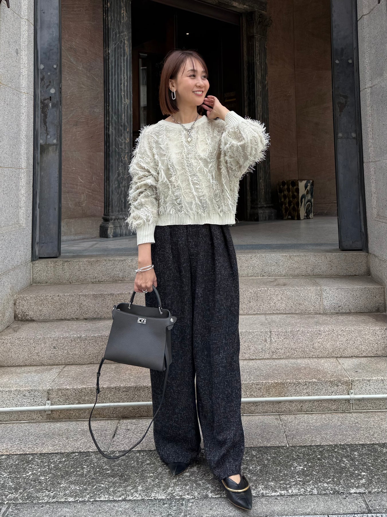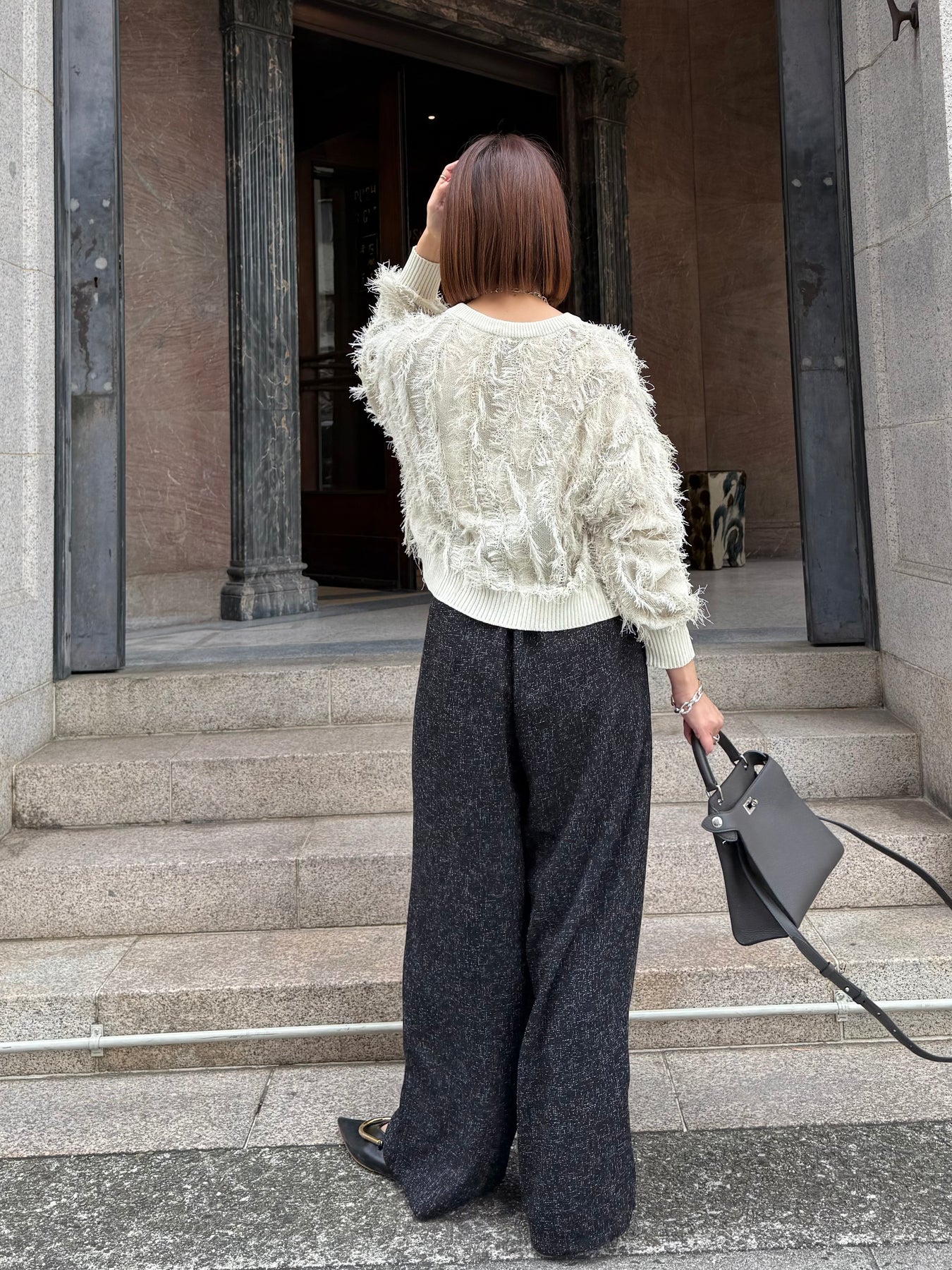【予約】[SET] 麻タッチフリンジニットショート丈プルオーバー/ アイボリー + サマーツイードタックパンツ / ブラック(2月中旬発送予定)