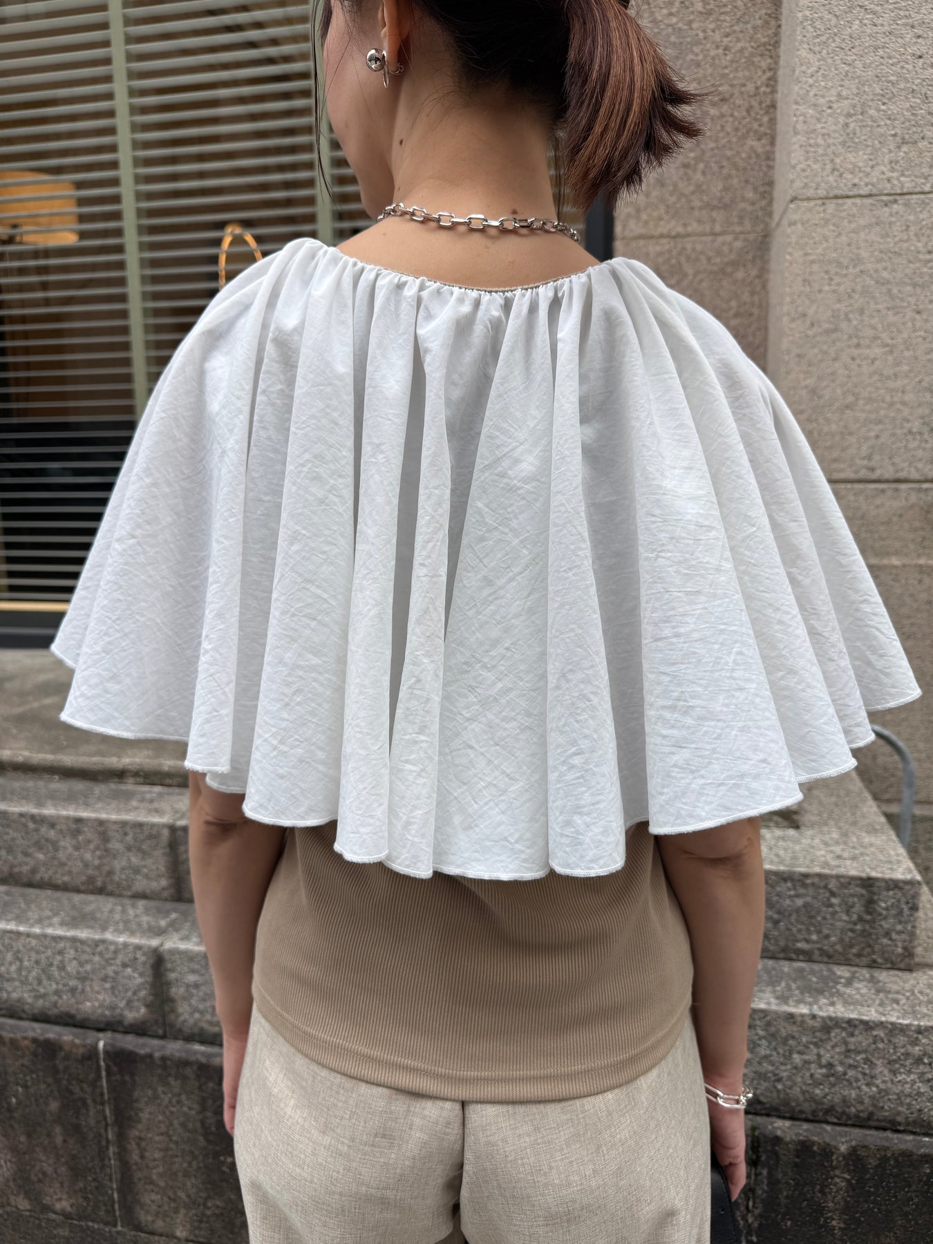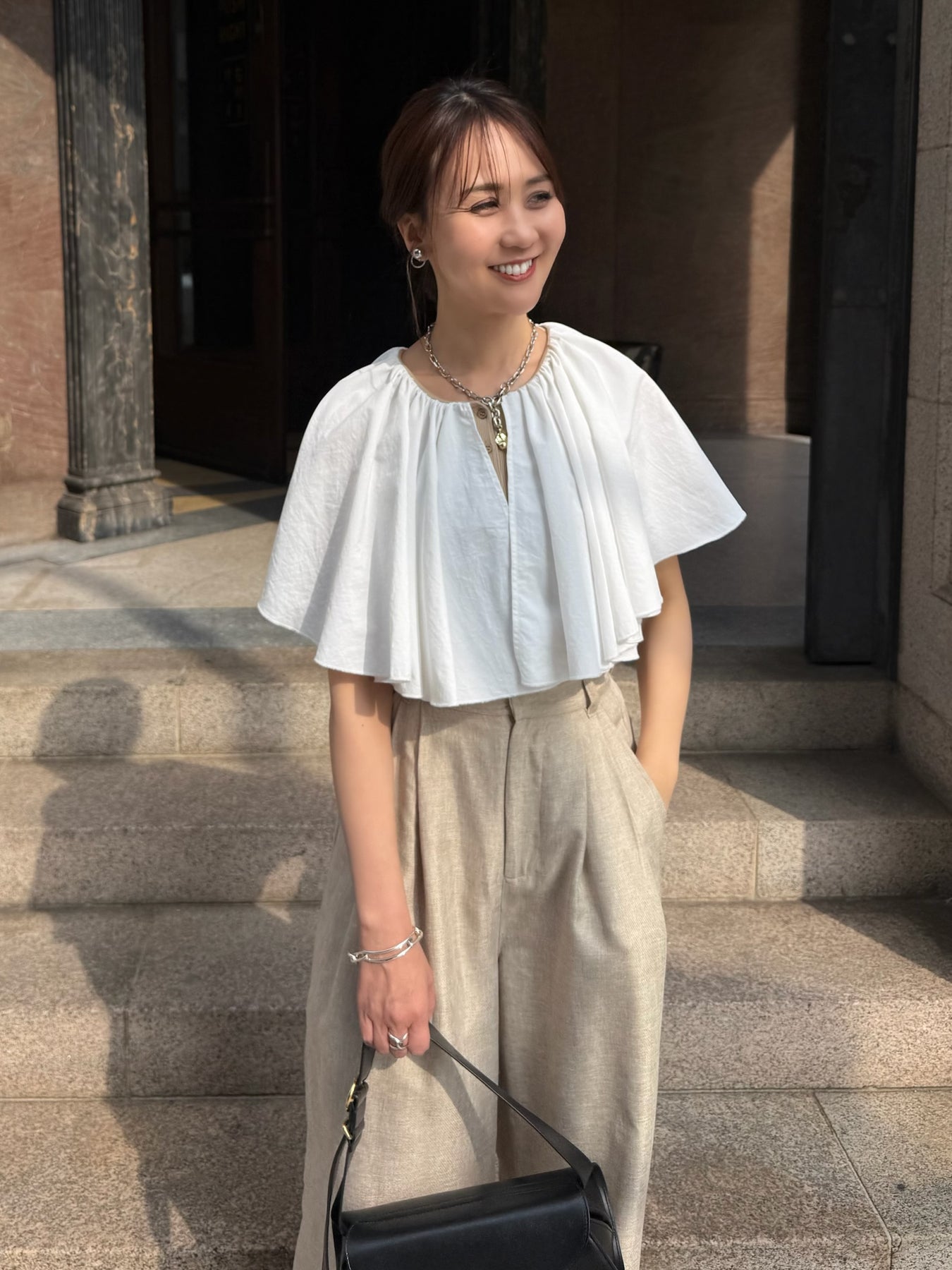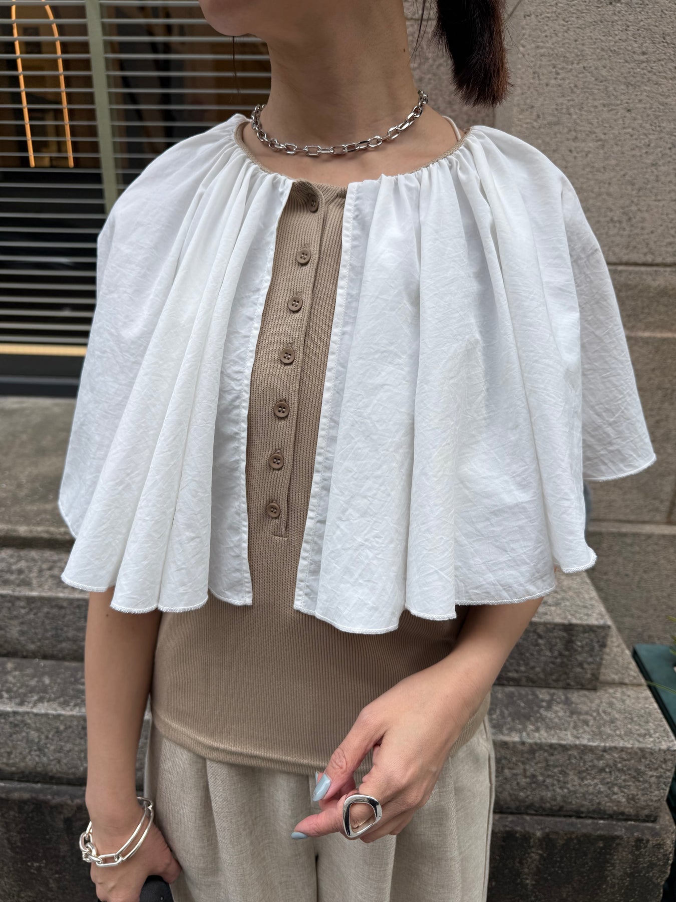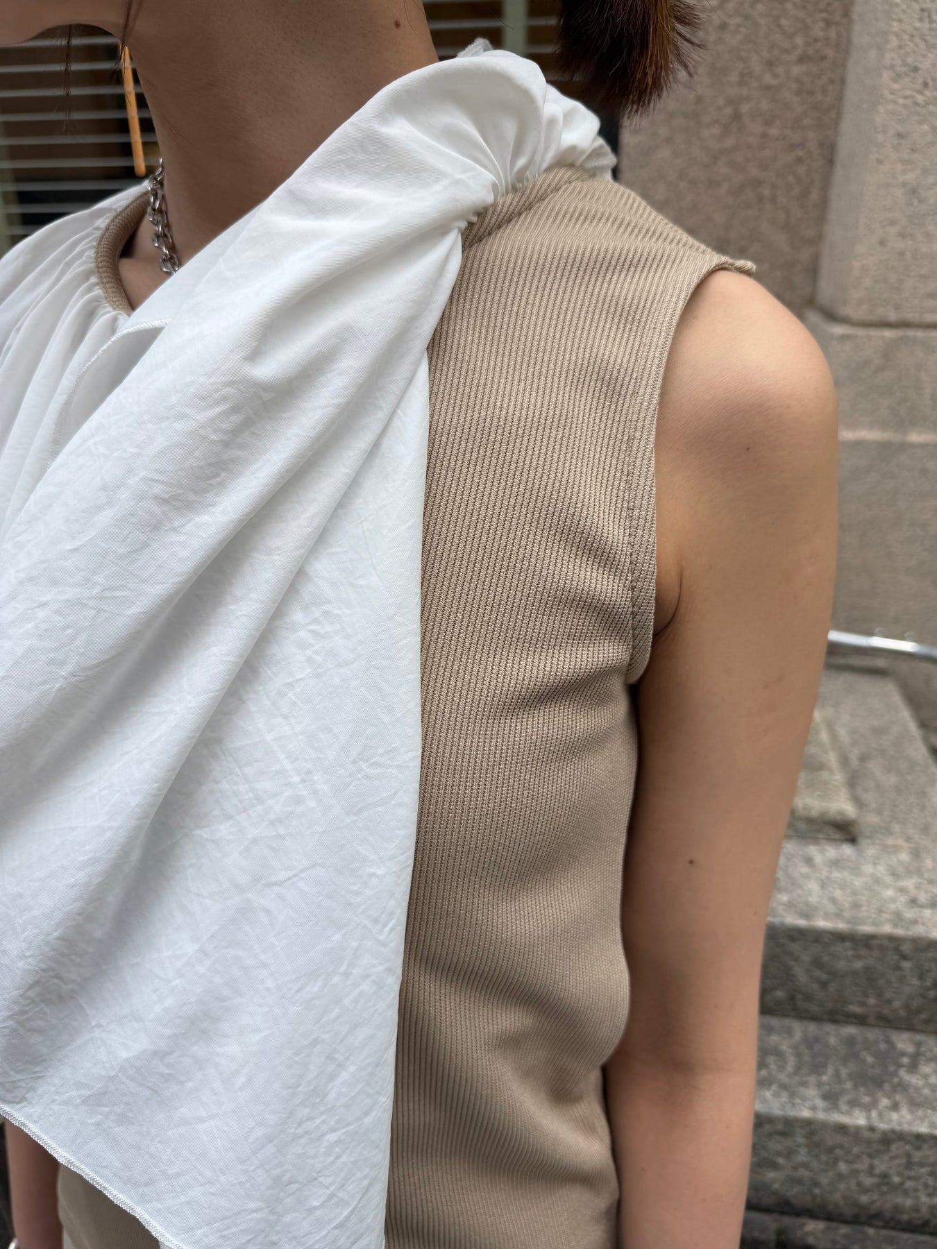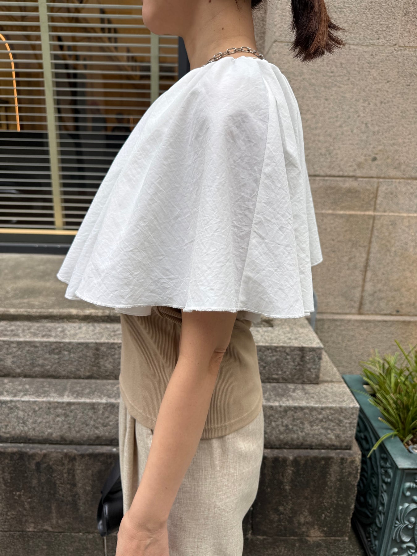 ケープ風のデザインが印象的なトップス。動くたびにふんわりと揺れるシルエットが、シンプルなスタイリングに自然な立体感をプラスします。甘くなりすぎないデザインなので、デニムなどのカジュアルアイテムとも相性が良く、日常使いしやすいバランスに仕上げています。内側はノースリーブのリブ仕様になっており、伸縮性がありながらもすっきりとしたシルエットで着用いただけます。気になる腕まわりをカバーしながら、すっきり見えも叶える一着です。