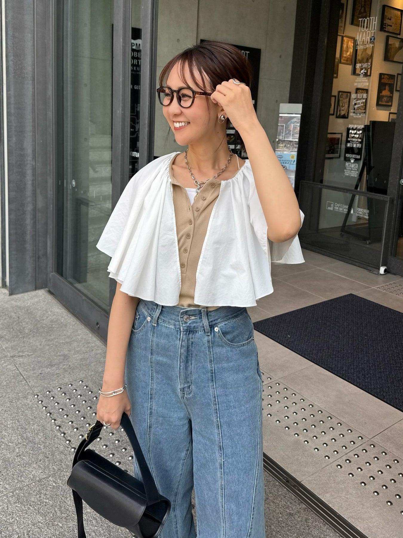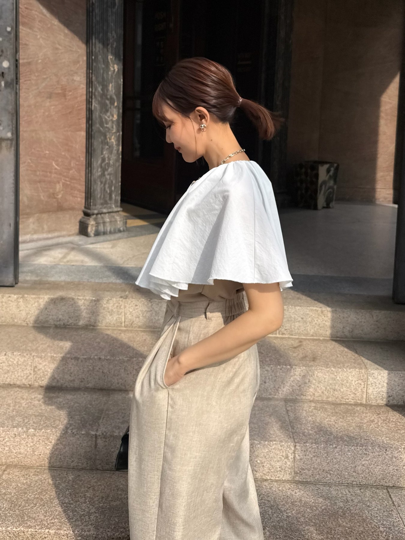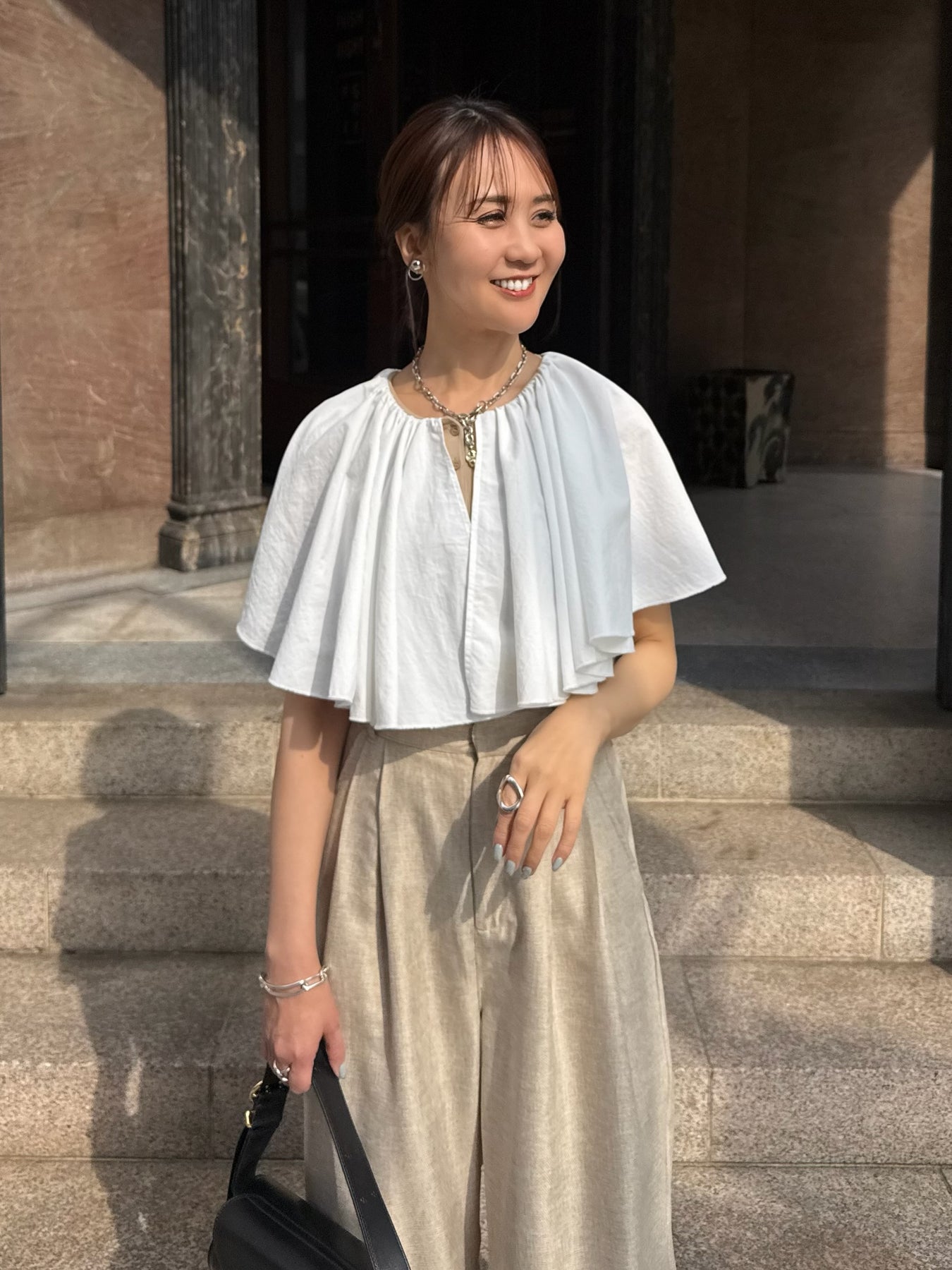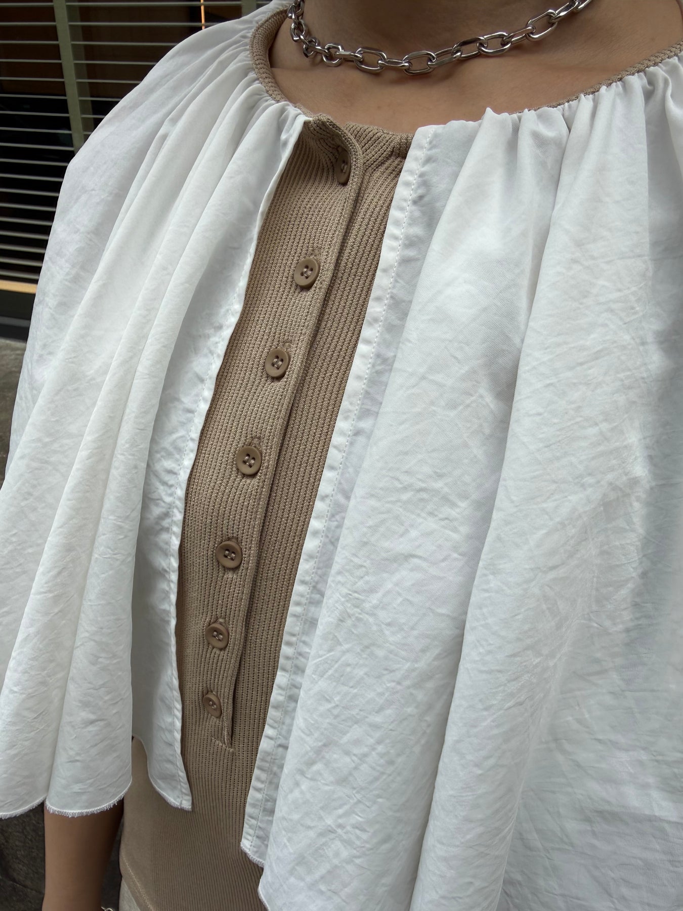 ケープ風のデザインが印象的なトップス。動くたびにふんわりと揺れるシルエットが、シンプルなスタイリングに自然な立体感をプラスします。甘くなりすぎないデザインなので、デニムなどのカジュアルアイテムとも相性が良く、日常使いしやすいバランスに仕上げています。内側はノースリーブのリブ仕様になっており、伸縮性がありながらもすっきりとしたシルエットで着用いただけます。気になる腕まわりをカバーしながら、すっきり見えも叶える一着です。