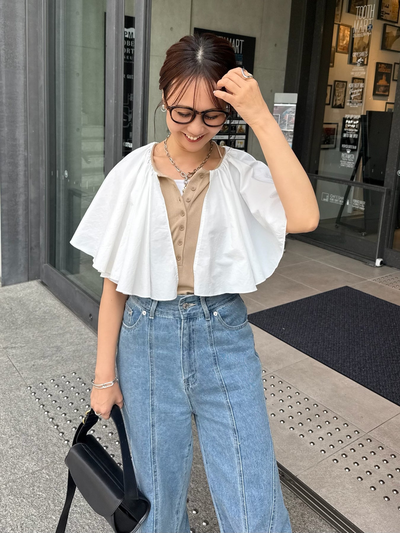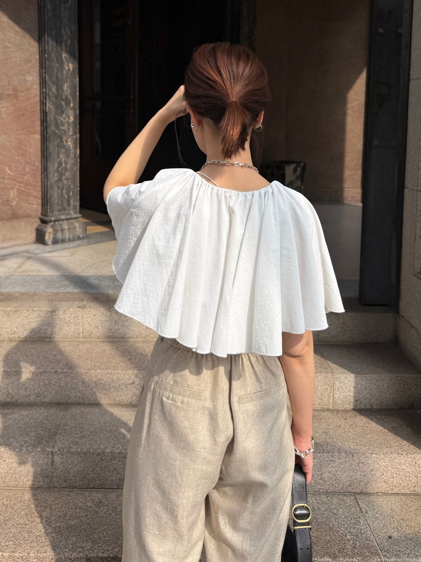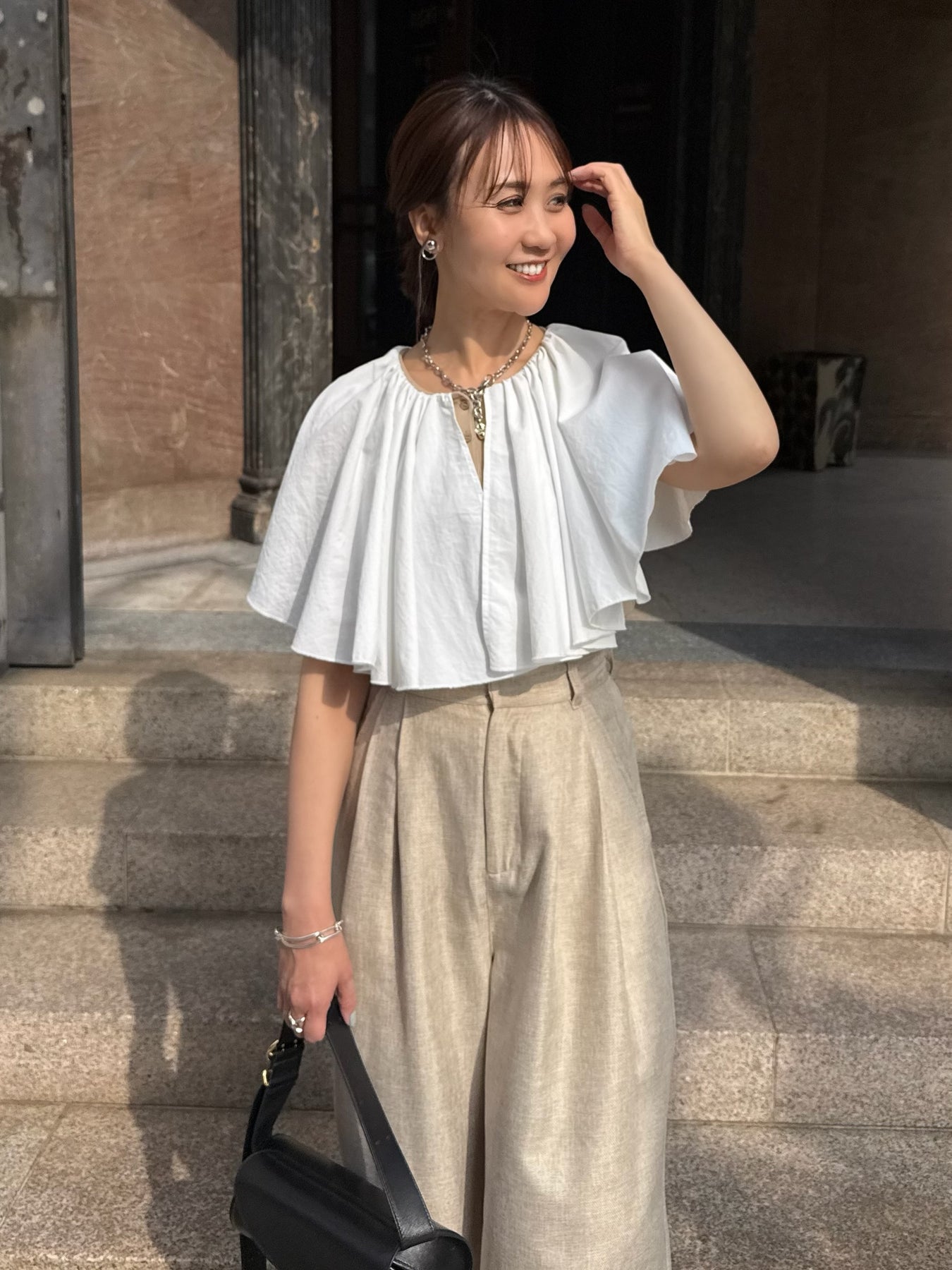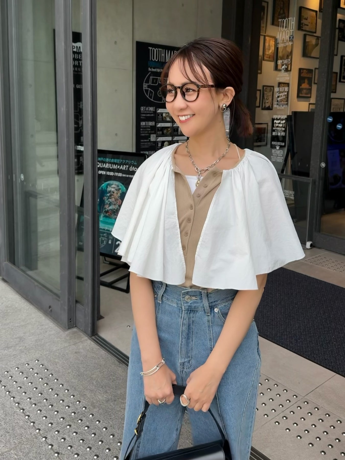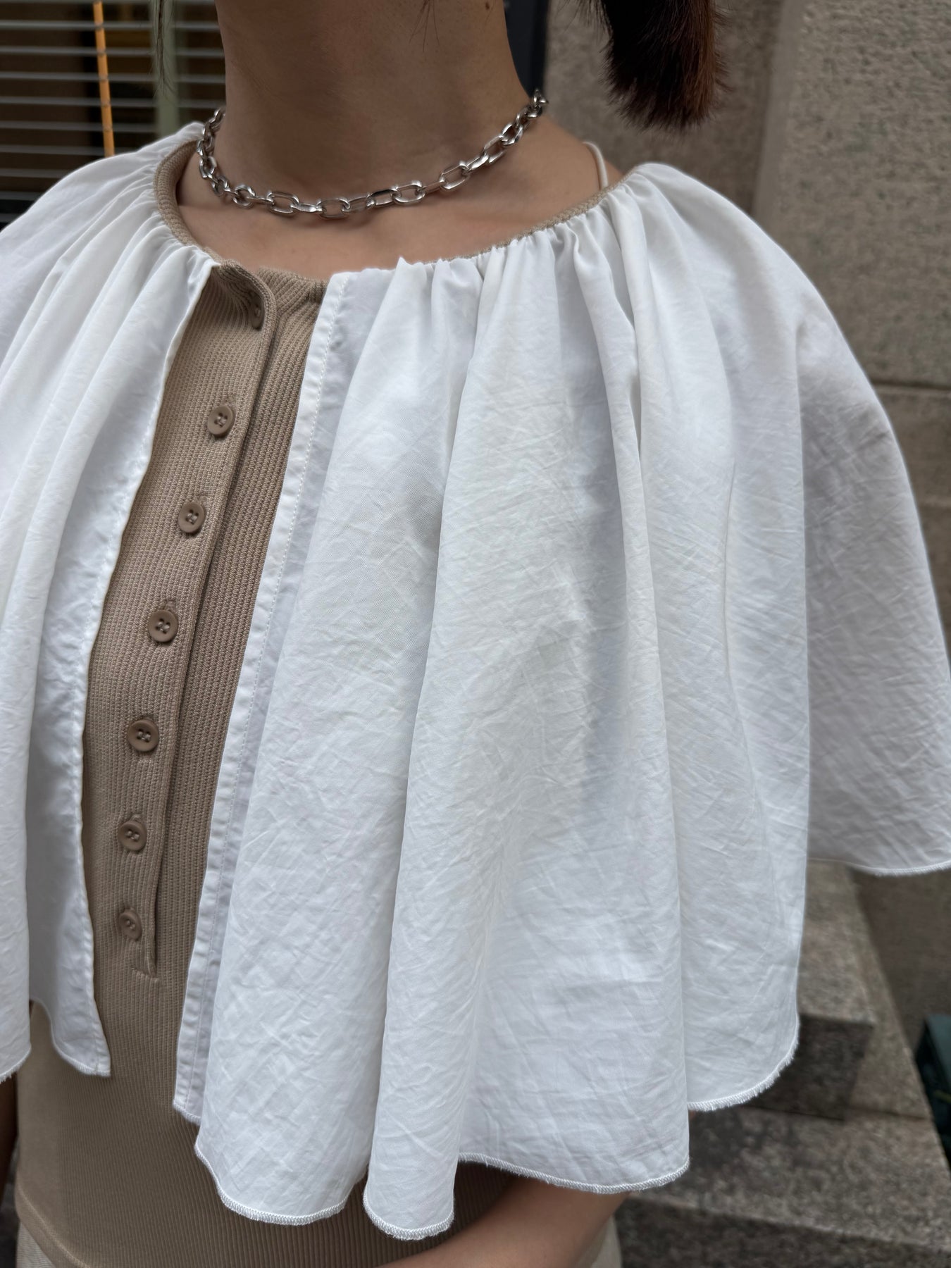 ケープ風のデザインが印象的なトップス。動くたびにふんわりと揺れるシルエットが、シンプルなスタイリングに自然な立体感をプラスします。甘くなりすぎないデザインなので、デニムなどのカジュアルアイテムとも相性が良く、日常使いしやすいバランスに仕上げています。内側はノースリーブのリブ仕様になっており、伸縮性がありながらもすっきりとしたシルエットで着用いただけます。気になる腕まわりをカバーしながら、すっきり見えも叶える一着です。