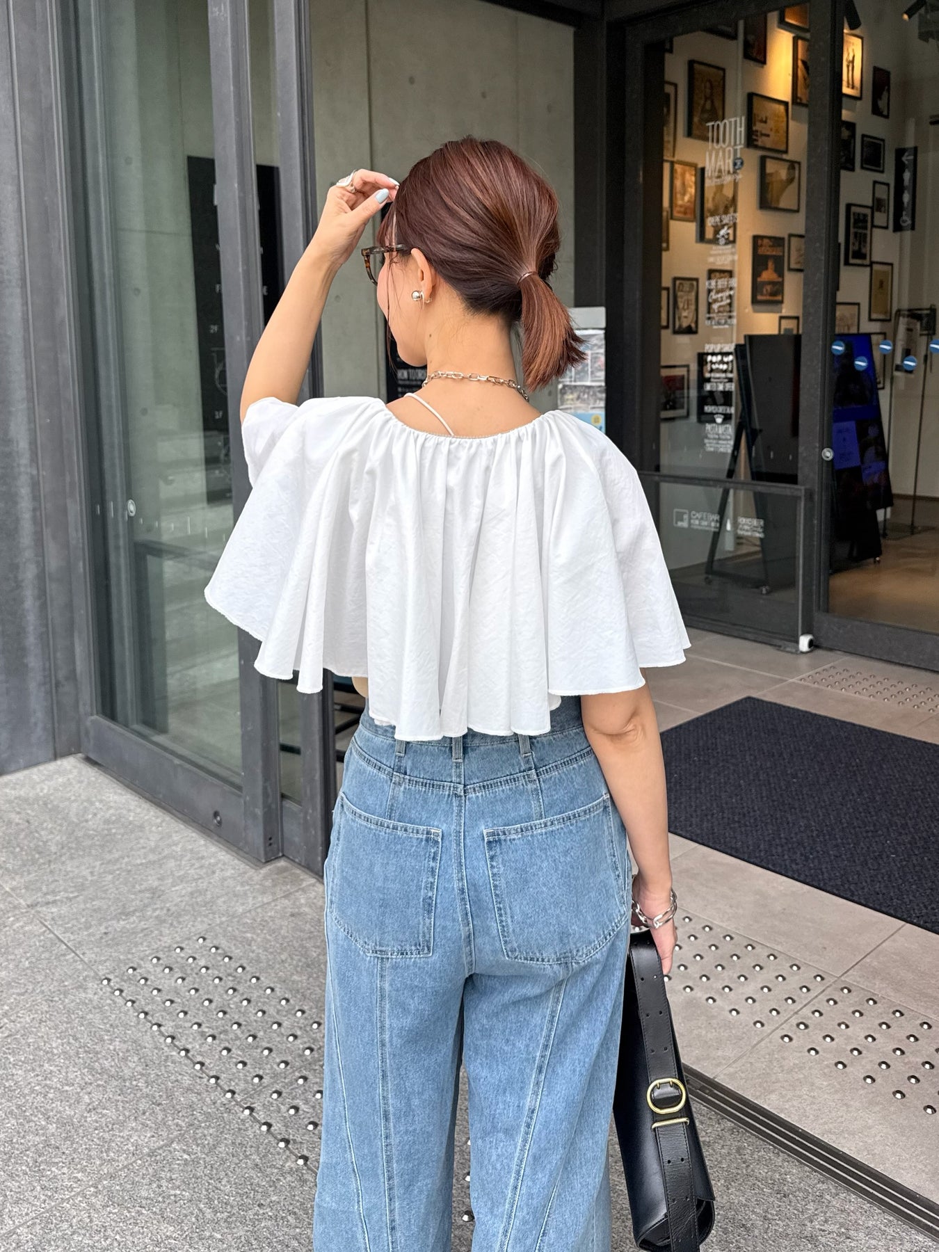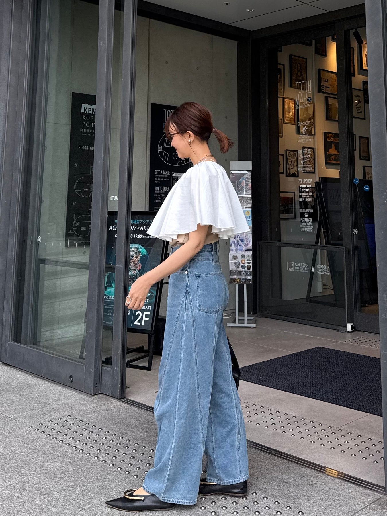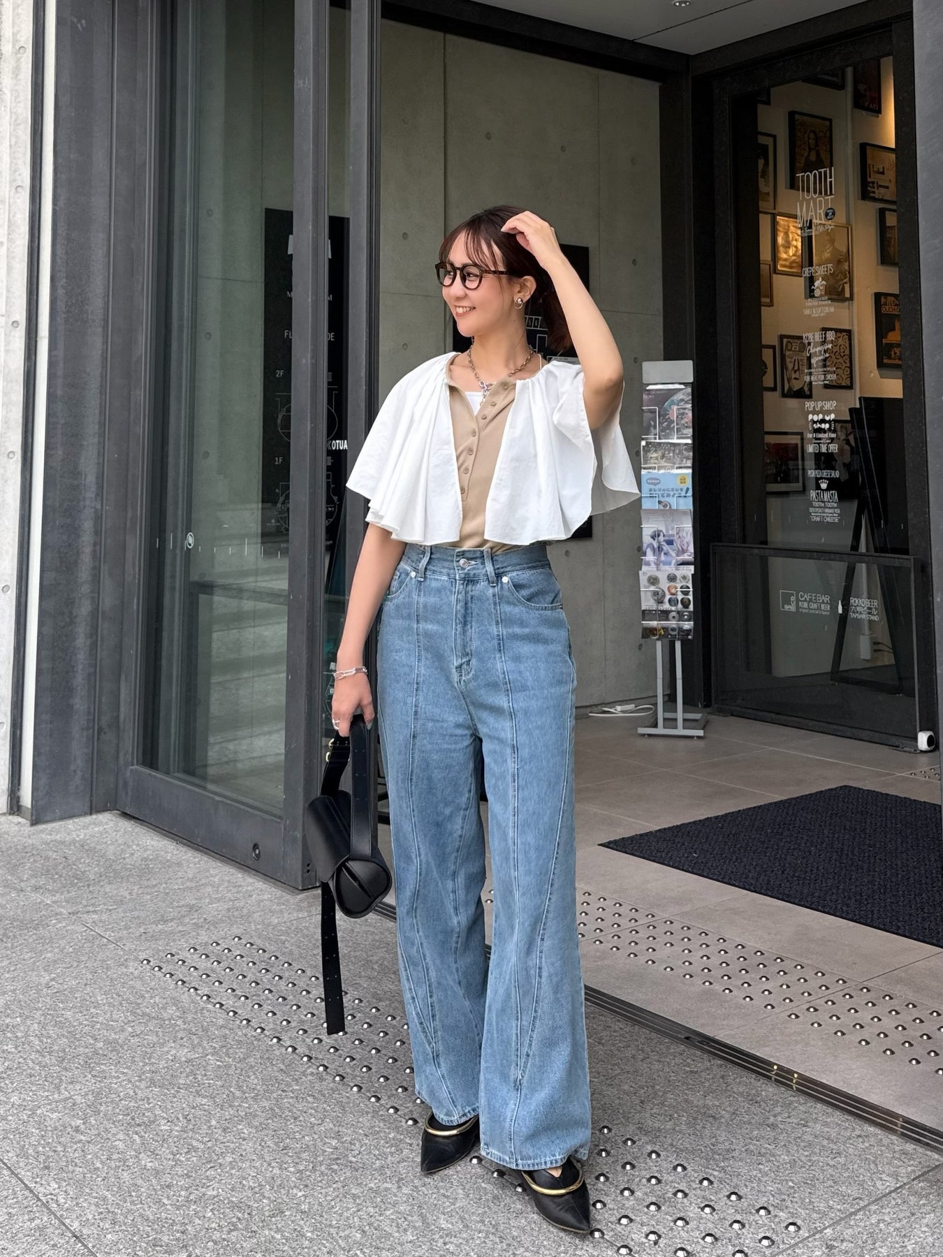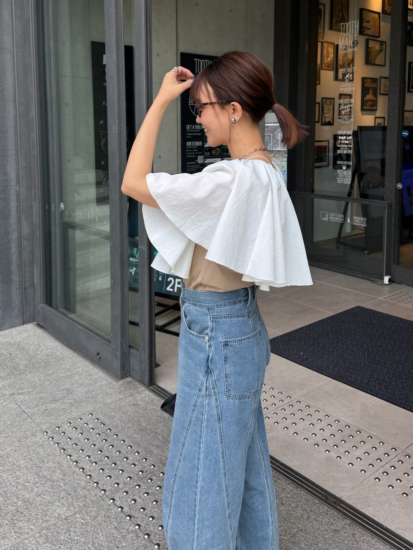 ケープ風のデザインが印象的なトップス。動くたびにふんわりと揺れるシルエットが、シンプルなスタイリングに自然な立体感をプラスします。甘くなりすぎないデザインなので、デニムなどのカジュアルアイテムとも相性が良く、日常使いしやすいバランスに仕上げています。内側はノースリーブのリブ仕様になっており、伸縮性がありながらもすっきりとしたシルエットで着用いただけます。気になる腕まわりをカバーしながら、すっきり見えも叶える一着です。