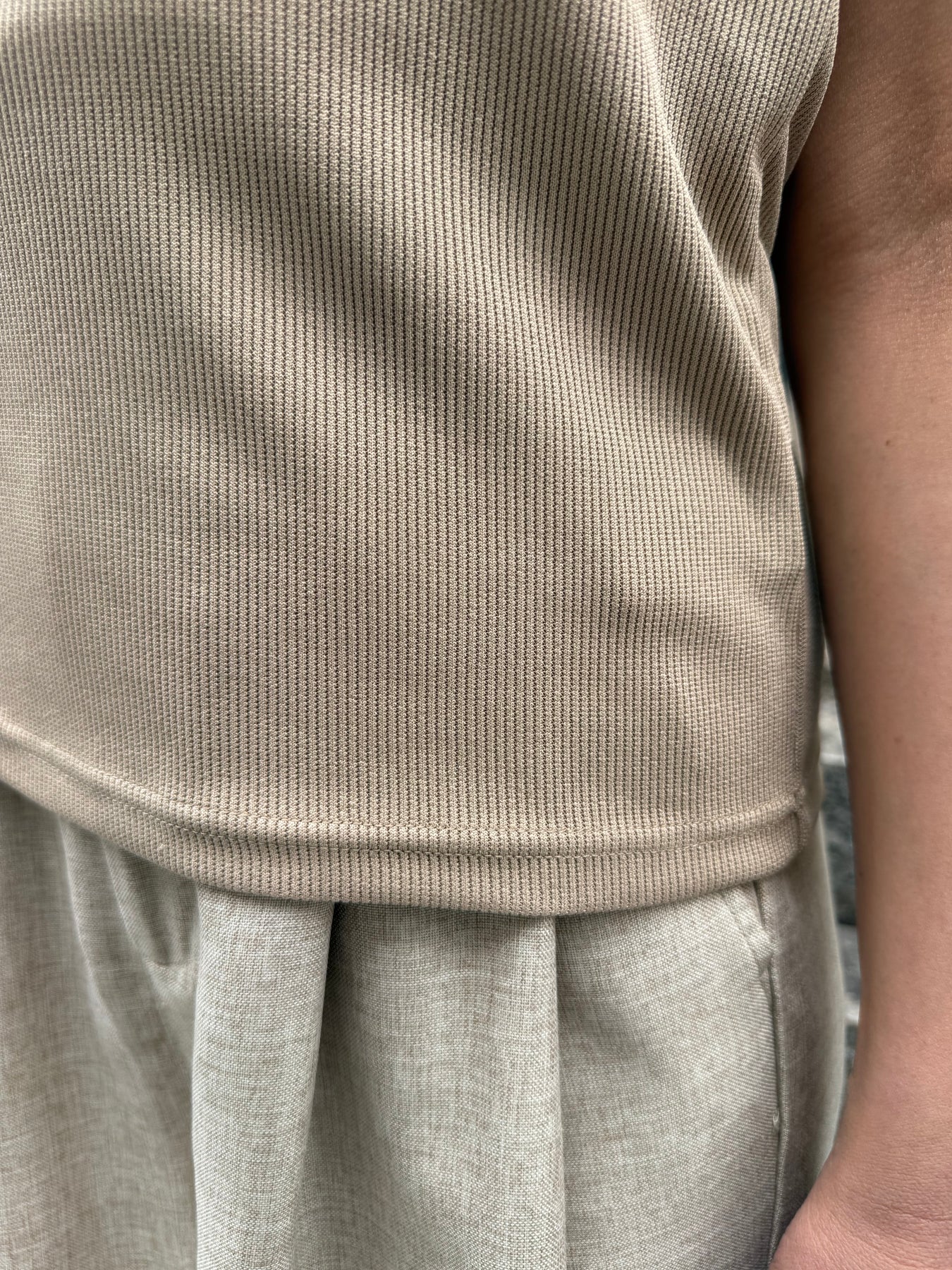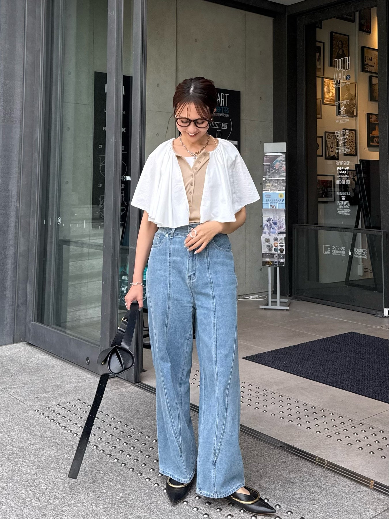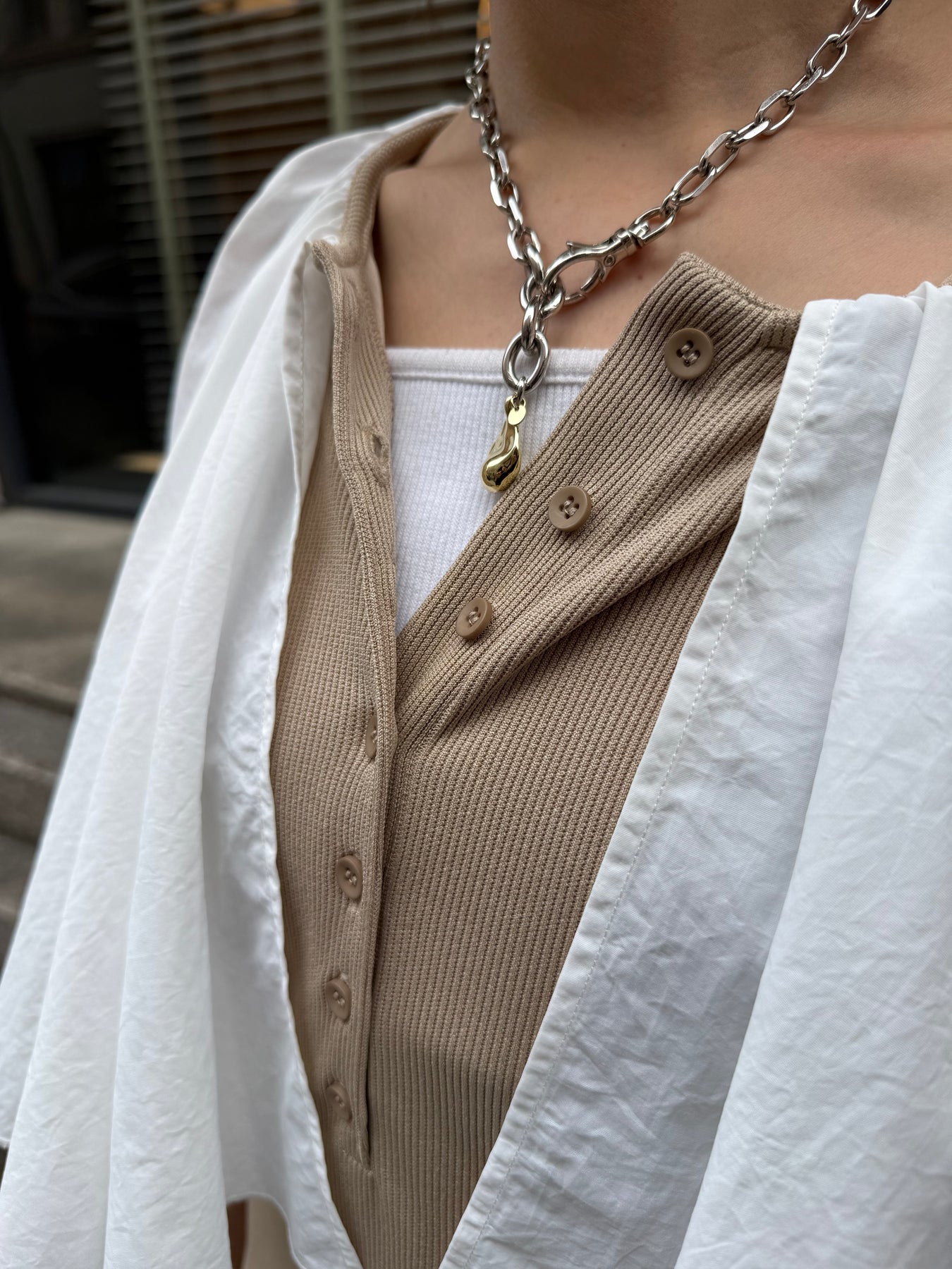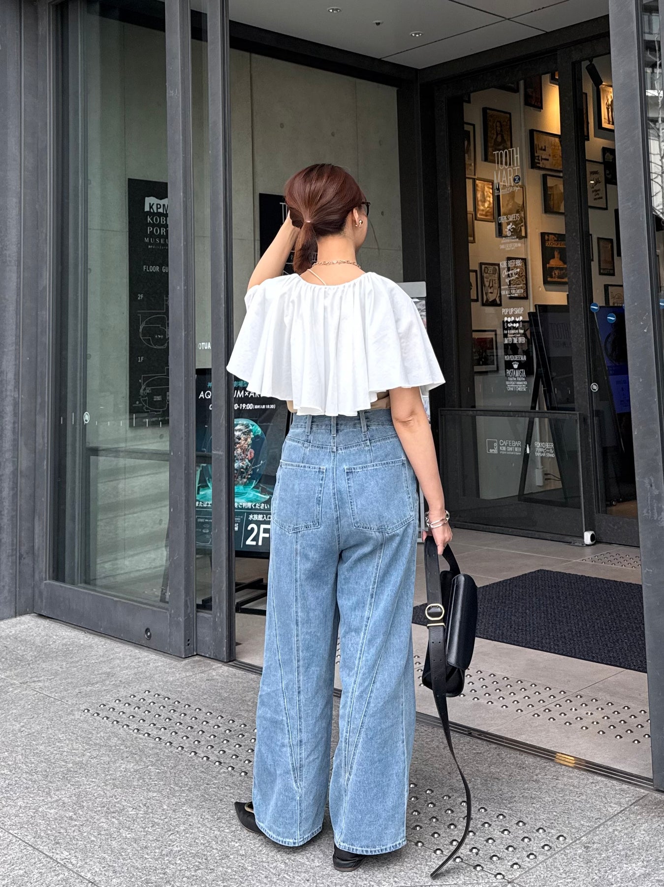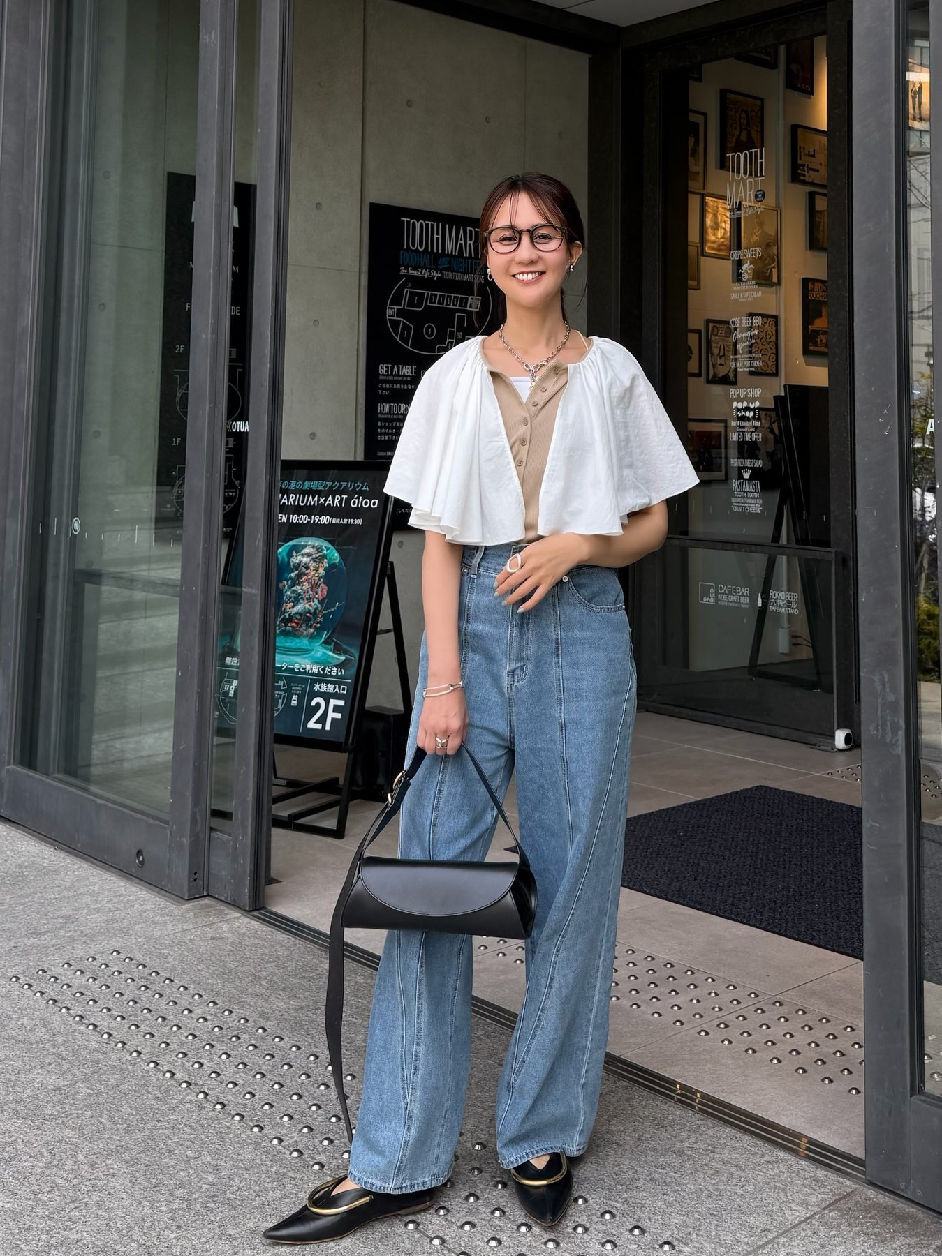 ケープ風のデザインが印象的なトップス。動くたびにふんわりと揺れるシルエットが、シンプルなスタイリングに自然な立体感をプラスします。甘くなりすぎないデザインなので、デニムなどのカジュアルアイテムとも相性が良く、日常使いしやすいバランスに仕上げています。内側はノースリーブのリブ仕様になっており、伸縮性がありながらもすっきりとしたシルエットで着用いただけます。気になる腕まわりをカバーしながら、すっきり見えも叶える一着です。